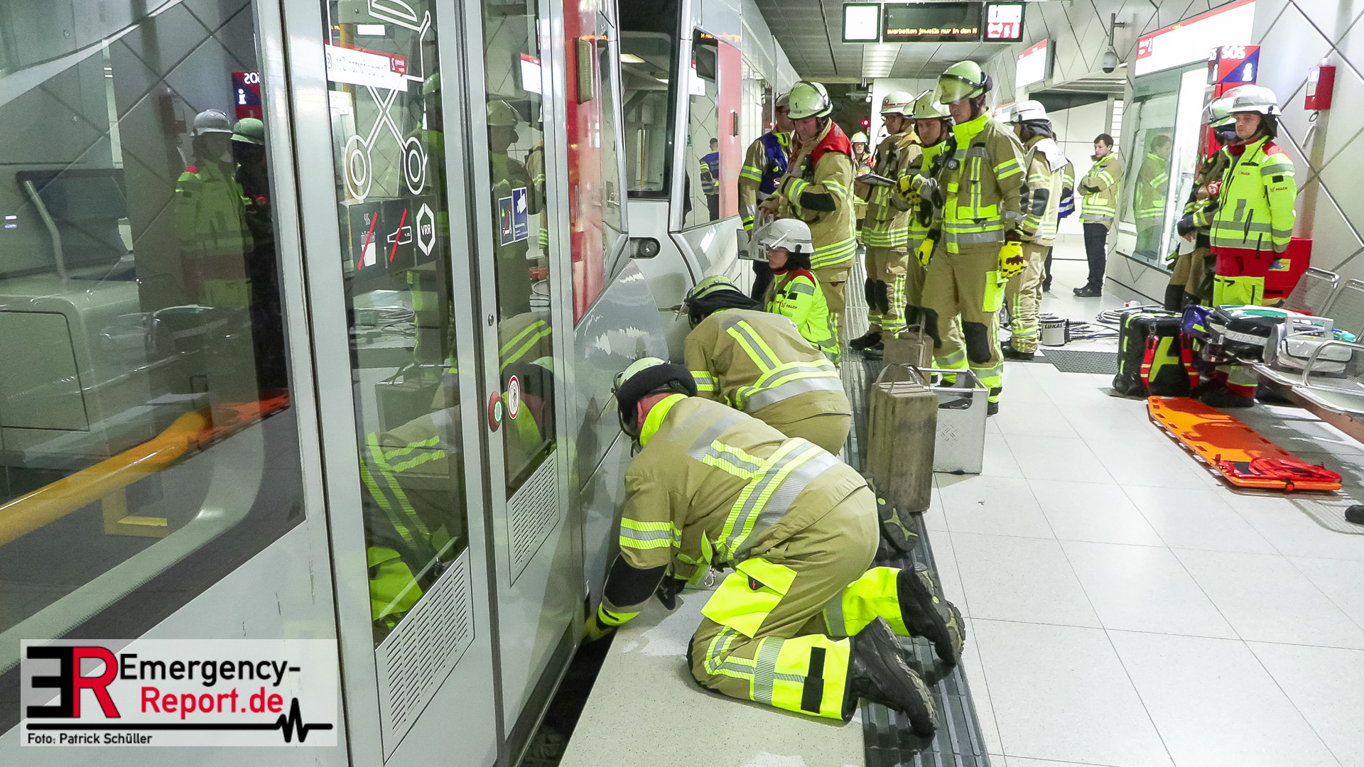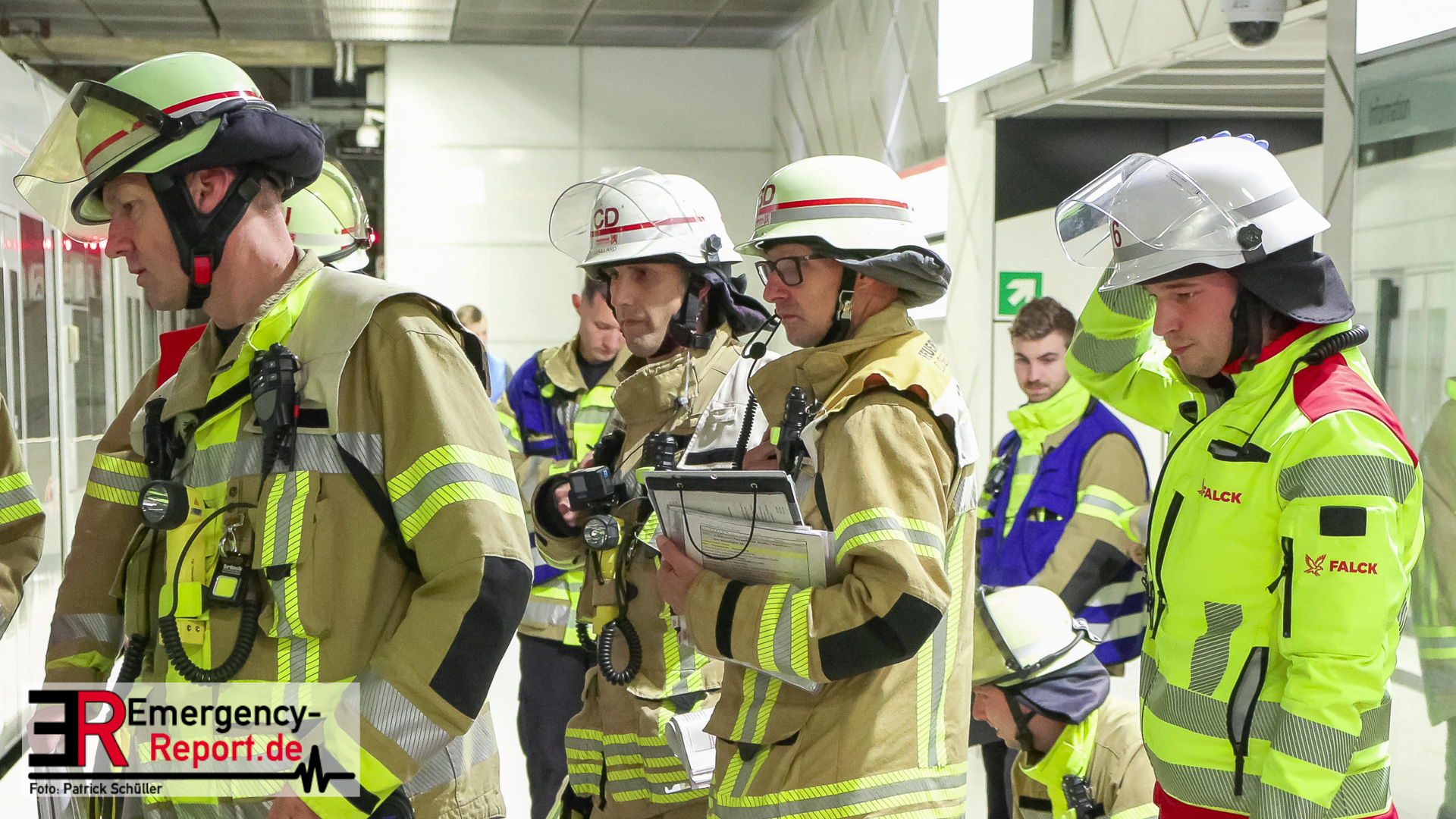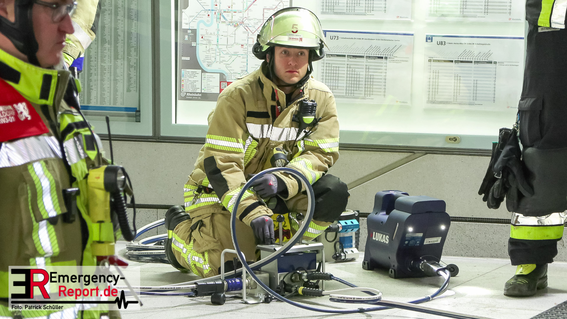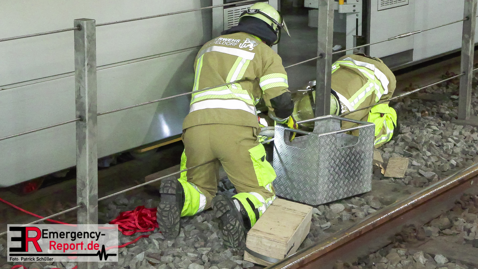 Die Übung begann mit der Alarmierung der Einsatzkräfte: Der Fahrer der U-Bahn bemerkte beim Einfahren den Personenschaden und alarmierte über die Leitstelle der Rheinbahn die Feuerwehr. Nur wenige Augenblicke später trafen die ersten Einsatzkräfte am Treppenabgang des Bahnhofs ein. Sofort begaben sich die ersten Trupps auf das gemeldete Gleis, erkundeten die Lage und verschafften sich einen Überblick. Zeitgleich wurde das benötigte Material zur Befreiung der Person bereitgestellt. Da die Einsatzstelle nicht mit Fahrzeugen erreichbar ist, wurde der Transport des Materials durch die Einsatzkräfte vorbereitet.