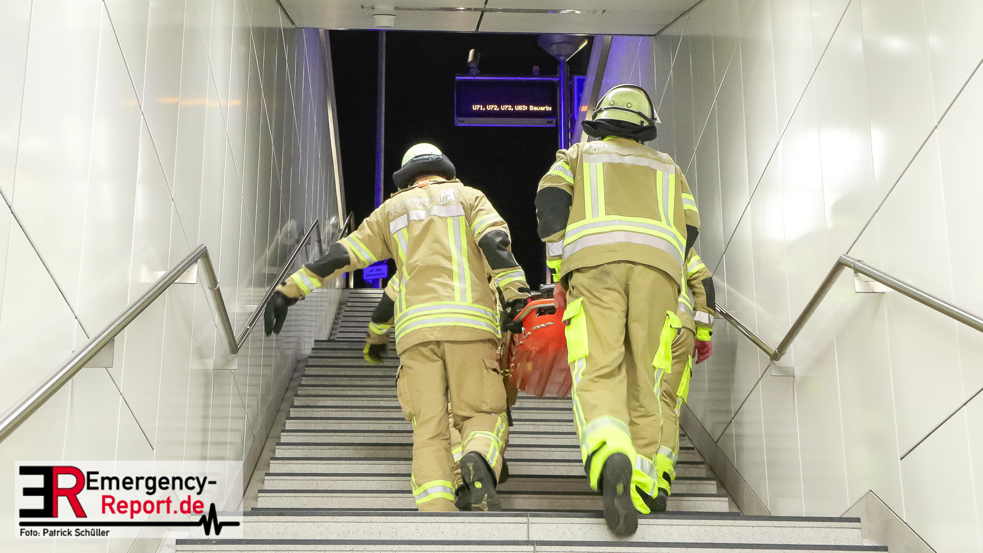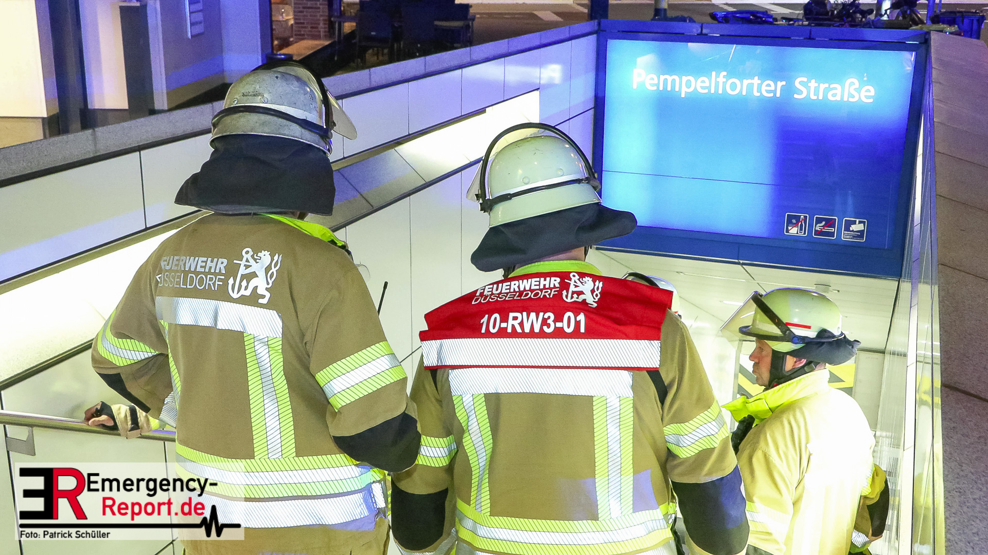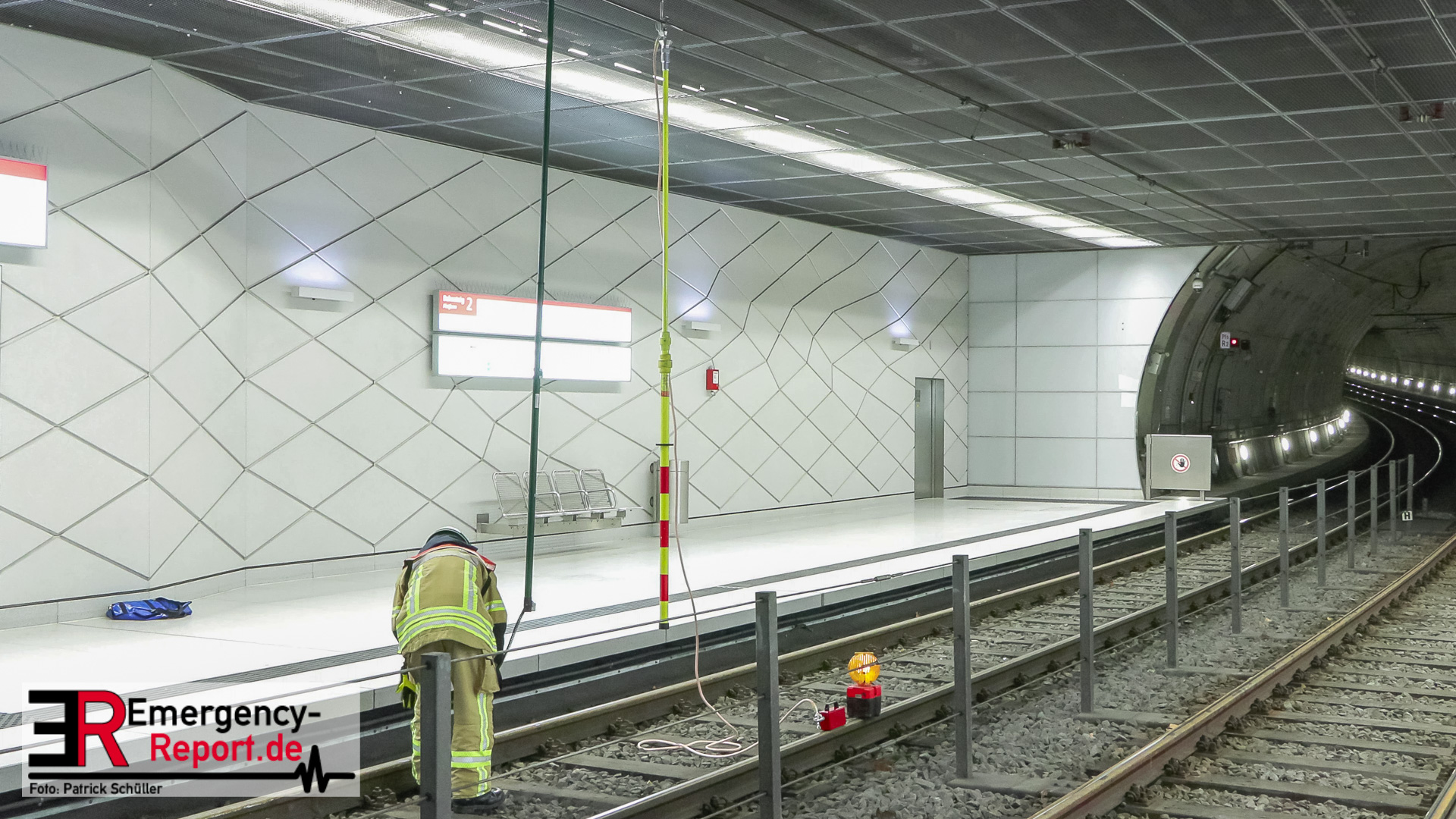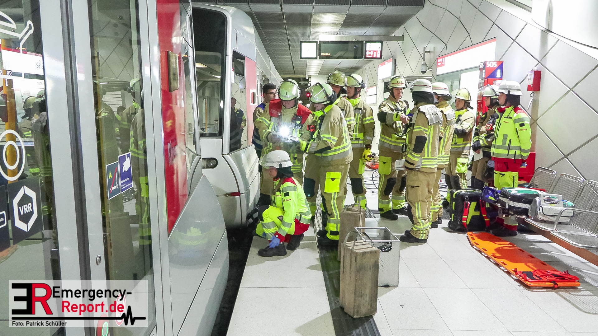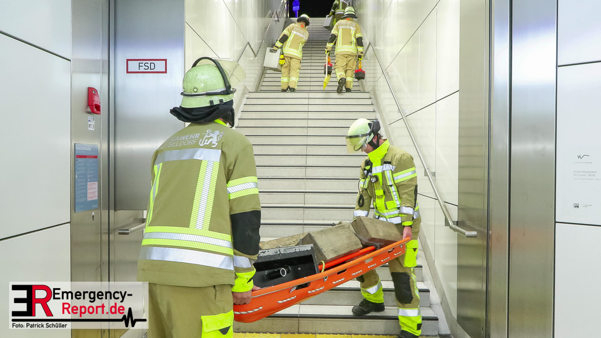 Die Übung begann mit der Alarmierung der Einsatzkräfte: Der Fahrer der U-Bahn bemerkte beim Einfahren den Personenschaden und alarmierte über die Leitstelle der Rheinbahn die Feuerwehr. Nur wenige Augenblicke später trafen die ersten Einsatzkräfte am Treppenabgang des Bahnhofs ein. Sofort begaben sich die ersten Trupps auf das gemeldete Gleis, erkundeten die Lage und verschafften sich einen Überblick. Zeitgleich wurde das benötigte Material zur Befreiung der Person bereitgestellt. Da die Einsatzstelle nicht mit Fahrzeugen erreichbar ist, wurde der Transport des Materials durch die Einsatzkräfte vorbereitet.