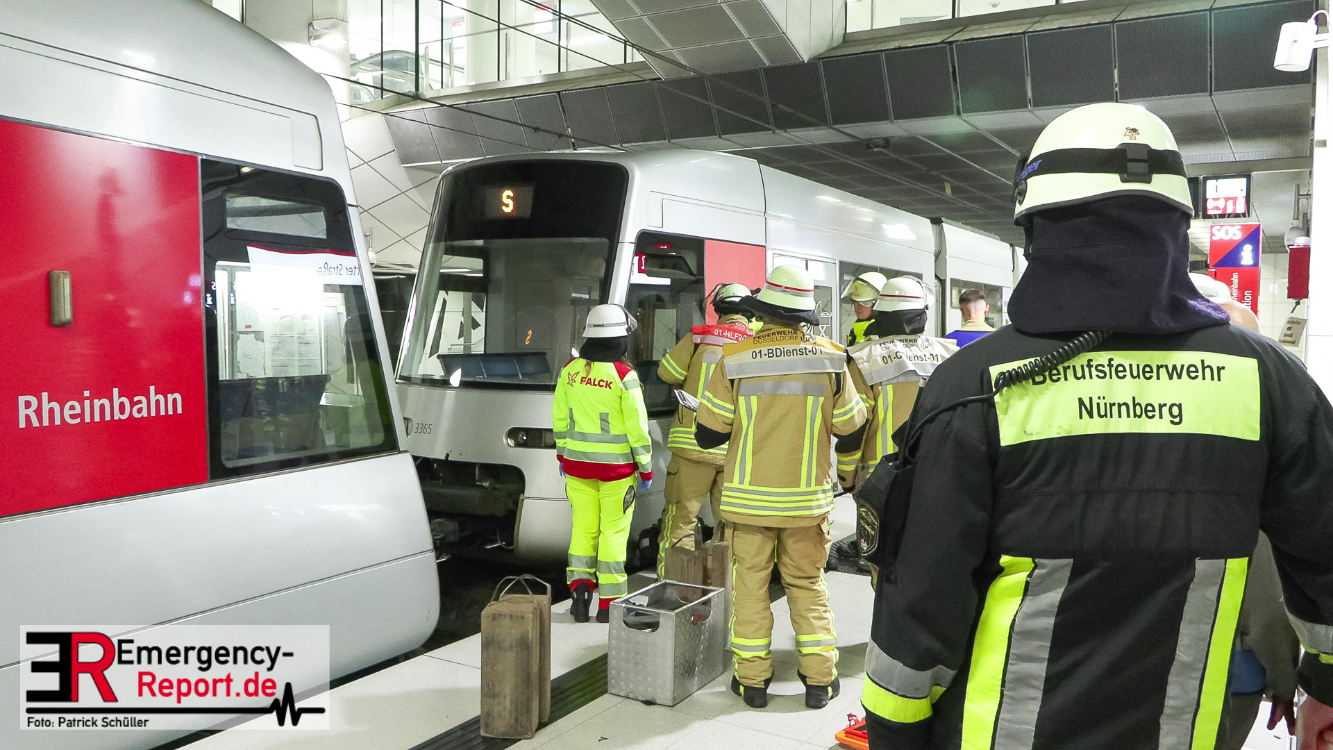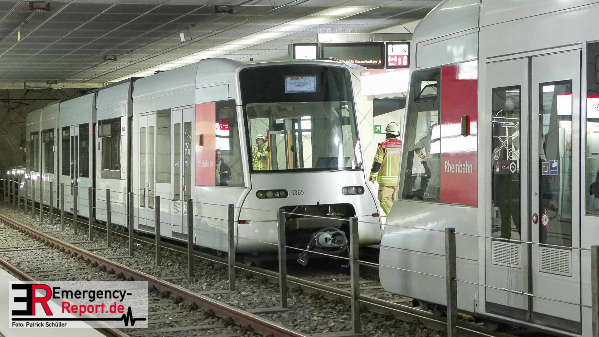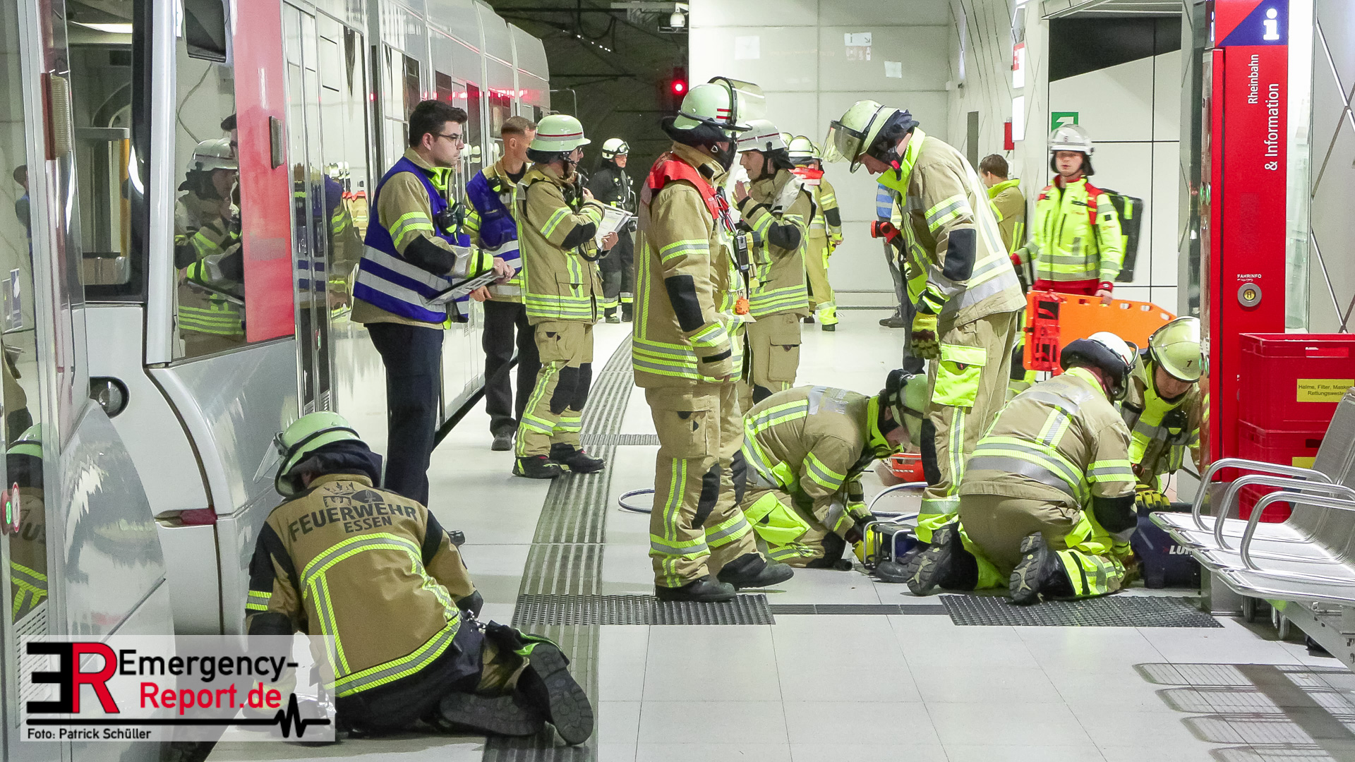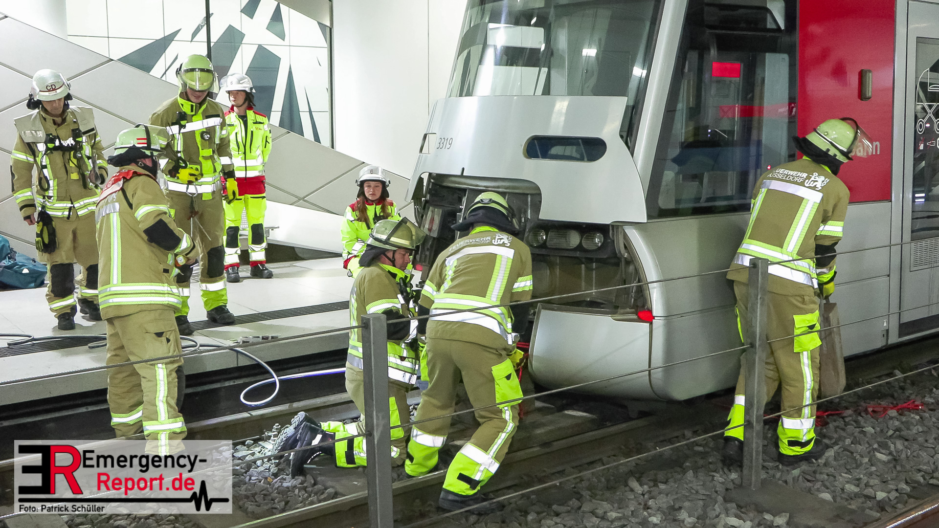 Die Übung begann mit der Alarmierung der Einsatzkräfte: Der Fahrer der U-Bahn bemerkte beim Einfahren den Personenschaden und alarmierte über die Leitstelle der Rheinbahn die Feuerwehr. Nur wenige Augenblicke später trafen die ersten Einsatzkräfte am Treppenabgang des Bahnhofs ein. Sofort begaben sich die ersten Trupps auf das gemeldete Gleis, erkundeten die Lage und verschafften sich einen Überblick. Zeitgleich wurde das benötigte Material zur Befreiung der Person bereitgestellt. Da die Einsatzstelle nicht mit Fahrzeugen erreichbar ist, wurde der Transport des Materials durch die Einsatzkräfte vorbereitet.