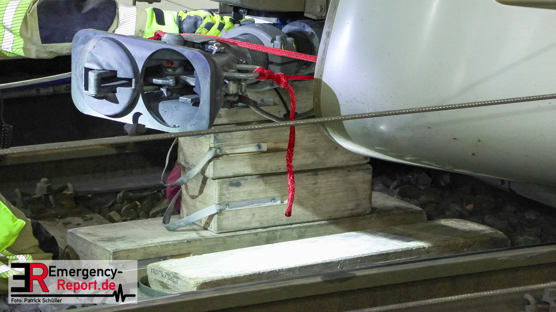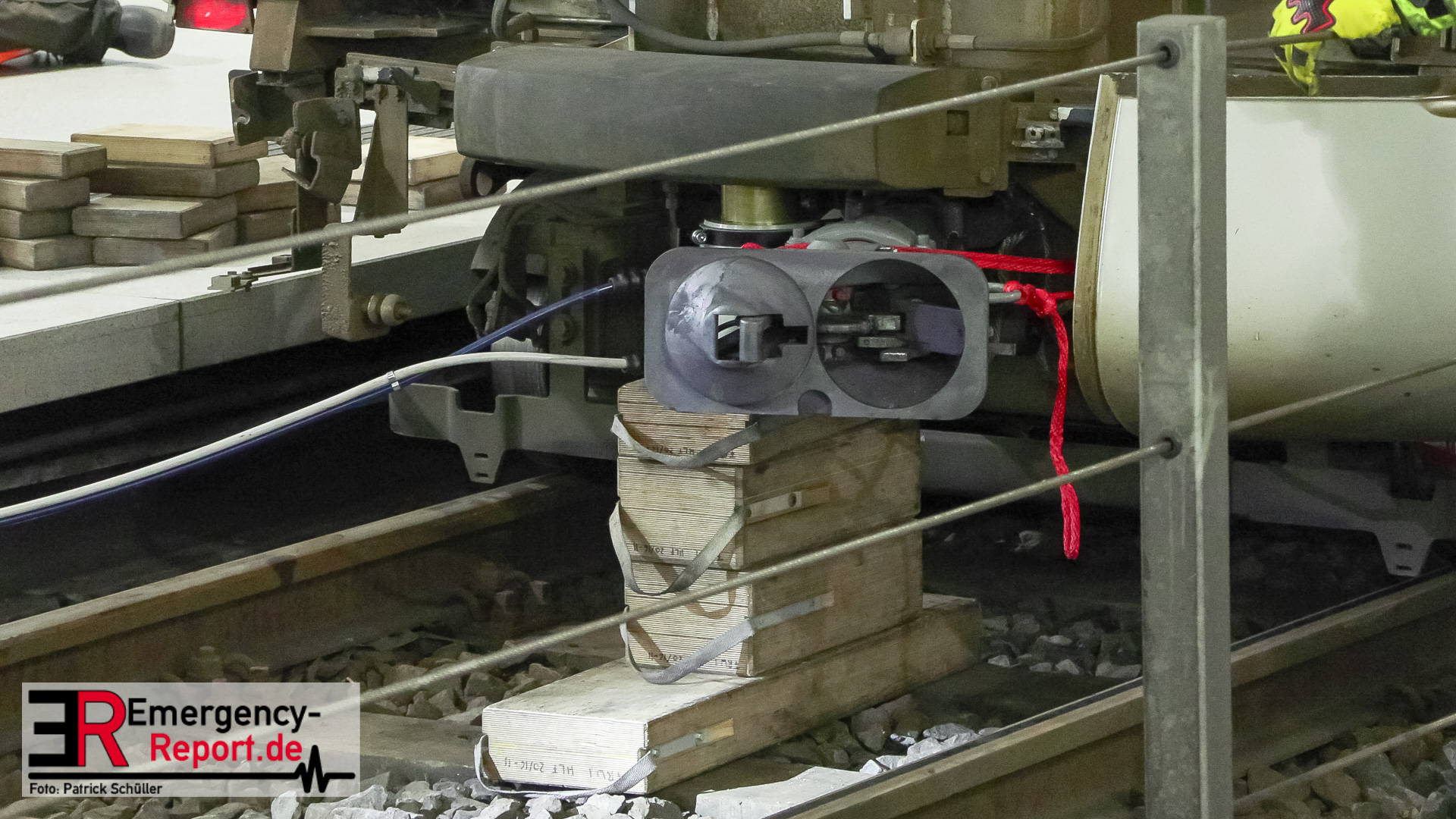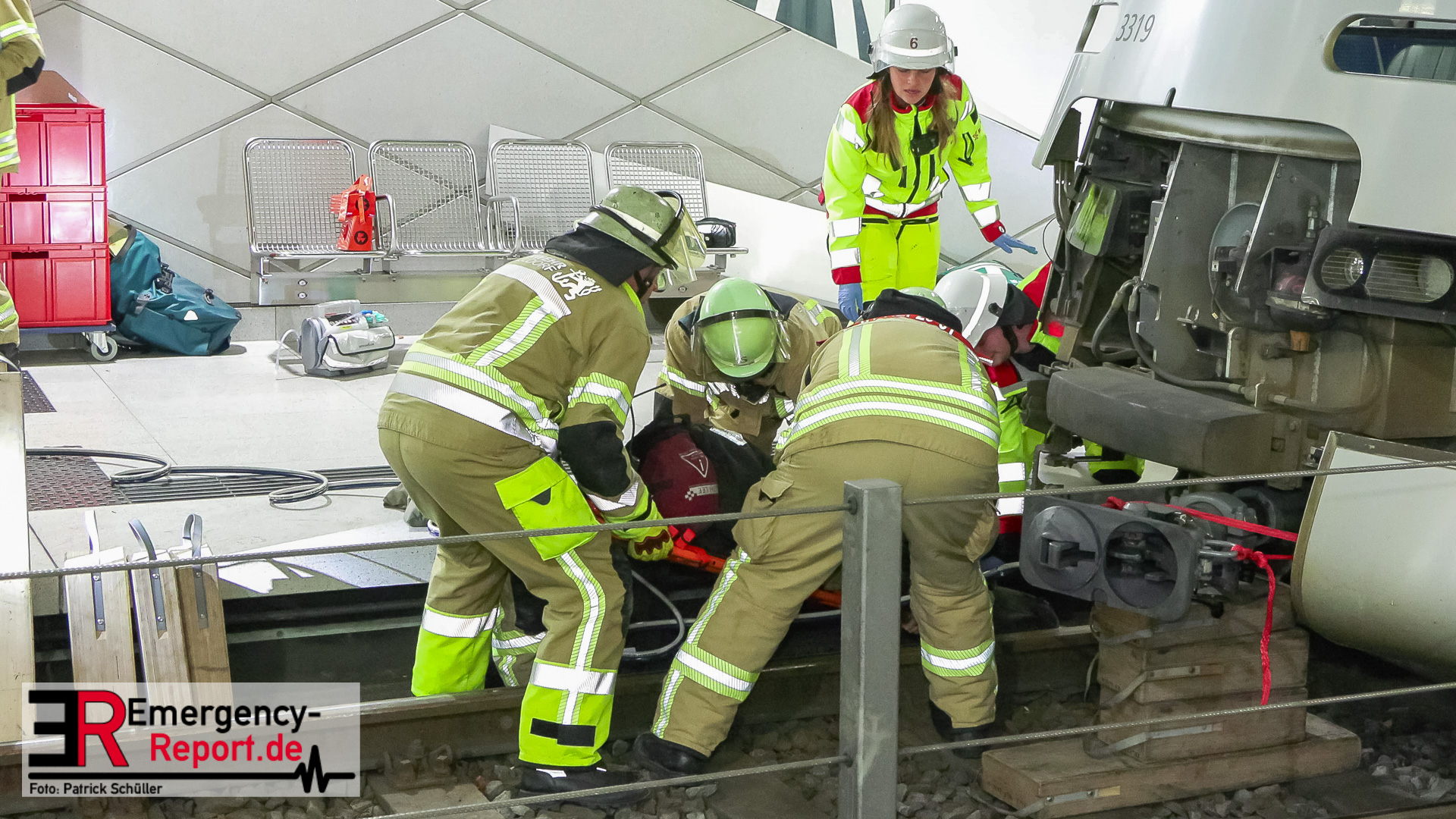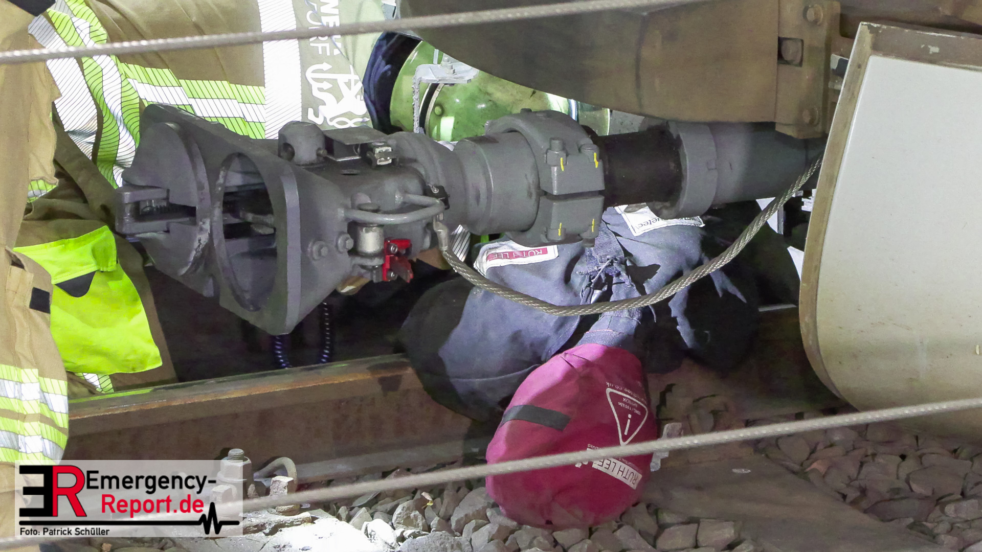 Im Rahmen der Erkundung konnte der Einsatzleiter das gemeldete Bild bestätigen: Eine Person war unter dem zweiten Wagen im Bereich der Kupplung eingeklemmt. Die Feuerwehr übernahm umgehend die Erstversorgung der verletzten Person und brachte das Material zum Gleis. Parallel dazu stellte der Rettungsdienst sein Equipment für die anschließende medizinische Versorgung bereit und übernahm die Betreuung des Fahrers.