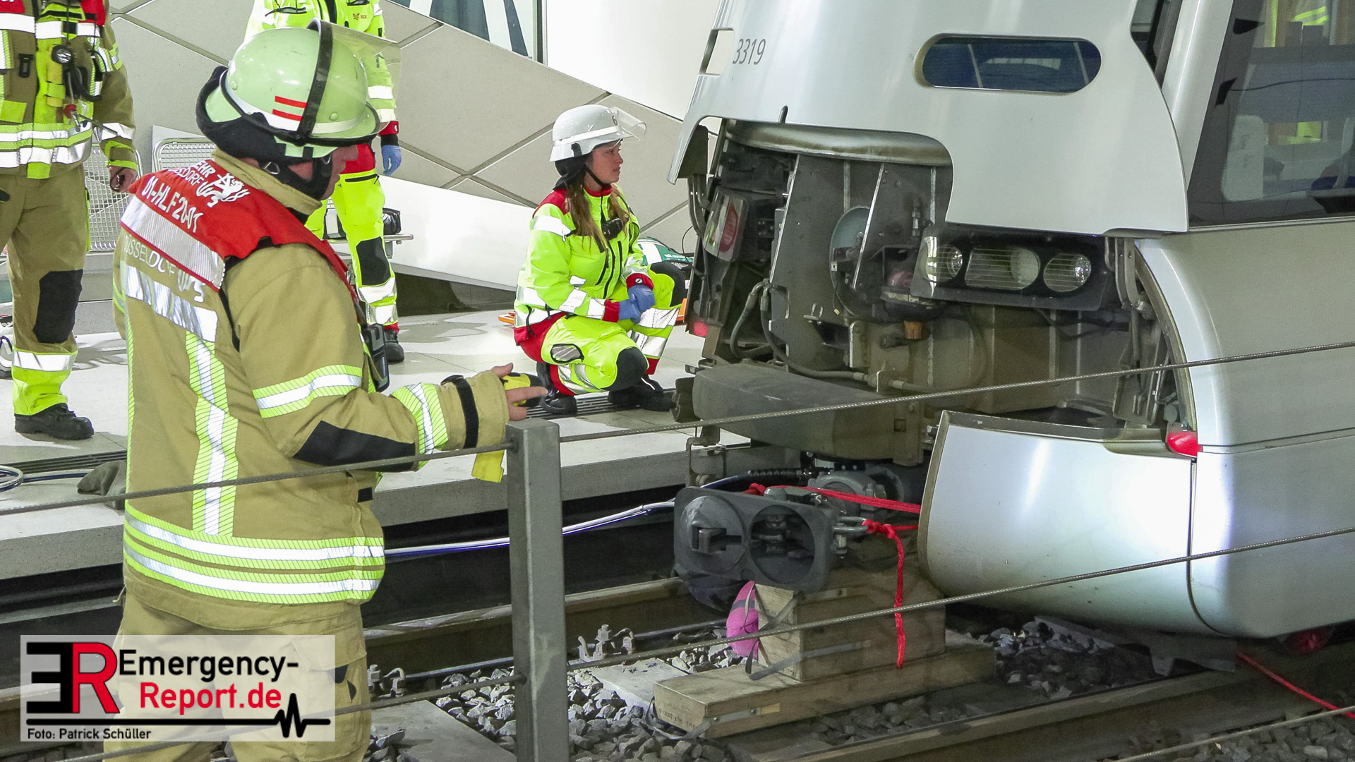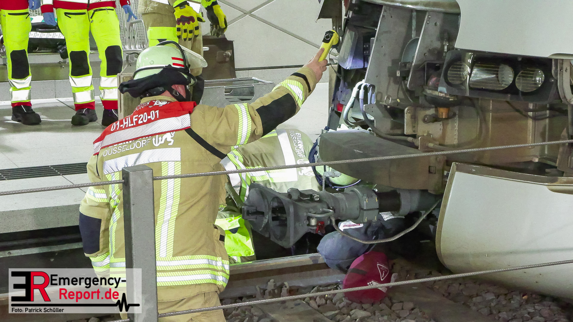 Gemeinsam üben für den Ernstfall: Feuerwehr Düsseldorf und Rheinbahn proben in acht Nächten das Vorgehen bei Unfällen in der U-Bahn. Für die technische Rettung wurde eine eingeklemmte Person unter einer Bahn simuliert, die befreit werden musste.