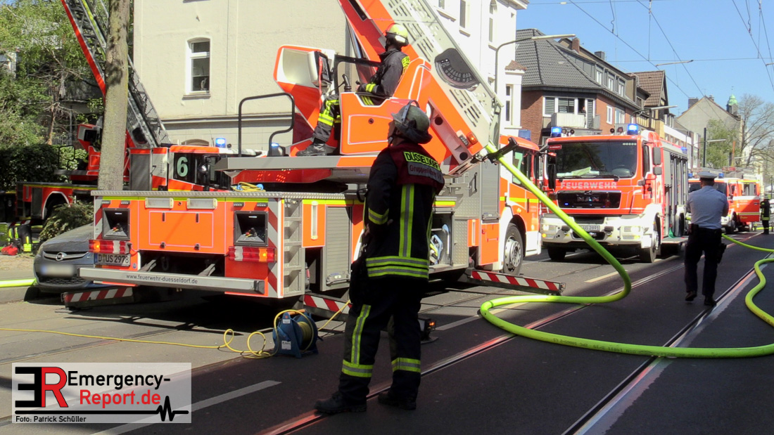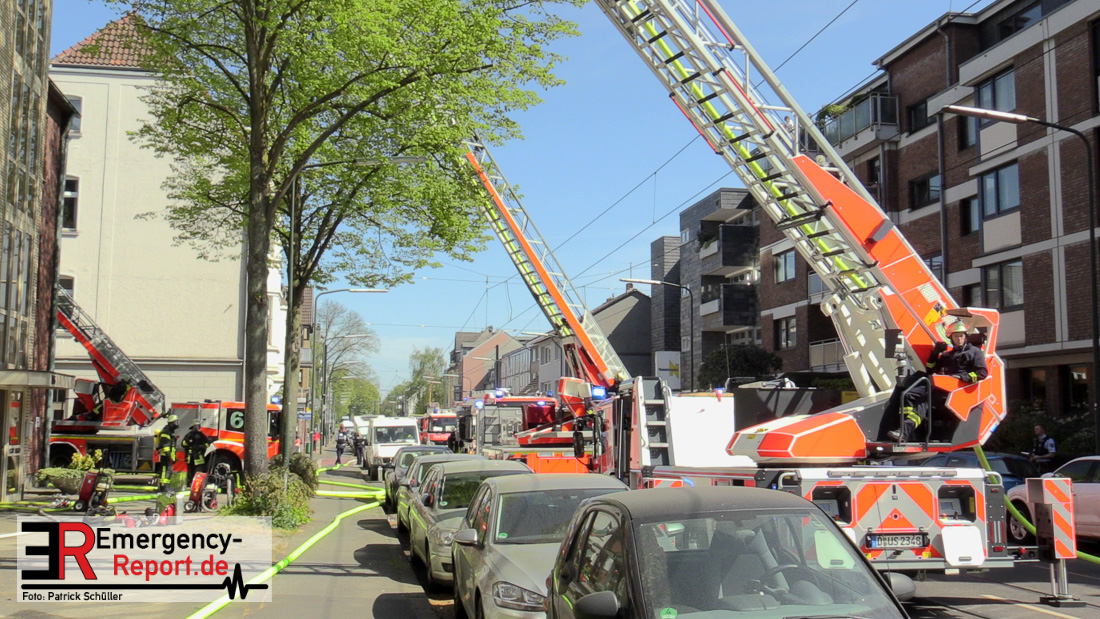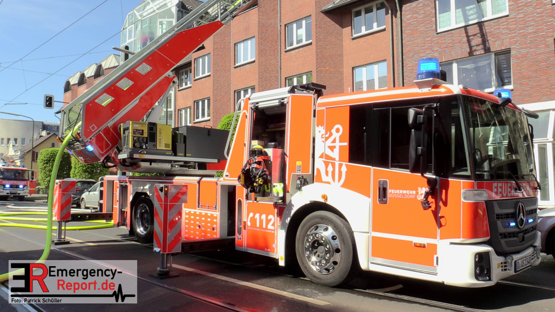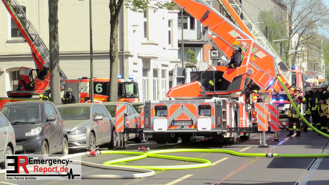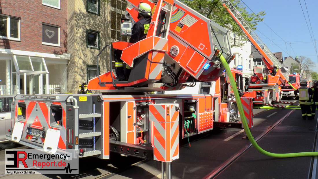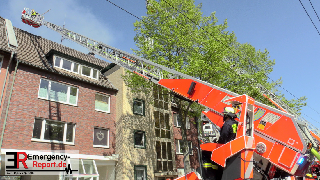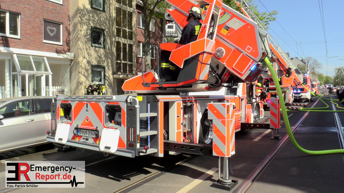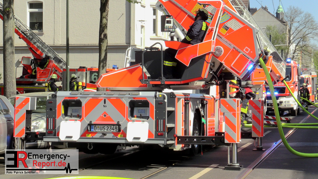 Gegen 13:37 Uhr gingen bei der Leitstelle der Feuerwehr Düsseldorf mehrere Anrufe ein. Die Anrufer meldeten eine starke Rauchentwicklung, im Bereich des Daches eines Mehrfamilienhauses. Umgehend entsandte der Leitstellendisponent Einheiten der Feuerwachen Frankfurter Straße, Werstener Feld, Posener Straße und Hüttenstraße. Schon kurz vor dem Eintreffen an der Einsatzstelle, meldeten die ersten Einheiten eine starke Rauchentwicklung aus dem Dach eines Mehrfamilienhauses. Nachdem die ersten Einheiten die Einsatzstelle erreichten wurden direkt die ersten Löschmaßnahmen vorbereitet. Erfreulicherweise hatten schon alle Bewohner eigenständig das Haus verlassen. 6 betroffene Personen wurden durch den städtischen Rettungsdienst in Augenschein genommen und zum Glück war niemand ernsthaft verletzt. Lediglich eine Person wurde vorsorglich in ein Krankenhaus transportiert. Da die rückwärtige Dachseite betroffen war, gestalteten sich die Löschmaßnahmen anspruchsvoll. Das Dach musste nun von innen geöffnet werden, um die Glutnester zu erreichen und abzulöschen. Trotzdem konnten die eingesetzten Kräfte nach zirka einer Stunde „Feuer in Gewalt“ melden. Die betreffende Wohnung brannte vollständig aus und ist erst einmal nicht mehr bewohnbar. Bei dem Einsatz waren knapp 60 Einsatzkräfte von Feuerwehr und Rettungsdienst im Einsatz. Gegen 17:00 Uhr war der Einsatz für die Feuerwehr beendet. Die Kriminalpolizei hat die Ermittlungen, schon während des Feuerwehreinsatzes, zur Brandursache aufgenommen.