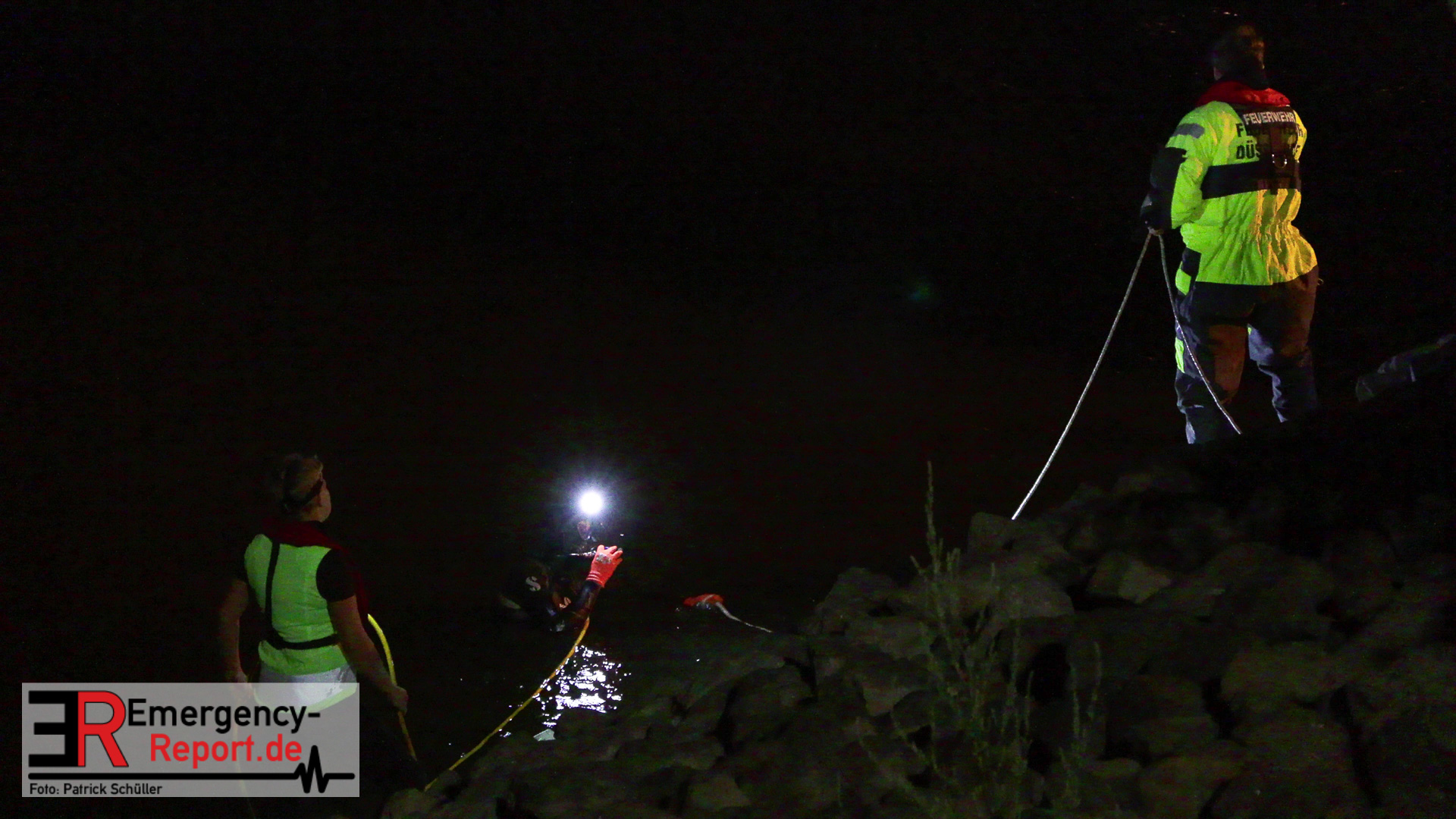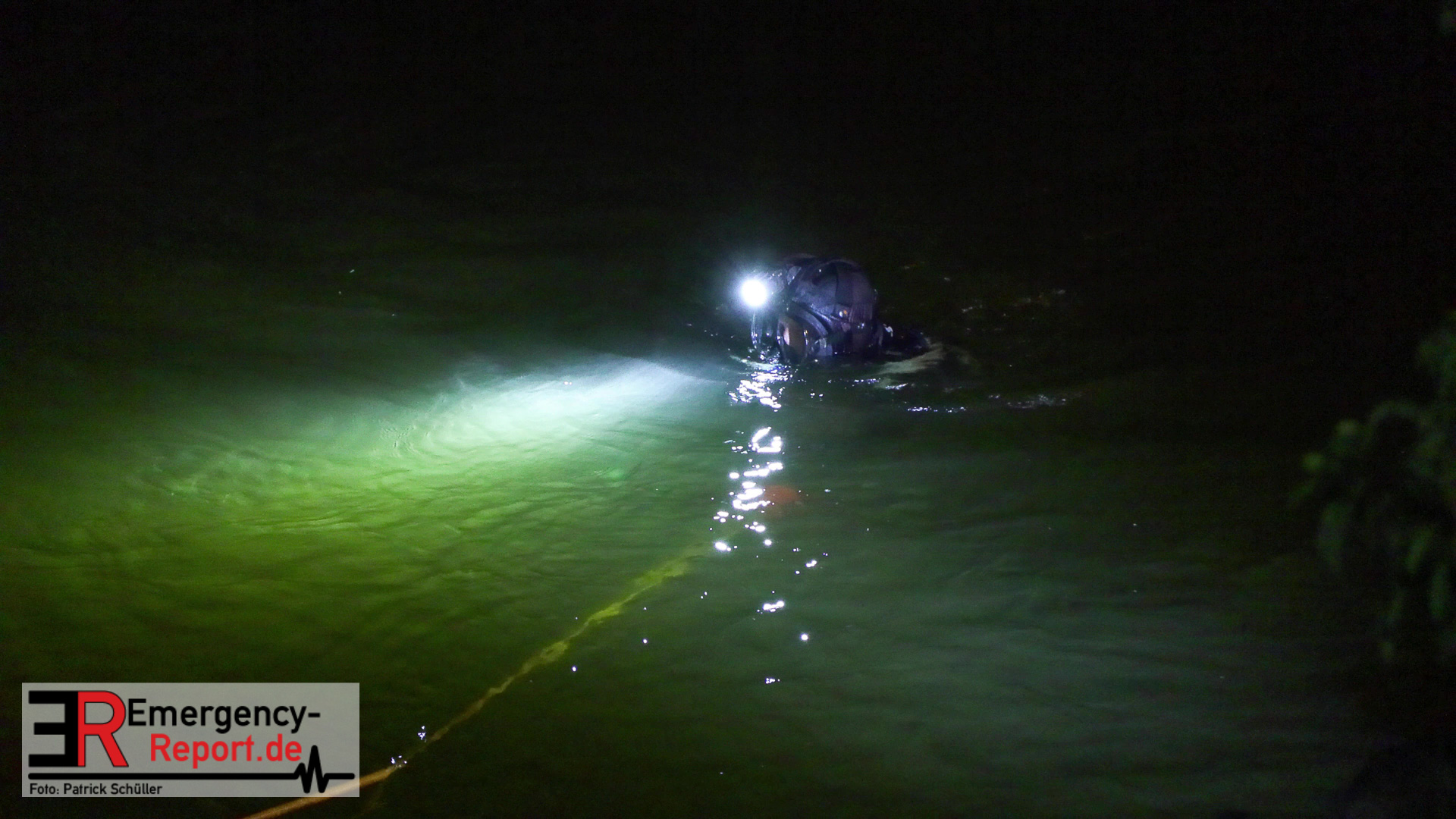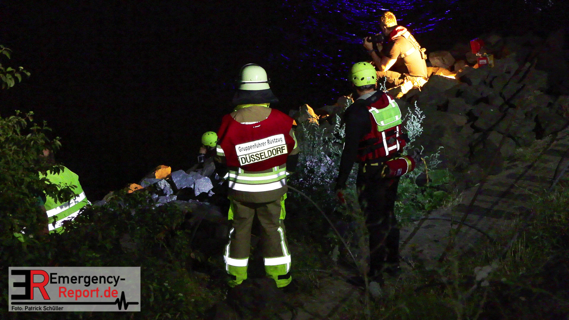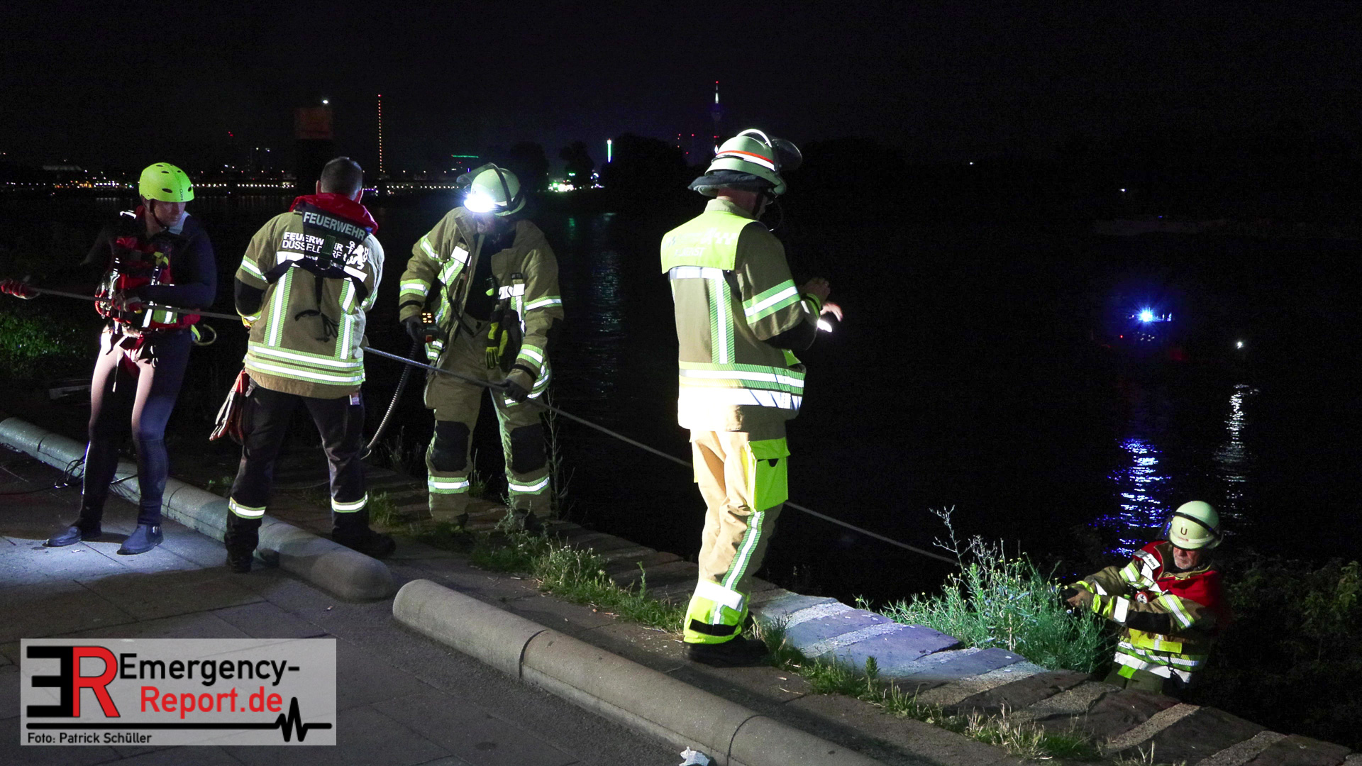 Am späten Freitagabend erreichte ein Notruf die Feuerwehrleitstelle mit der Meldung Person im Rhein. Aufgrund der unklaren Lage wurden von der Leitstelle mehrere Rettungsboote, Taucher, Kräfte des Rettungsdienstes und landgebundene Feuerwehrkräfte entsandt. Vor Ort trafen die Einheiten auf zwei durchnässte Personen. Diese wurden sofort vom Rettungsdienst betreut. Sie waren unverletzt und gaben an, dass sie sich selbst aus einem PKW retten konnten. Das Fahrzeug ist vermutlich bei einem Wendemanöver zu nah an die Rheinböschung geraten und abgerutscht. Bei Eintreffen der Feuerwehr war das Fahrzeug nicht mehr zu sehen. Aufgrund der Situation wurde mit Unterstützung der Wasserschutzpolizei und der DRK Wasserwacht die Unglücksstelle abgesichert. Der abgetauchte Wagen wurde rechtsrheinisch in der Nähe der Theodor-Heuss-Brücke vermutet. Die Besatzung des Feuerwehrlöschboots konnte das versunkene Auto mithilfe des Sonars lokalisieren. Das Wasserschifffahrtsamt bestellte einen Berufstaucher, der bei der starken Rheinströmung zum Fahrzeug tauchte, um es mit Anschlagsmittel zu sichern. Der Tauchgang wurde von den Tauchern der Feuerwehr begleitet. Das nun gesicherte Fahrzeug konnte mit einer Seilwinde aus dem Rhein gezogen und sicher abgestellt werden. Nach circa 4 Stunden konnten die letzten der insgesamt 40 eingesetzten Kräfte der Feuerwehr Düsseldorf den Einsatz beenden.