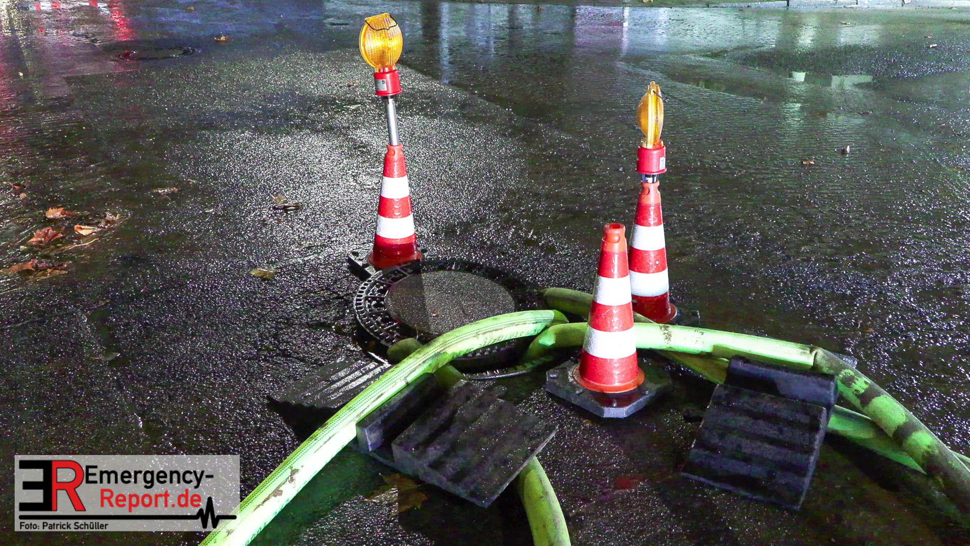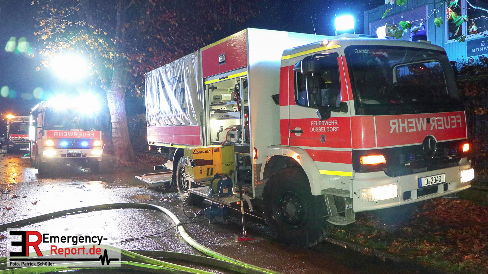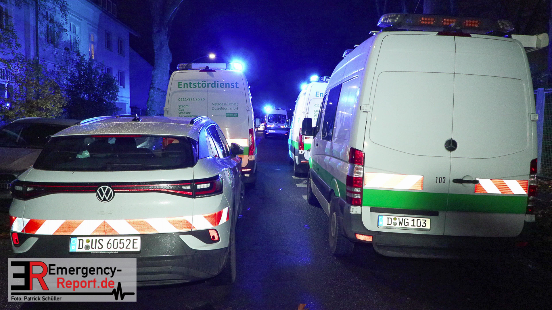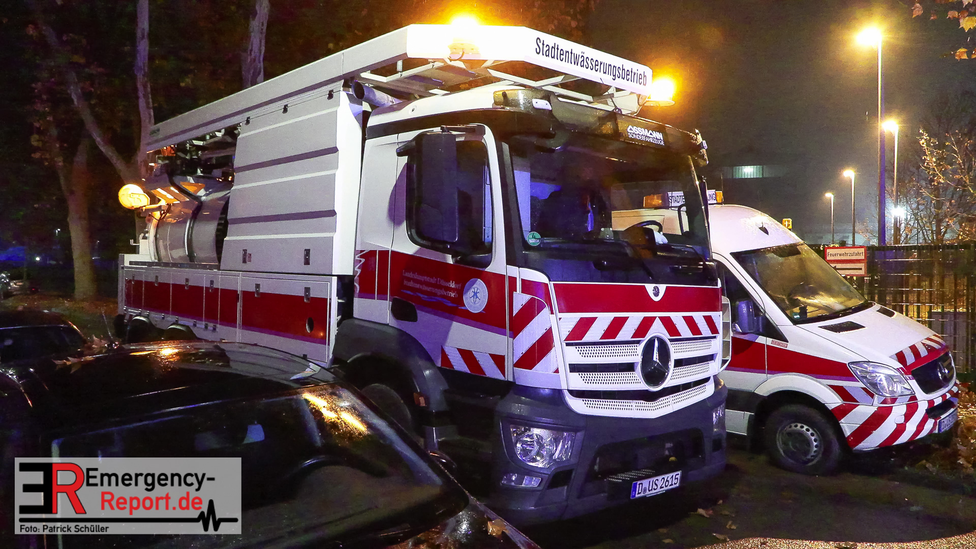 Die Leitstelle der Feuerwehr Düsseldorf wurde am Samstag, den 15.11.2025, um 23:46 Uhr durch Bewohner der Kleinstraße über einen massiven Wasseraustritt informiert. Umgehend wurden mehrere Einheiten alarmiert und zur Einsatzstelle entsandt. Vor Ort stellte sich heraus, dass eine Transportwasserleitung unterhalb der Straße gebrochen war und große Mengen Wasser austraten. Das austretende Wasser breitete sich in benachbarten Kellergeschossen von Wohngebäuden sowie in einer Tiefgarage aus.