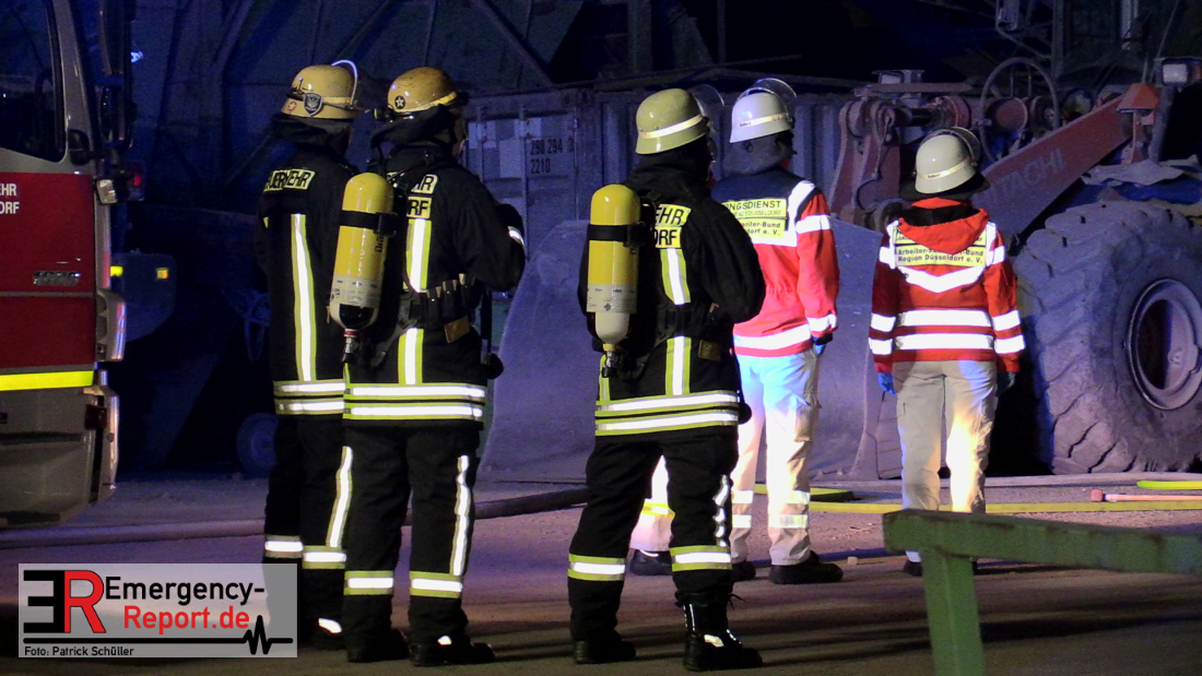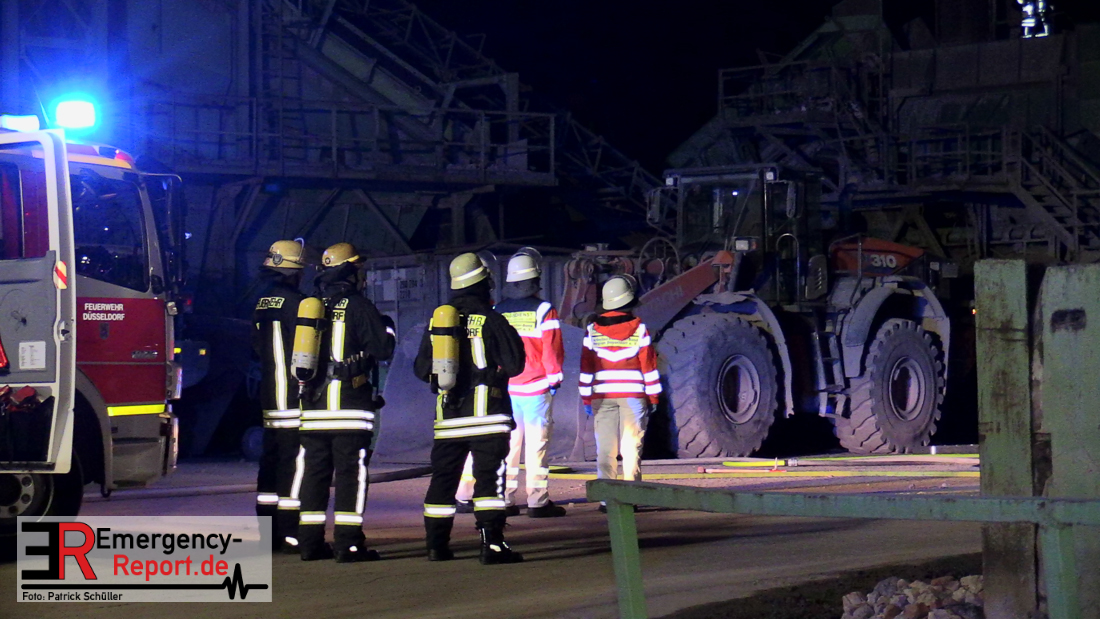 Passanten alarmierten über die Notrufnummer 112 die Leitstelle der Feuerwehr Düsseldorf über einen Brand bei einem Recyclingbetrieb im Hafen. Als die Einheiten der Feuerwache Hüttenstraße vor Ort eintrafen, brannten rund 15 Meter, der insgesamt 50 Meter langen, Maschine sowie die angrenzenden Förderbänder lichterloh.