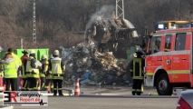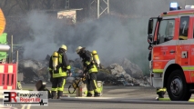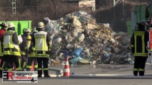 Als die ersten Einsatzkräfte bereits wenige Minuten später eintrafen, brannten in einer 600 Quadratmeter großen Restmüllumschlaghalle rund 150 Kubikmeter Abfall lichterloh. Sofort ließ der Einsatzleiter zwei Löschtrupps in das Gebäude vorgehen um die Flammen zu löschen. Schnell zeigten die Maßnahme Erfolg und eine Ausbreitung auf die Halle konnte dadurch verhindert werden. Um im weiteren Verlauf die Glutnester komplett abzulöschen, unterstützten Mitarbeiter des Entsorgungsunternehmens mit einem Kran sowie einem Greifbagger beim Herausbringen des Restmülls ins Freie. Dort löschten die Einsatzkräfte die letzten Flammen dann vollständig ab. Da aufgrund des Brandes in der Umschlaghalle dichter Brandrauch vorhanden war, setzte die Feuerwehr dreier Hochleistungslüfter ein.