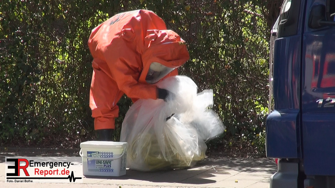 Der ABC-Zug für Gefahrguteinsätze der Berufsfeuerwehr, der Umweltschutzzug der Freiwilligen Feuerwehr, Rettungsdienst mit Notarzt und der Führungsdienst der Feuerwehr wurden alarmiert. Beim Eintreffen der Rettungskräfte war nur wenig aus dem Container ausgelaufen. Die Stoffidentifizierung durch den Einsatzleiter ergab Fluorborsäure als Ladegut. Zunächst wurde der Fahrer vom mit alarmierten Notarzt untersucht und vorsorglich zur weiteren gesundheitlichen Abklärung in ein Krankenhaus transportiert.