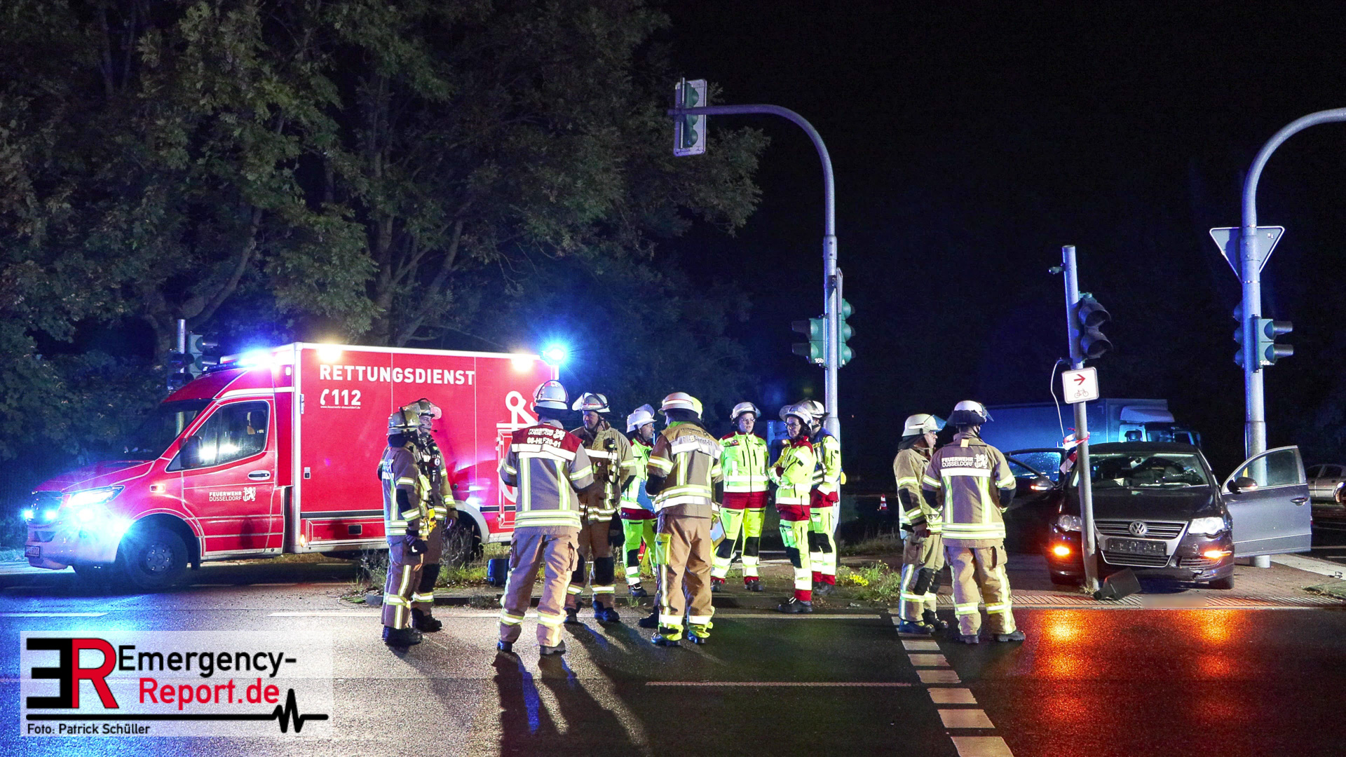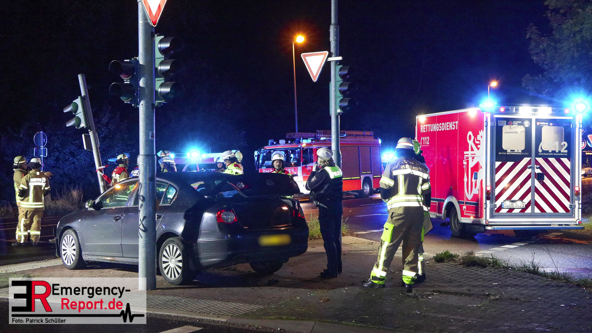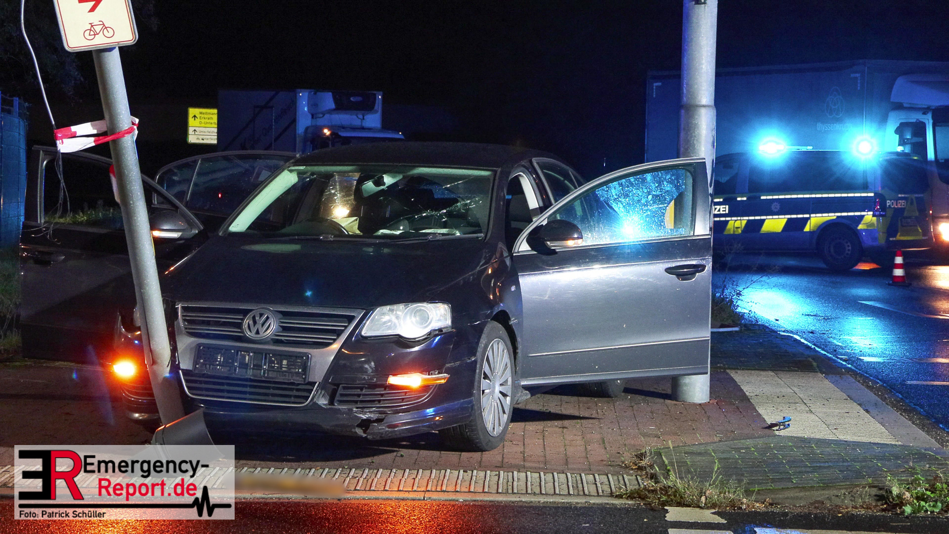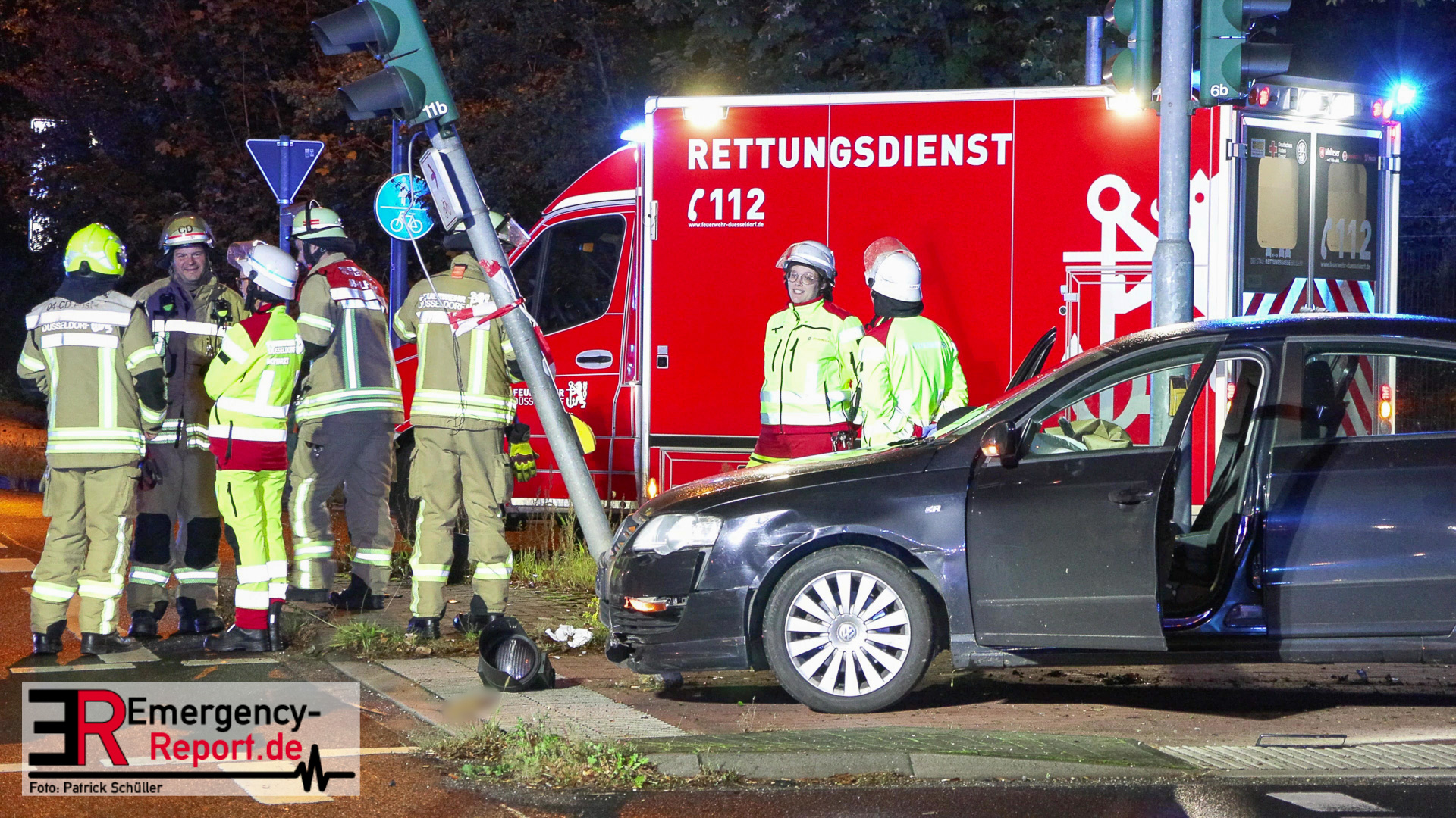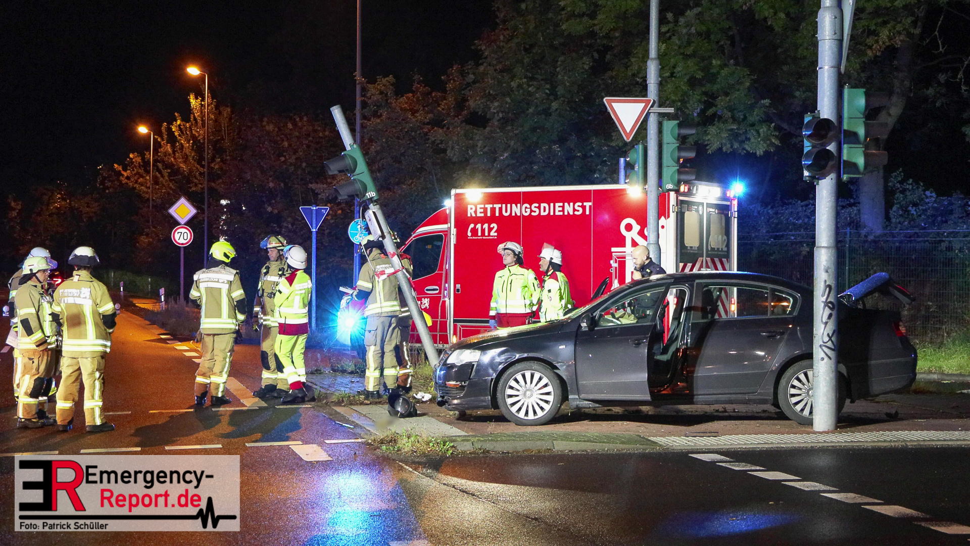Bei Eintreffen der ersten Einsatzkräfte stellte sich heraus, dass ein PKW gegen einen Ampelmast gefahren war. Der Fahrer / die Fahrerin konnte vor Ort nicht angetroffen werden. Der Bereich um die Unfallstelle wurde durch Feuerwehrleute, mit Wärmebildkameras, abgesucht. Ein Polizeihubschrauber unterstützte die Suchmaßnahmen aus der Luft. Die Suche blieb jedoch erfolglos. Während der Einsatzmaßnahmen war der Kreuzungsbereich gesperrt. Die Polizei hat die Ermittlungen zur Unfallursache aufgenommen.