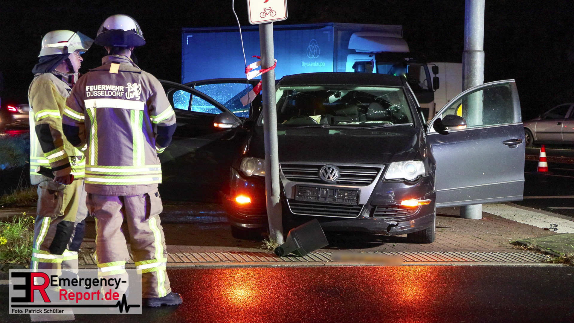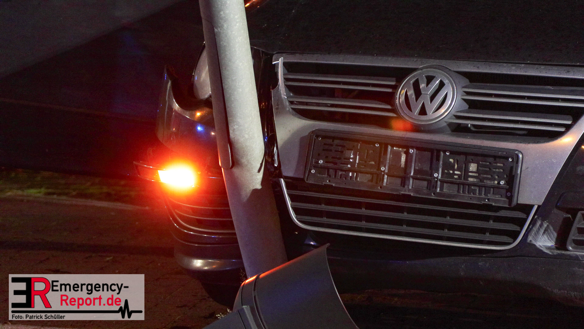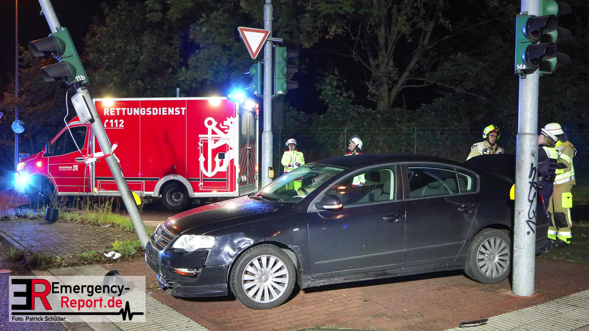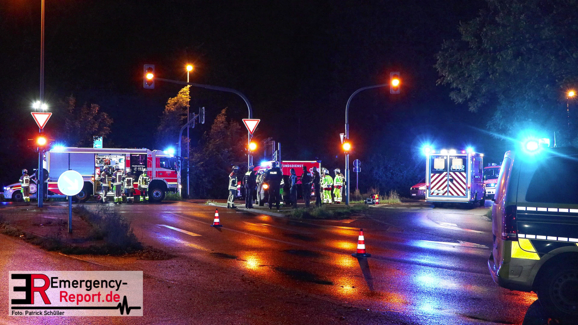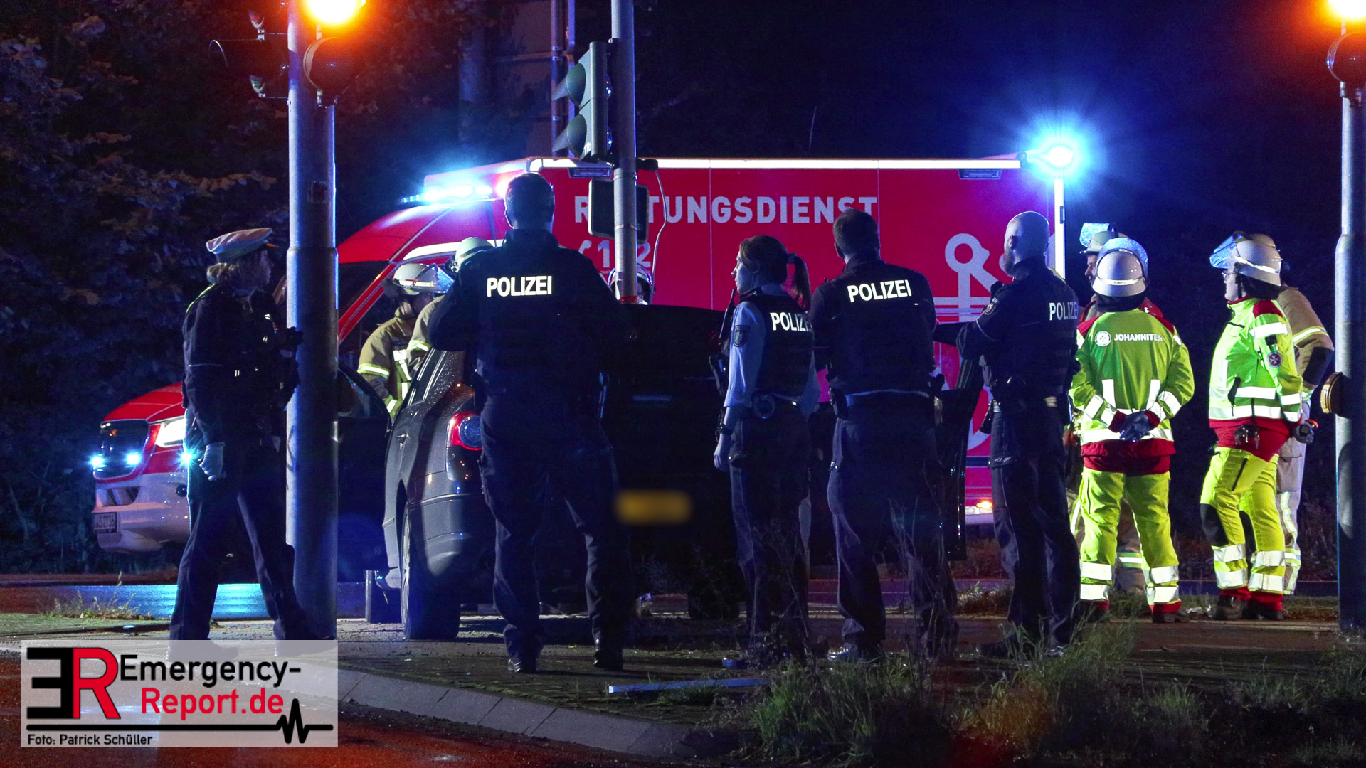 Bei Eintreffen der ersten Einsatzkräfte stellte sich heraus, dass ein PKW gegen einen Ampelmast gefahren war. Der Fahrer / die Fahrerin konnte vor Ort nicht angetroffen werden. Der Bereich um die Unfallstelle wurde durch Feuerwehrleute, mit Wärmebildkameras, abgesucht. Ein Polizeihubschrauber unterstützte die Suchmaßnahmen aus der Luft. Die Suche blieb jedoch erfolglos. Während der Einsatzmaßnahmen war der Kreuzungsbereich gesperrt. Die Polizei hat die Ermittlungen zur Unfallursache aufgenommen.
