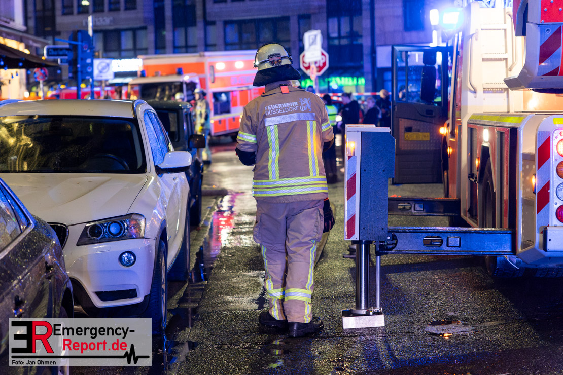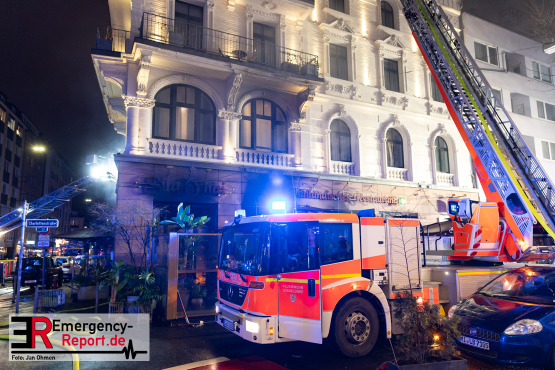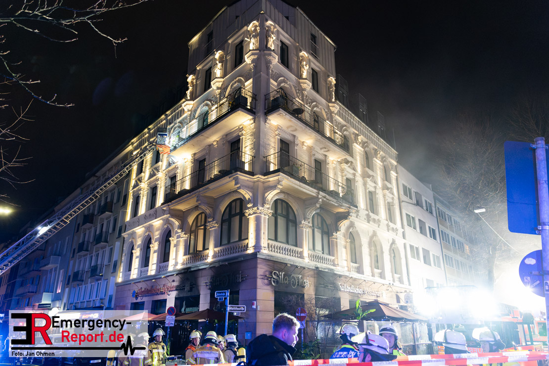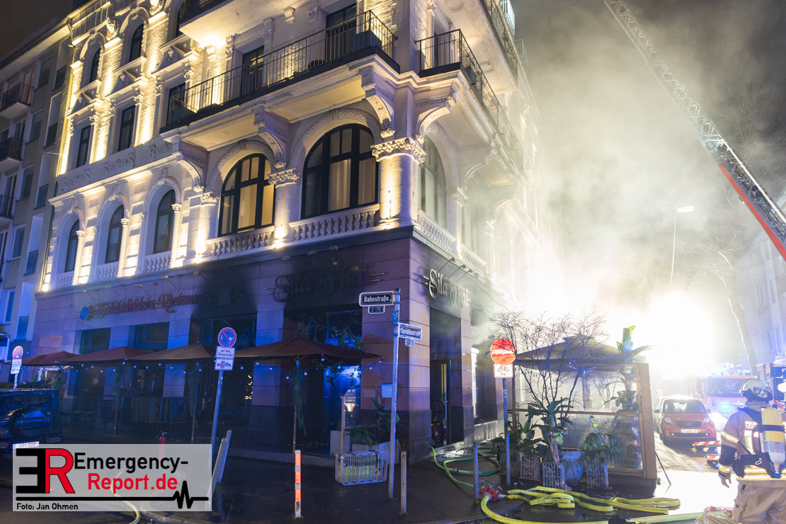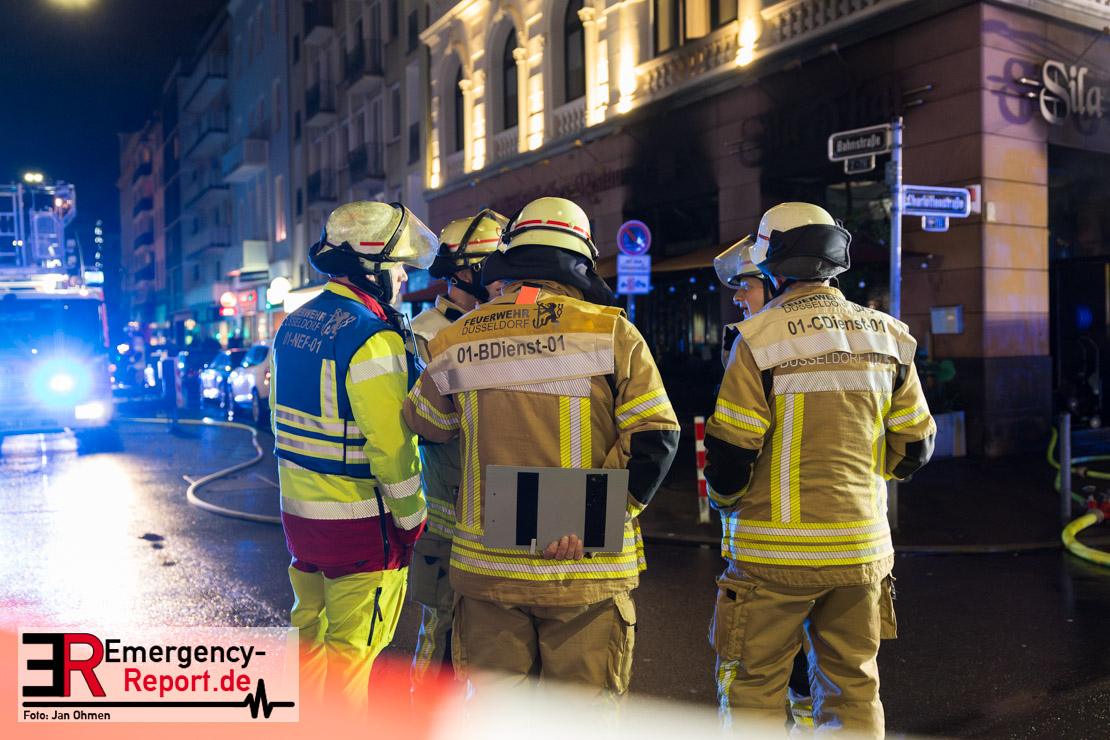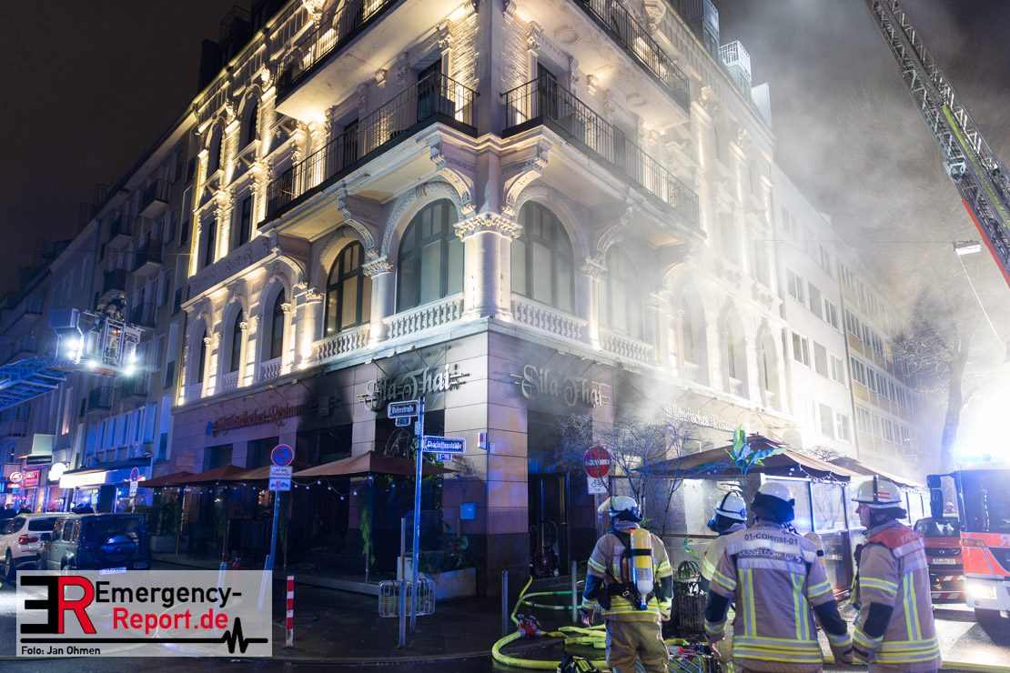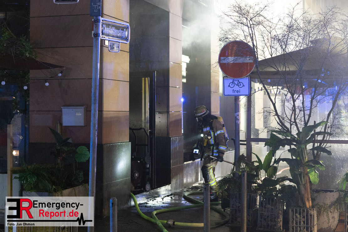 Durch zahlreiche Anrufe wurde die Feuerwehr Düsseldorf am Sonntagabend gegen 19.20 Uhr über ein brennendes Restaurant auf der Bahnstraße in der Düsseldorfer Innenstadt informiert. Aufgrund der Schilderungen der Anrufer entsandte die Leitstelle der Feuerwehr Düsseldorf umgehend mehrere Einheiten von Feuerwehr und Rettungsdienst zur Einsatzstelle. Bereits wenige Minuten nach den Notrufen trafen die ersten Einsatzkräfte an der Bahnstraße ein. Dort schlugen schon die Flammen aus dem Restaurant und drohten, auf die erste Etage des Wohn- und Geschäftshauses überzugreifen. Der Betreiber teilte dem Einsatzleiter mit, dass alle Gäste sowie Angestellte das Restaurant verlassen hatten. Durch den Einsatzleiter wurden Einsatzkräfte mit Löschschläuchen und Atemschutzgeräten zur Brandbekämpfung in das Restaurant entsendet. Der Treppenraum eines angrenzenden Hotels wurde durch die massive Rauchentwicklung stark verraucht. Durch den eingedrungenen Rauch konnten die Gäste das Hotel nicht eigenständig über den Treppenraum verlassen. Umgehend wurden durch den Einsatzleiter zwei Drehleitern eingesetzt. Über diese beiden Leitern konnte eine eingeschlossene Person aus der zweiten Etage unverletzt gerettet werden. Der Einsatzleiter entsendete sofort mehrere Trupps, ausgestattet mit Atemluftgeräten und Löschschläuchen in den Treppenraum, um ggf. gefährdete Personen zu retten. Durch die Einsatzkräfte konnten drei Personen unverletzt aus dem Gebäude geführt werden. Alle Personen wurden durch den städtischen Rettungsdienst untersucht und konnten nach eingehender Diagnostik unverletzt die Einsatzstelle verlassen. Des Weiteren wurde die Netzgesellschaft Düsseldorf alarmiert, um Schäden an der Gas-Wasser- sowie Stromversorgung überprüfen zulassen. Durch die Netzgesellschaft wurden Brand- und Wasserschäden an der Elektroverteilung erkannt. Daher wurde das gesamte Gebäude stromlos geschaltet. Die Hotelgäste wurden durch den Betreiber in umliegende Hotels verteilt.
