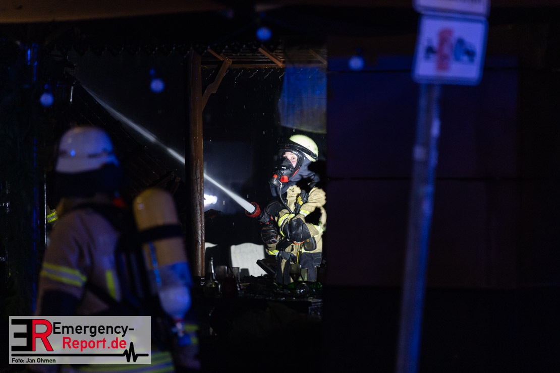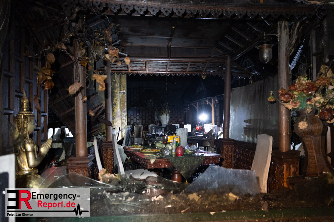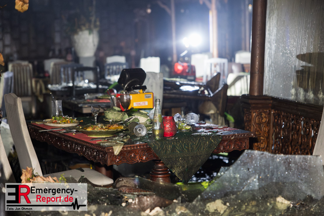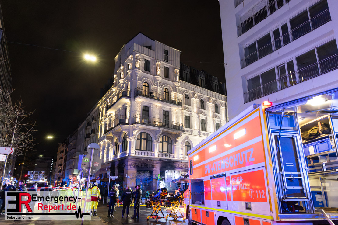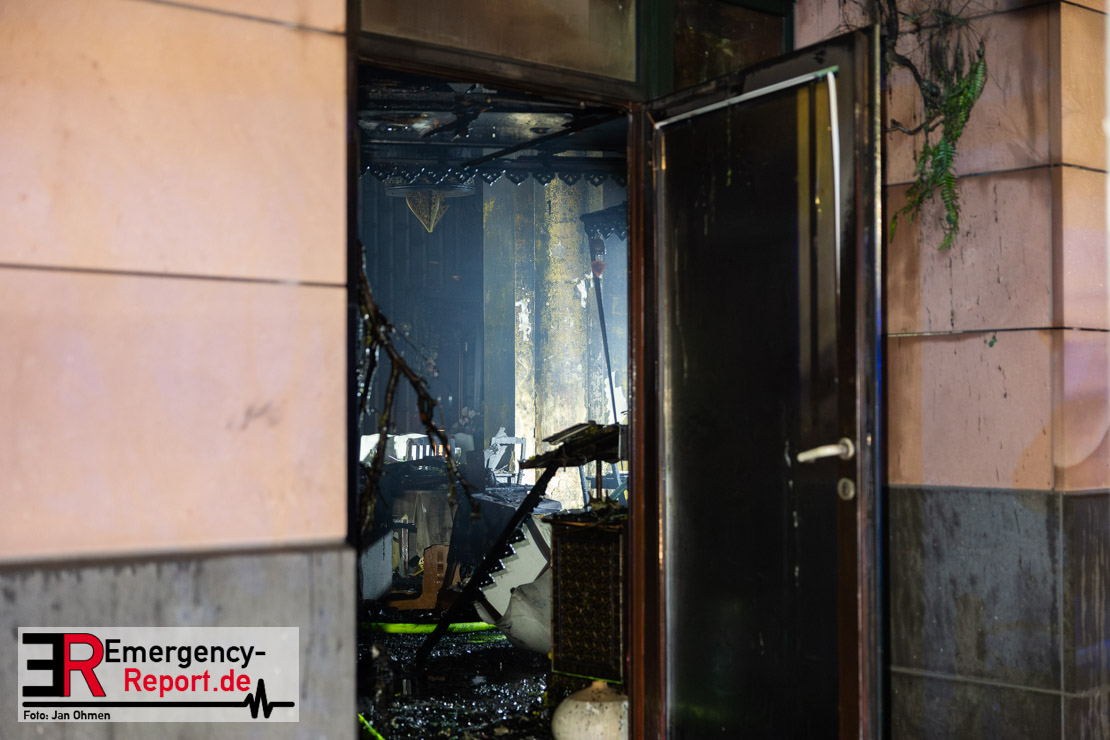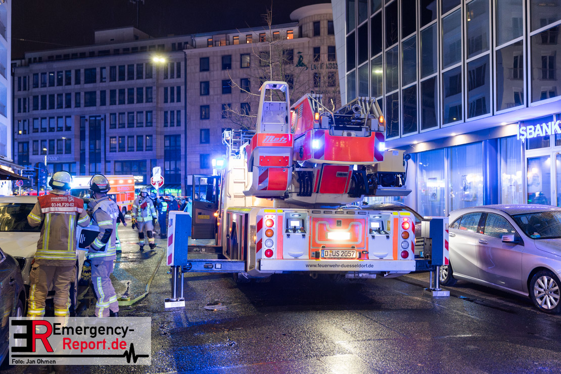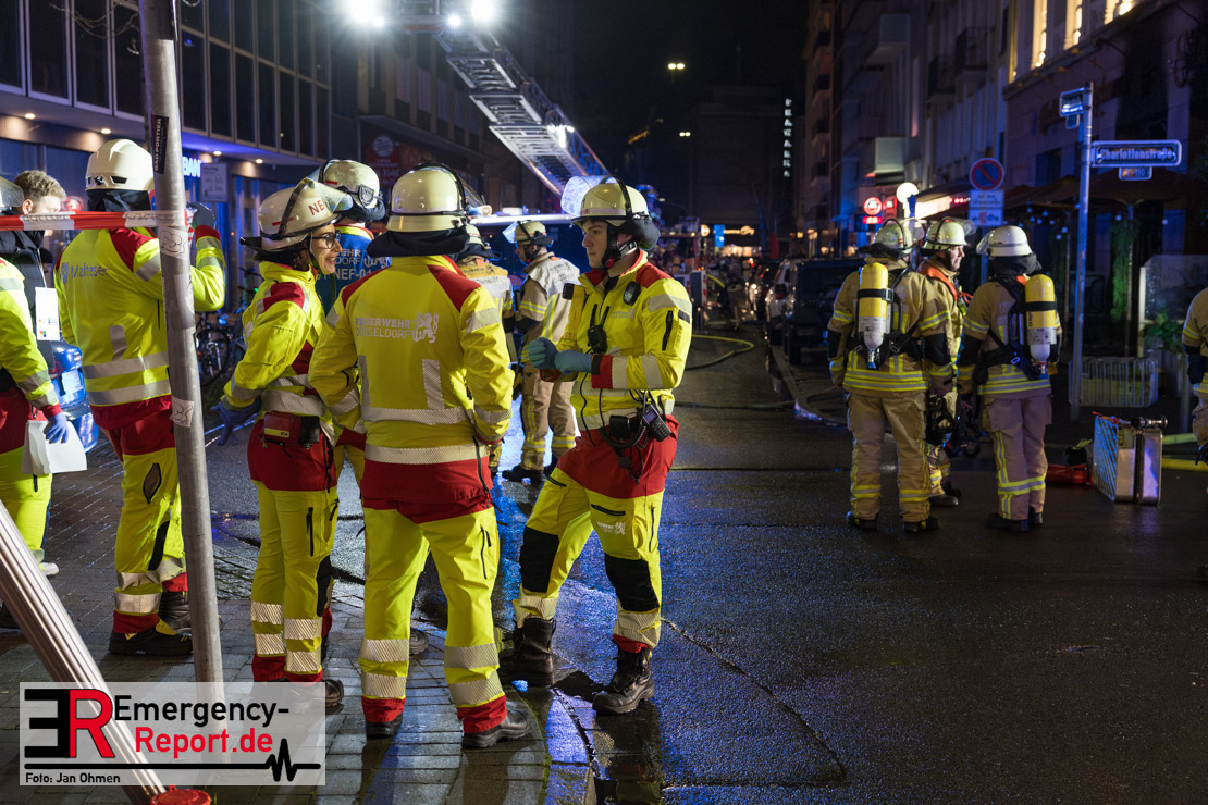 Durch zahlreiche Anrufe wurde die Feuerwehr Düsseldorf am Sonntagabend gegen 19.20 Uhr über ein brennendes Restaurant auf der Bahnstraße in der Düsseldorfer Innenstadt informiert. Aufgrund der Schilderungen der Anrufer entsandte die Leitstelle der Feuerwehr Düsseldorf umgehend mehrere Einheiten von Feuerwehr und Rettungsdienst zur Einsatzstelle. Bereits wenige Minuten nach den Notrufen trafen die ersten Einsatzkräfte an der Bahnstraße ein. Dort schlugen schon die Flammen aus dem Restaurant und drohten, auf die erste Etage des Wohn- und Geschäftshauses überzugreifen. Der Betreiber teilte dem Einsatzleiter mit, dass alle Gäste sowie Angestellte das Restaurant verlassen hatten. Durch den Einsatzleiter wurden Einsatzkräfte mit Löschschläuchen und Atemschutzgeräten zur Brandbekämpfung in das Restaurant entsendet. Der Treppenraum eines angrenzenden Hotels wurde durch die massive Rauchentwicklung stark verraucht. Durch den eingedrungenen Rauch konnten die Gäste das Hotel nicht eigenständig über den Treppenraum verlassen. Umgehend wurden durch den Einsatzleiter zwei Drehleitern eingesetzt. Über diese beiden Leitern konnte eine eingeschlossene Person aus der zweiten Etage unverletzt gerettet werden. Der Einsatzleiter entsendete sofort mehrere Trupps, ausgestattet mit Atemluftgeräten und Löschschläuchen in den Treppenraum, um ggf. gefährdete Personen zu retten. Durch die Einsatzkräfte konnten drei Personen unverletzt aus dem Gebäude geführt werden. Alle Personen wurden durch den städtischen Rettungsdienst untersucht und konnten nach eingehender Diagnostik unverletzt die Einsatzstelle verlassen. Des Weiteren wurde die Netzgesellschaft Düsseldorf alarmiert, um Schäden an der Gas-Wasser- sowie Stromversorgung überprüfen zulassen. Durch die Netzgesellschaft wurden Brand- und Wasserschäden an der Elektroverteilung erkannt. Daher wurde das gesamte Gebäude stromlos geschaltet. Die Hotelgäste wurden durch den Betreiber in umliegende Hotels verteilt.