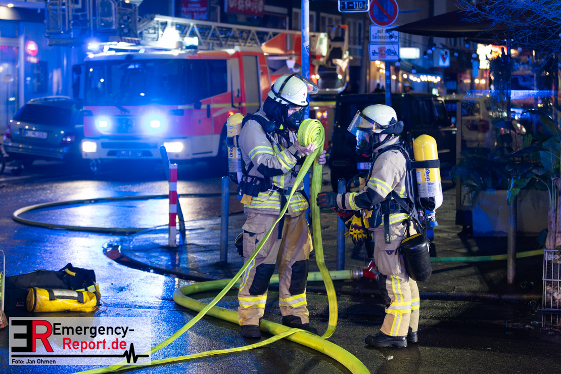 Am Sonntagabend kam es zu einem ausgedehnten Brand eines Restaurants auf der Bahnstraße in Düsseldorf. Durch das vorbildliche Verhalten des Restaurantbetreibers wurden alle Gäste und Angestellten noch vor dem Eintreffen der Feuerwehr aus dem Gebäude geführt. Mit mehreren Löschschläuchen konnte die Feuerwehr ein Übergreifen der Flammen auf die angrenzenden Etagen verhindern.