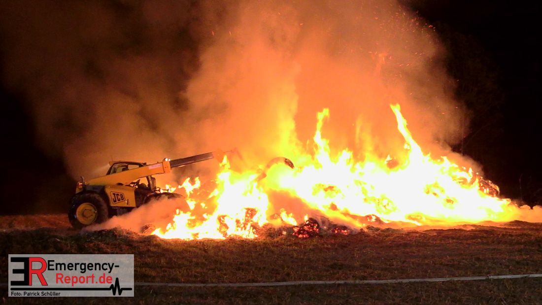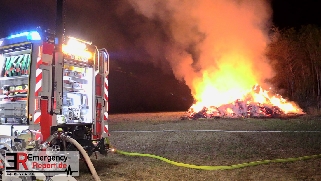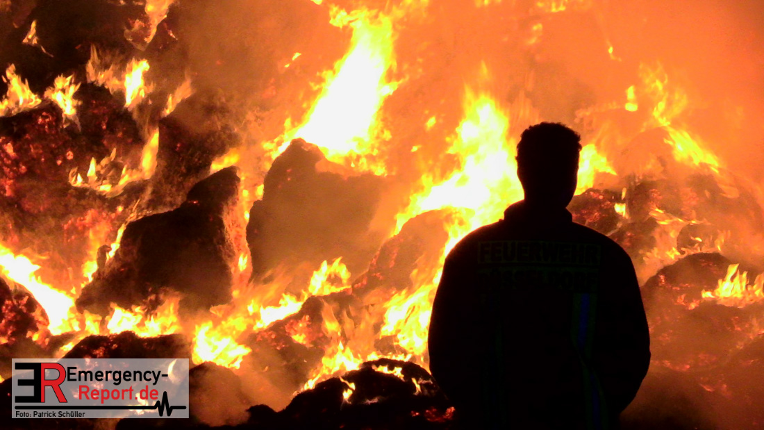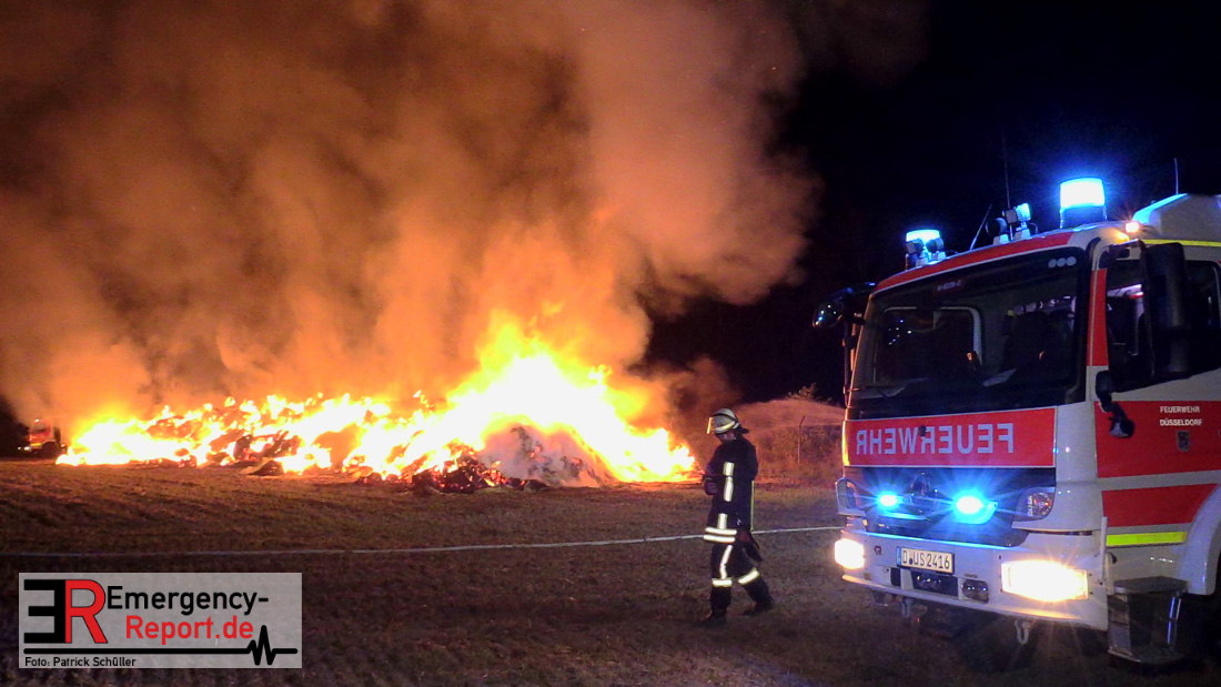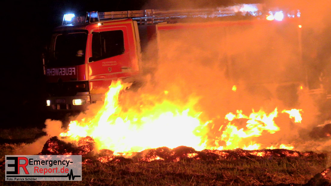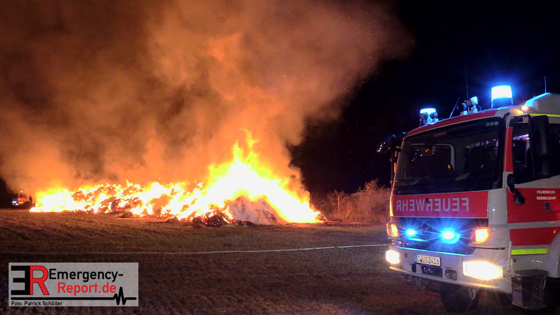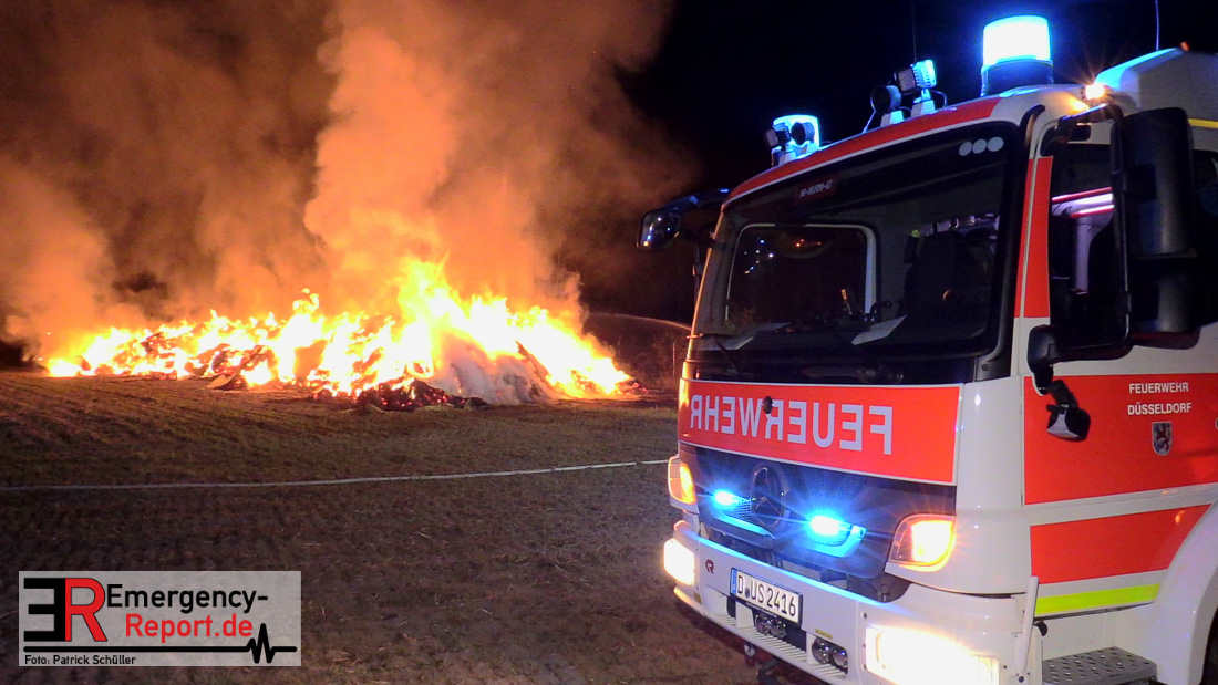 Am frühen Donnerstagmorgen informierte ein Passant die Feuerwehr über brennende Strohballen im Bereich Wasserwerksweg. Ein Leitstellenmitarbeiter der Feuerwehr Düsseldorf alarmierte daraufhin die zuständige Wache Flughafenstraße sowie die Freiwillige Feuerwehr Wittlaer zur gemeldeten Einsatzstelle. Als die ersten Einsatzkräfte am Wasserwerksweg eintrafen, brannten bereits circa 180 Strohballen der dort gelagerten Strohmiete. Umgehend setzte der Einsatzleiter zwei Löschtrupps zum Schutz der restlichen Strohballen und zur Brandbekämpfung ein. Um ein besseres Ablöschen der Flammen und Glutnester zu ermöglichen, setzte die Feuerwehr in Zusammenarbeit mit einem Landwirt zwei Teleskoplader ein. So war es möglich die einzelnen Strohballen auseinander zuziehen, sodass auch tieferliegende Glutnester abgelöscht werden konnten. Gerade diese Arbeiten stellten sich als sehr zeitintensiv heraus – die letzten Flammen konnten erst gegen sieben Uhr morgens gelöscht werden.