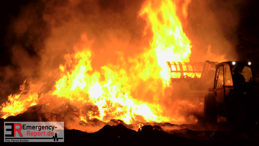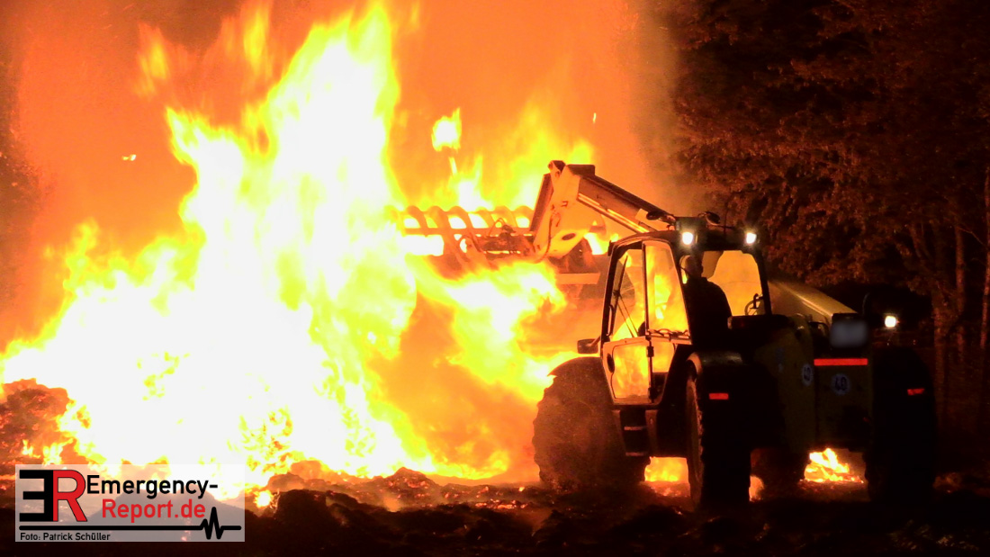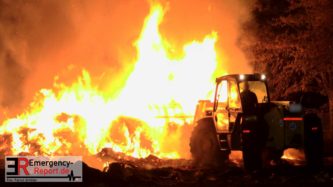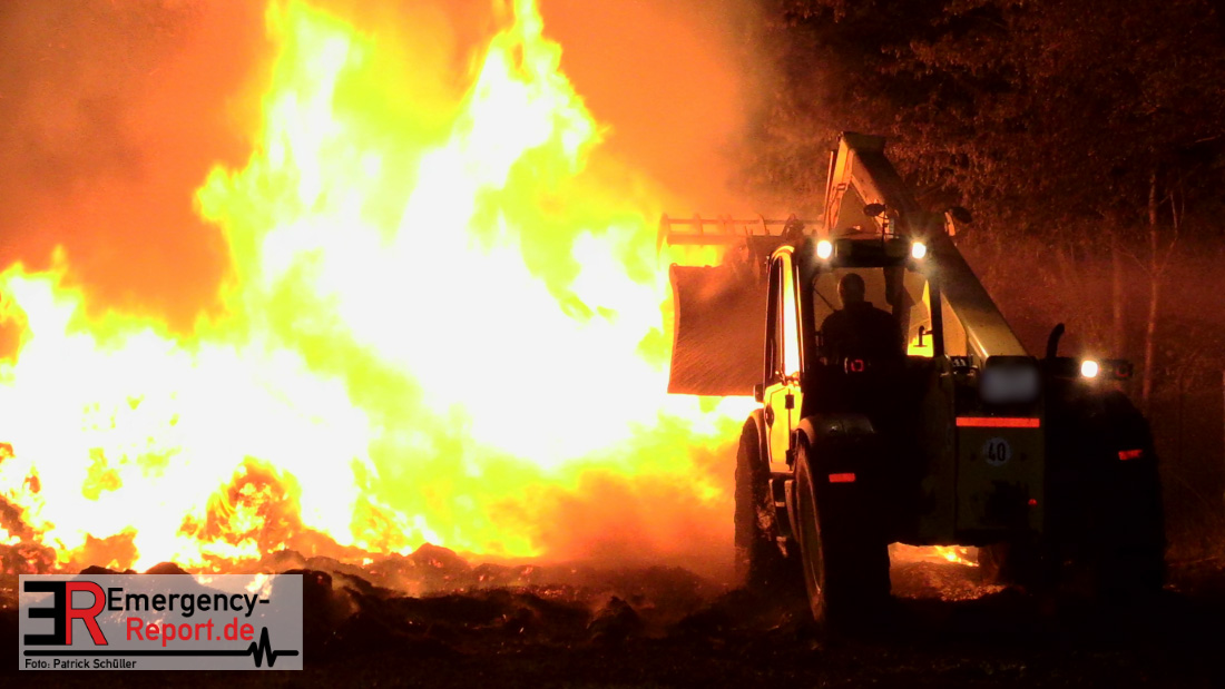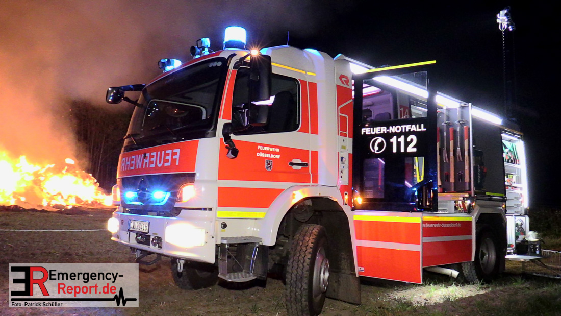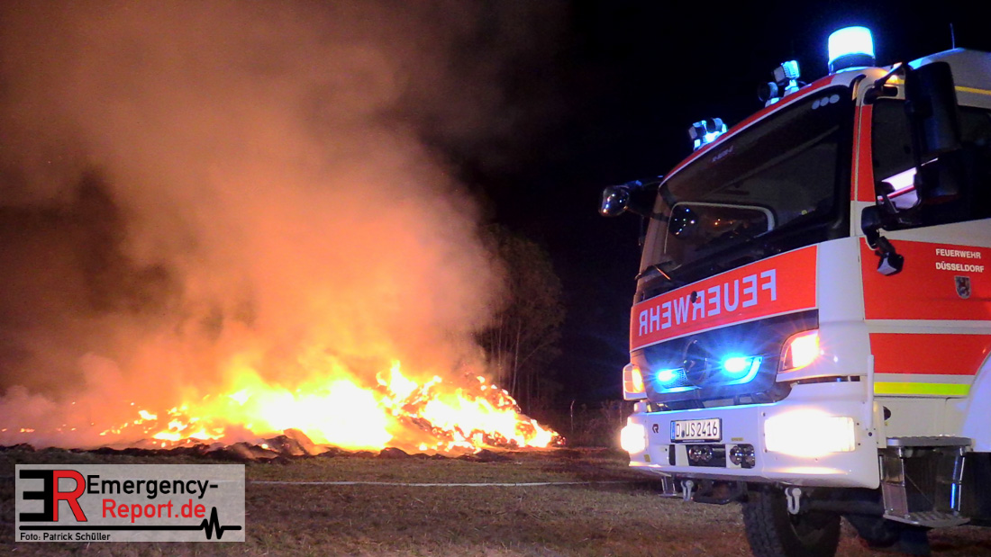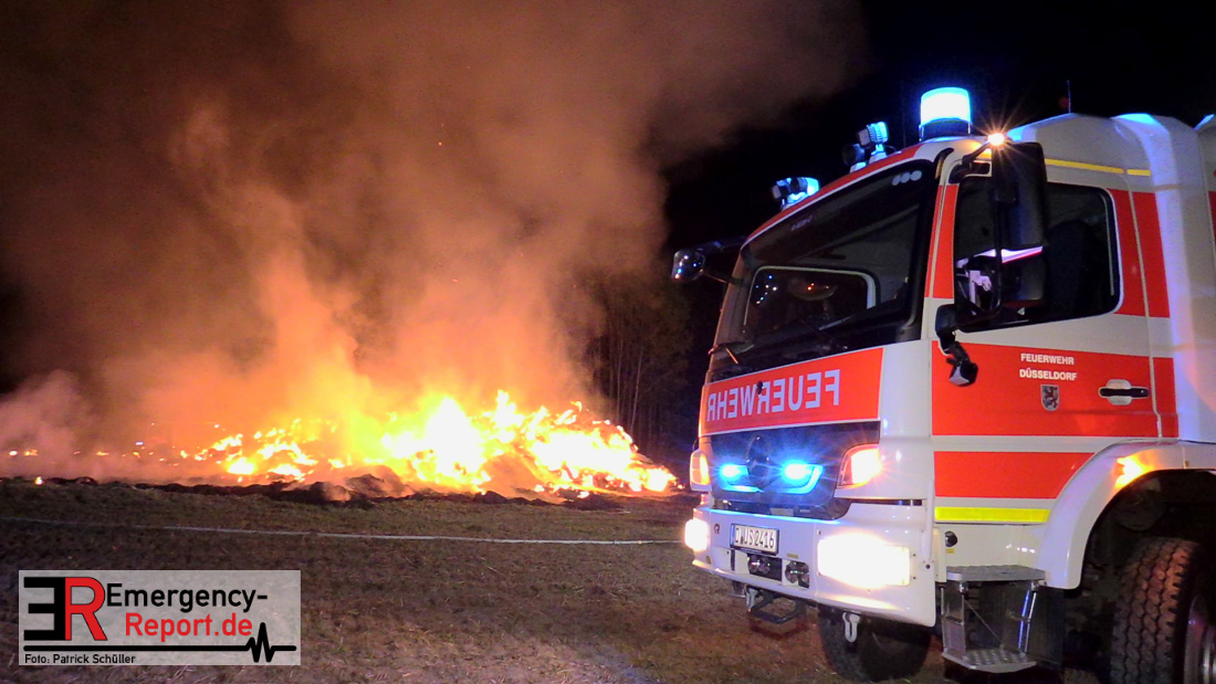 Am frühen Donnerstagmorgen informierte ein Passant die Feuerwehr über brennende Strohballen im Bereich Wasserwerksweg. Ein Leitstellenmitarbeiter der Feuerwehr Düsseldorf alarmierte daraufhin die zuständige Wache Flughafenstraße sowie die Freiwillige Feuerwehr Wittlaer zur gemeldeten Einsatzstelle. Als die ersten Einsatzkräfte am Wasserwerksweg eintrafen, brannten bereits circa 180 Strohballen der dort gelagerten Strohmiete. Umgehend setzte der Einsatzleiter zwei Löschtrupps zum Schutz der restlichen Strohballen und zur Brandbekämpfung ein. Um ein besseres Ablöschen der Flammen und Glutnester zu ermöglichen, setzte die Feuerwehr in Zusammenarbeit mit einem Landwirt zwei Teleskoplader ein. So war es möglich die einzelnen Strohballen auseinander zuziehen, sodass auch tieferliegende Glutnester abgelöscht werden konnten. Gerade diese Arbeiten stellten sich als sehr zeitintensiv heraus – die letzten Flammen konnten erst gegen sieben Uhr morgens gelöscht werden.