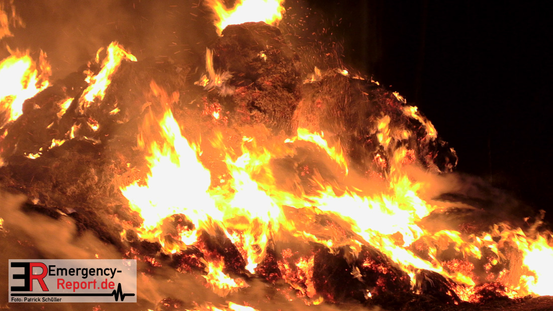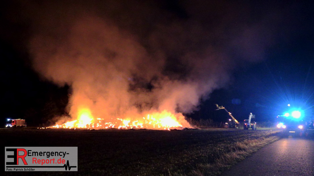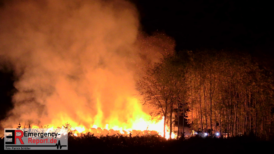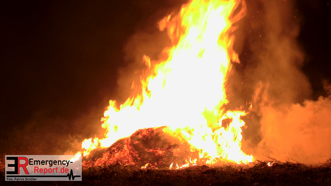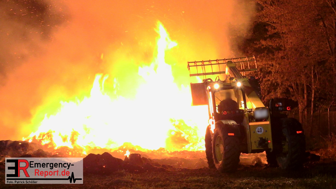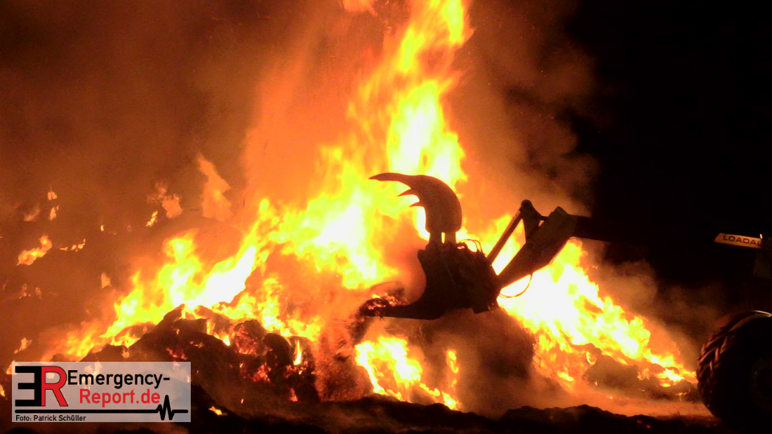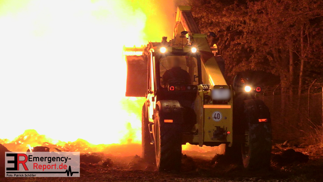 Am frühen Donnerstagmorgen informierte ein Passant die Feuerwehr über brennende Strohballen im Bereich Wasserwerksweg. Ein Leitstellenmitarbeiter der Feuerwehr Düsseldorf alarmierte daraufhin die zuständige Wache Flughafenstraße sowie die Freiwillige Feuerwehr Wittlaer zur gemeldeten Einsatzstelle. Als die ersten Einsatzkräfte am Wasserwerksweg eintrafen, brannten bereits circa 180 Strohballen der dort gelagerten Strohmiete. Umgehend setzte der Einsatzleiter zwei Löschtrupps zum Schutz der restlichen Strohballen und zur Brandbekämpfung ein. Um ein besseres Ablöschen der Flammen und Glutnester zu ermöglichen, setzte die Feuerwehr in Zusammenarbeit mit einem Landwirt zwei Teleskoplader ein. So war es möglich die einzelnen Strohballen auseinander zuziehen, sodass auch tieferliegende Glutnester abgelöscht werden konnten. Gerade diese Arbeiten stellten sich als sehr zeitintensiv heraus – die letzten Flammen konnten erst gegen sieben Uhr morgens gelöscht werden.