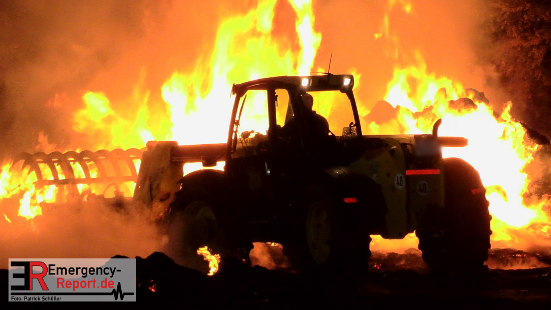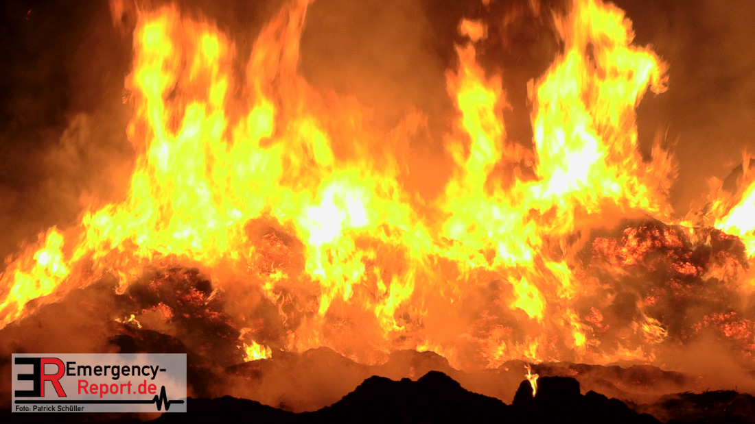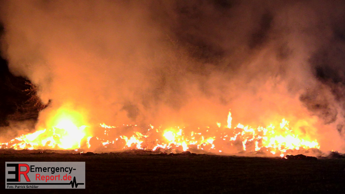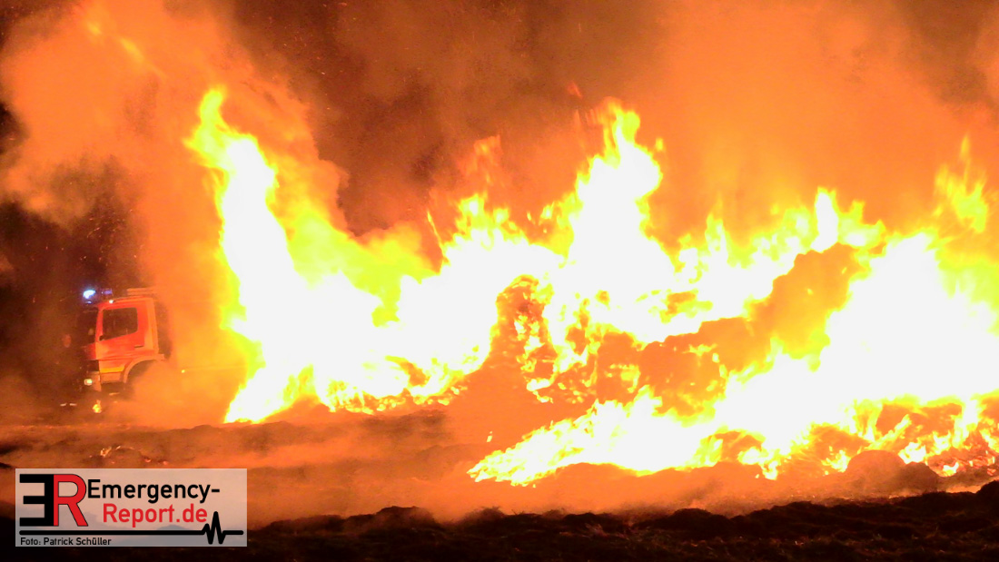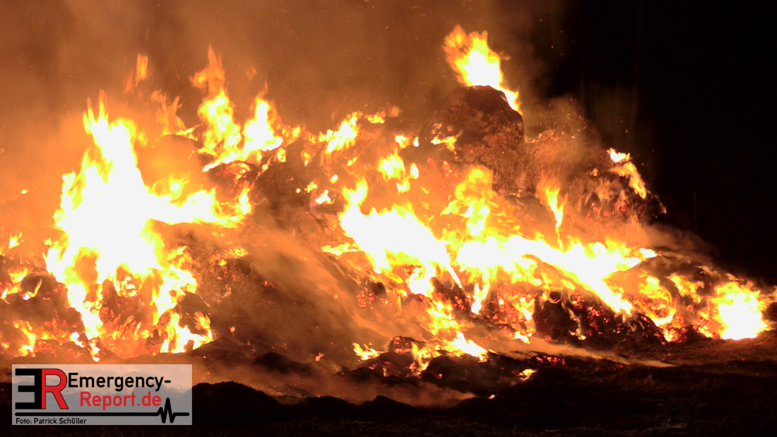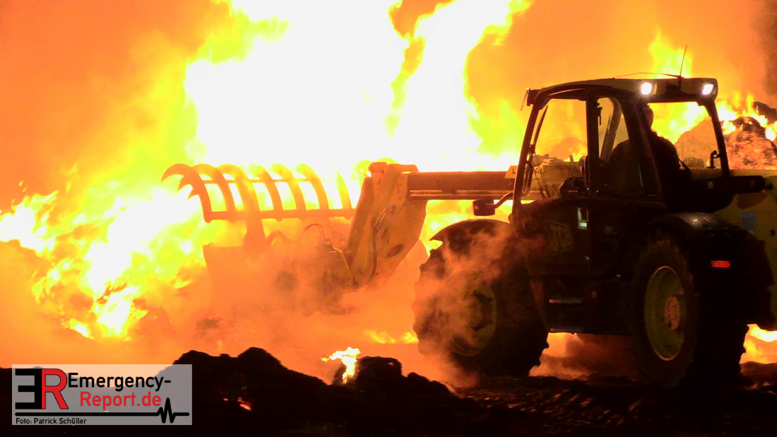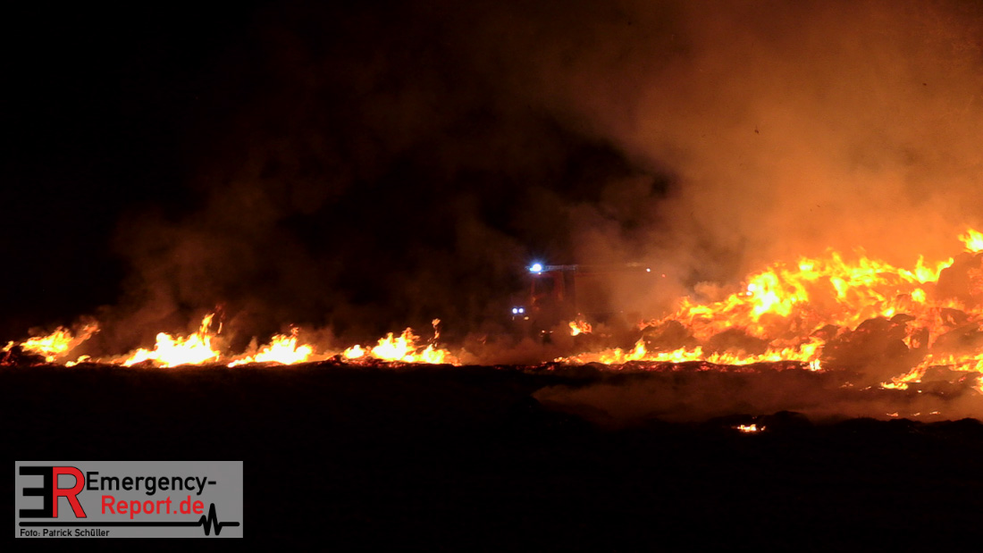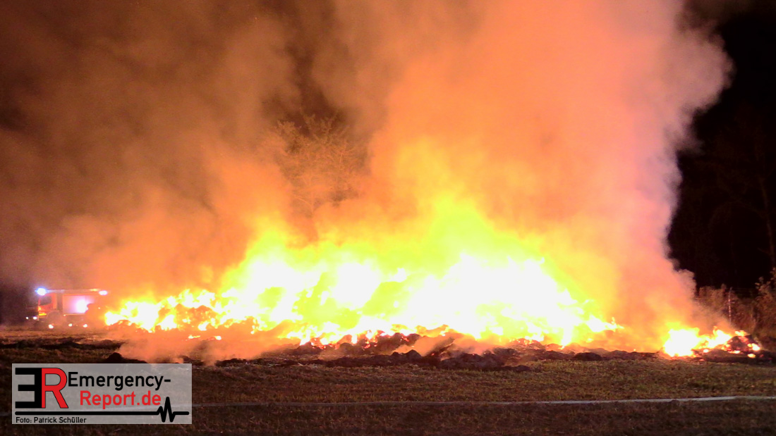 Am frühen Donnerstagmorgen informierte ein Passant die Feuerwehr über brennende Strohballen im Bereich Wasserwerksweg. Ein Leitstellenmitarbeiter der Feuerwehr Düsseldorf alarmierte daraufhin die zuständige Wache Flughafenstraße sowie die Freiwillige Feuerwehr Wittlaer zur gemeldeten Einsatzstelle. Als die ersten Einsatzkräfte am Wasserwerksweg eintrafen, brannten bereits circa 180 Strohballen der dort gelagerten Strohmiete. Umgehend setzte der Einsatzleiter zwei Löschtrupps zum Schutz der restlichen Strohballen und zur Brandbekämpfung ein. Um ein besseres Ablöschen der Flammen und Glutnester zu ermöglichen, setzte die Feuerwehr in Zusammenarbeit mit einem Landwirt zwei Teleskoplader ein. So war es möglich die einzelnen Strohballen auseinander zuziehen, sodass auch tieferliegende Glutnester abgelöscht werden konnten. Gerade diese Arbeiten stellten sich als sehr zeitintensiv heraus – die letzten Flammen konnten erst gegen sieben Uhr morgens gelöscht werden.