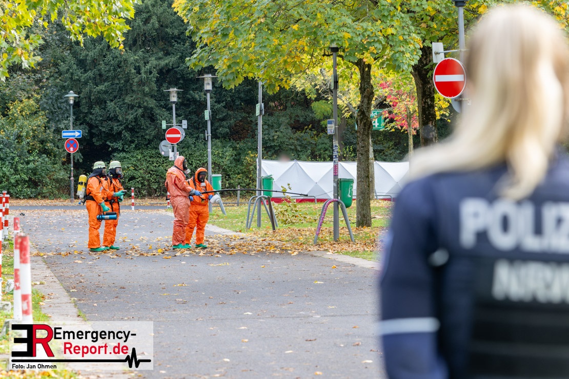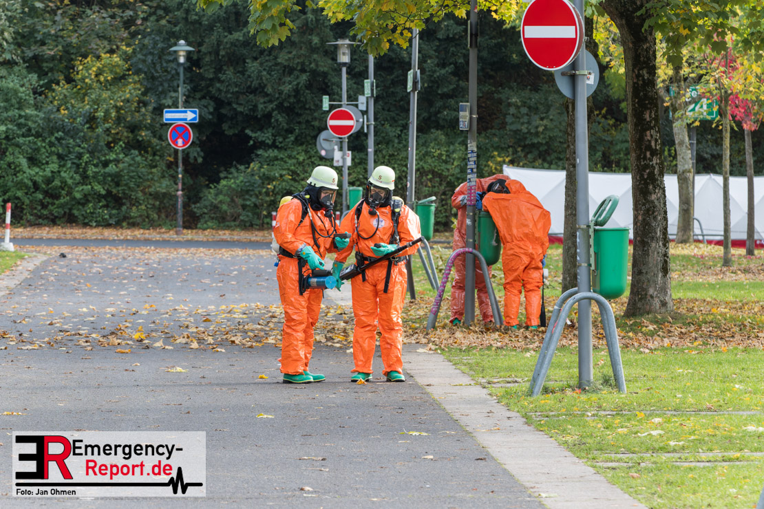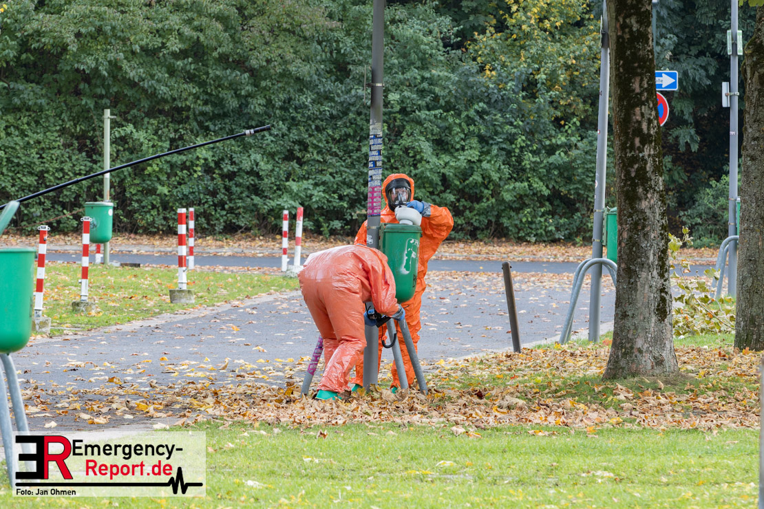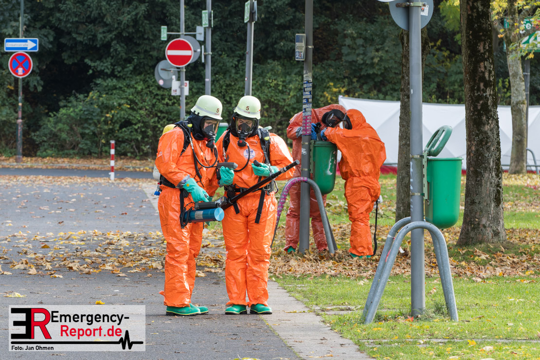Gegen 14 Uhr erreichte die Leitstelle der Feuerwehr Düsseldorf die Meldung über einen möglichen Gefahrstoffaustritt auf einem Parkplatz am Europaplatz. Umgehend alarmierte die Leitstelle zahlreiche Einsatzkräfte der Feuerwehr und des Rettungsdienstes zur gemeldeten Adresse. Beim Eintreffen sperrten die ersten Feuerwehrleute den Bereich großräumig ab und begannen mit der Erkundung des Stoffes. Aufgrund der unklaren Meldung führten die Einsatzkräfte umfangreiche Messungen mit diversen Messgeräten durch. Parallel zur Stofferkundung wurden drei Personen aus dem Bereich auf eine Kontamination kontrolliert, da ein kurzzeitiger Kontakt mit der unbekannten Substanz nicht auszuschließen war. Hier konnte schnell Entwarnung gegeben werden – es kamen keine Menschen zu Schaden.