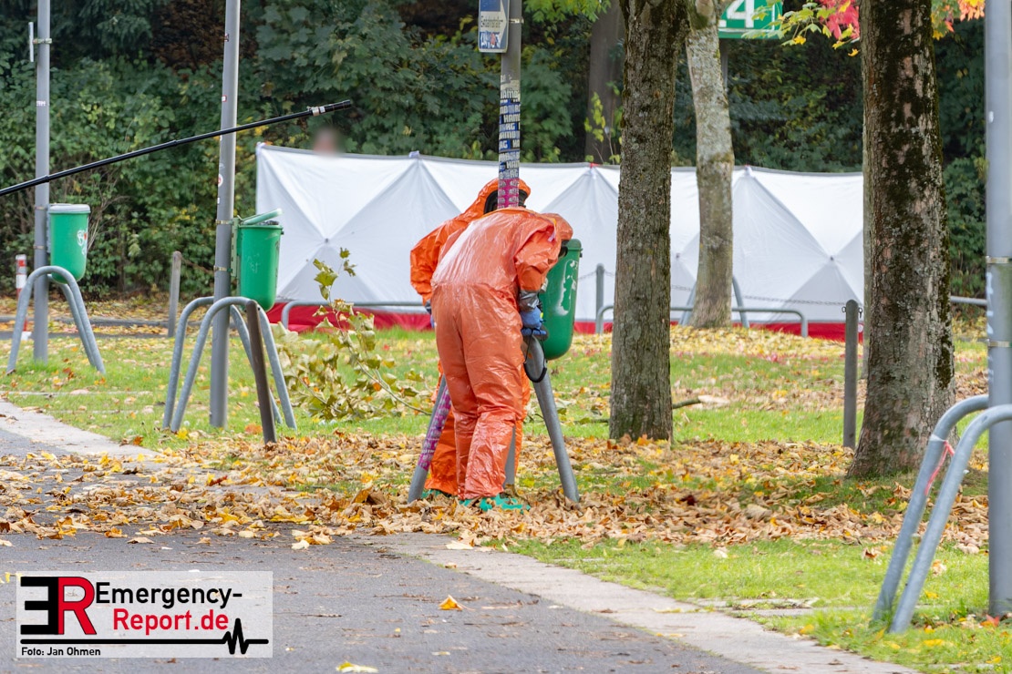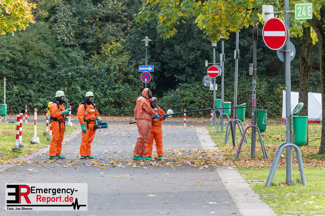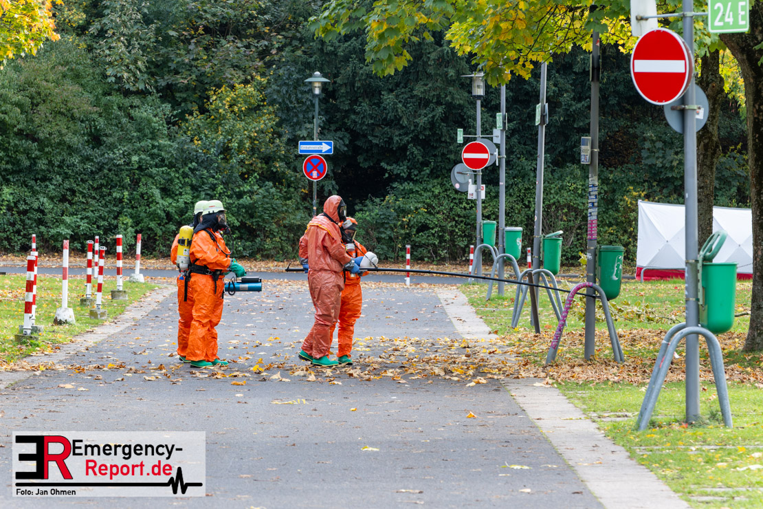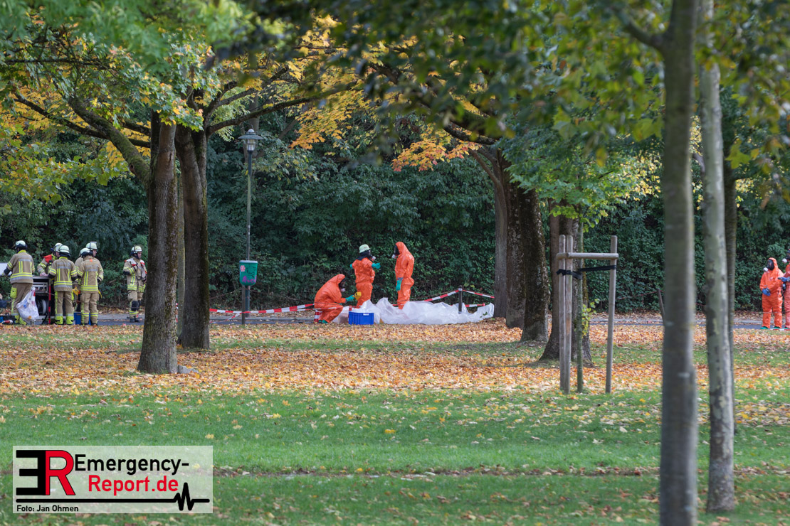 Gegen 14 Uhr erreichte die Leitstelle der Feuerwehr Düsseldorf die Meldung über einen möglichen Gefahrstoffaustritt auf einem Parkplatz am Europaplatz. Umgehend alarmierte die Leitstelle zahlreiche Einsatzkräfte der Feuerwehr und des Rettungsdienstes zur gemeldeten Adresse. Beim Eintreffen sperrten die ersten Feuerwehrleute den Bereich großräumig ab und begannen mit der Erkundung des Stoffes. Aufgrund der unklaren Meldung führten die Einsatzkräfte umfangreiche Messungen mit diversen Messgeräten durch. Parallel zur Stofferkundung wurden drei Personen aus dem Bereich auf eine Kontamination kontrolliert, da ein kurzzeitiger Kontakt mit der unbekannten Substanz nicht auszuschließen war. Hier konnte schnell Entwarnung gegeben werden – es kamen keine Menschen zu Schaden.