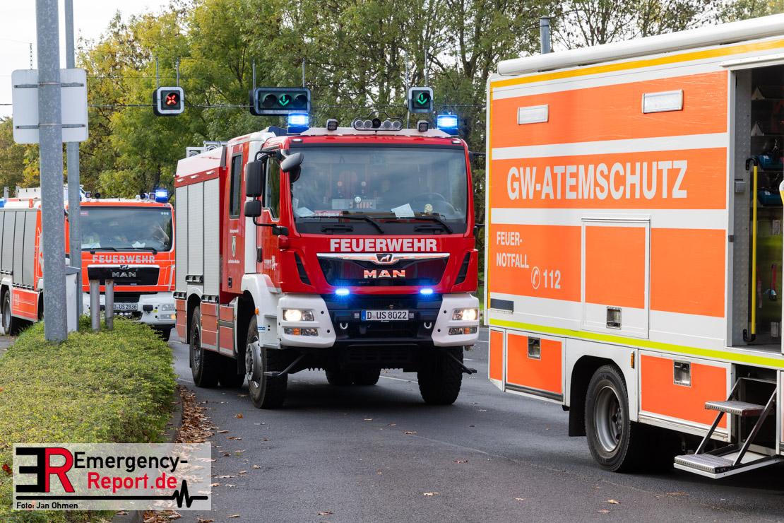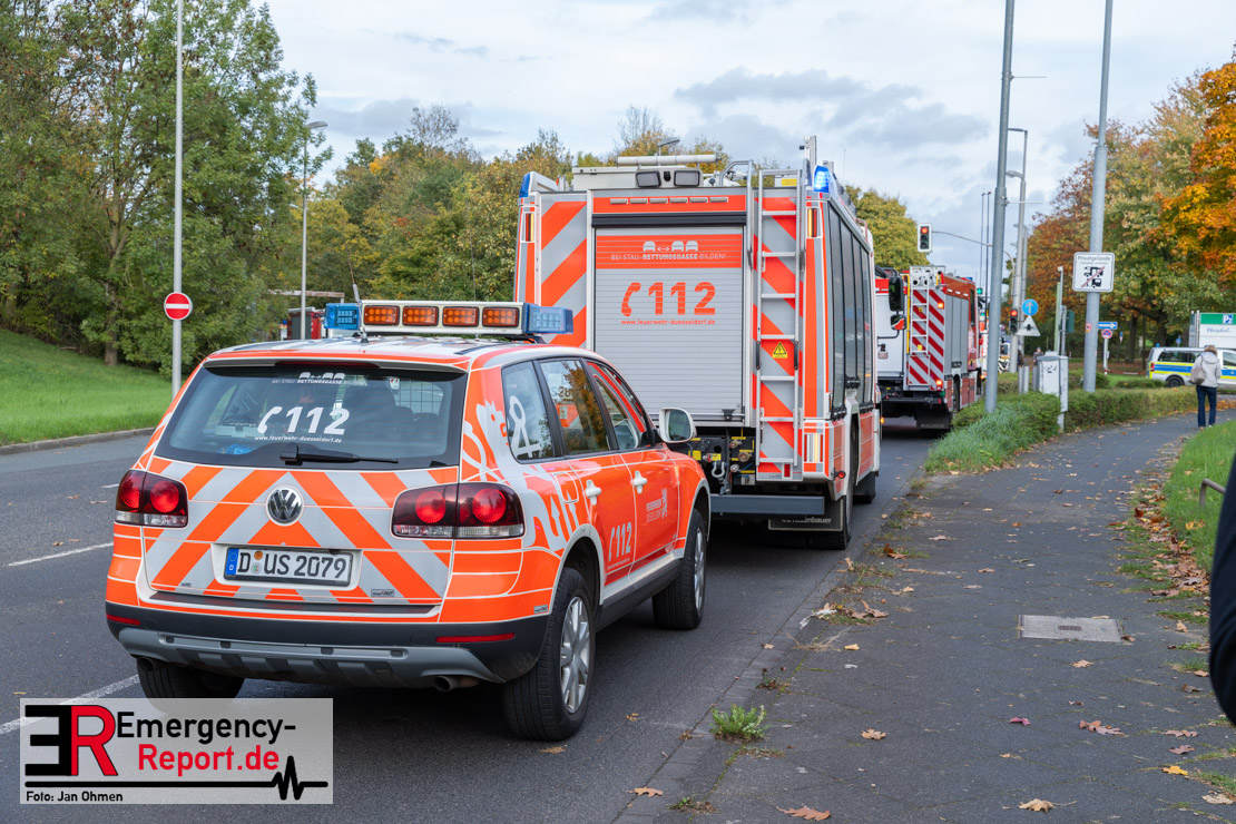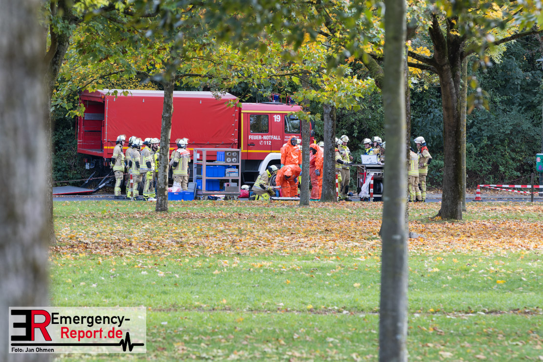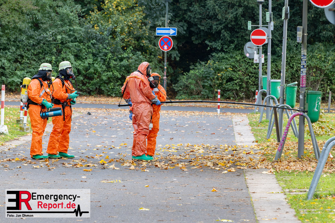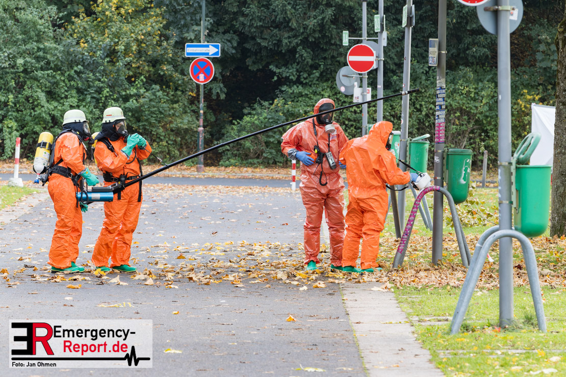 Am Mittwochmittag meldete die Polizei einen möglichen Gefahrstoff auf einem Parkplatz in Stockum an die Leitstelle der Feuerwehr Düsseldorf. Die alarmierten Einsatzkräfte sperrten den Bereich großräumig ab und führten eine Stofferkundung durch. Hierbei konnten keine gefährlichen Stoffe nachgewiesen werden. Verletzt wurde bei dem Einsatz niemand.