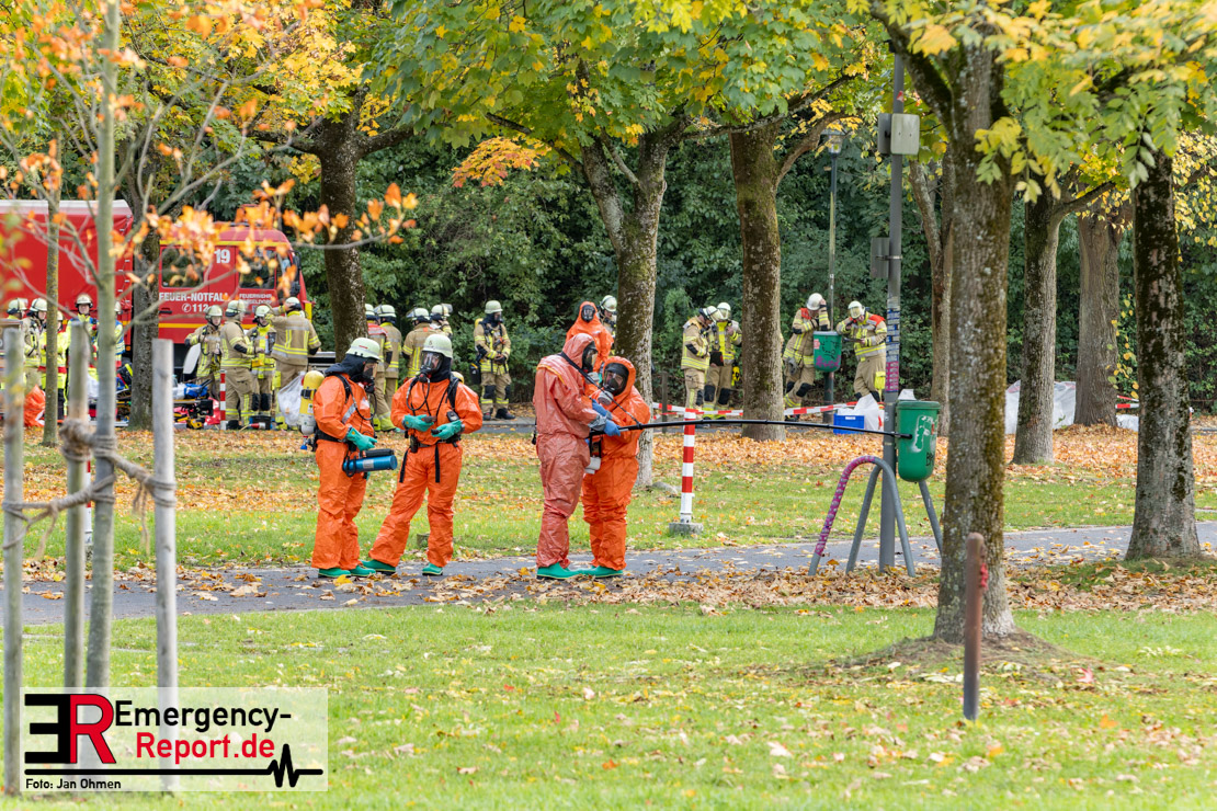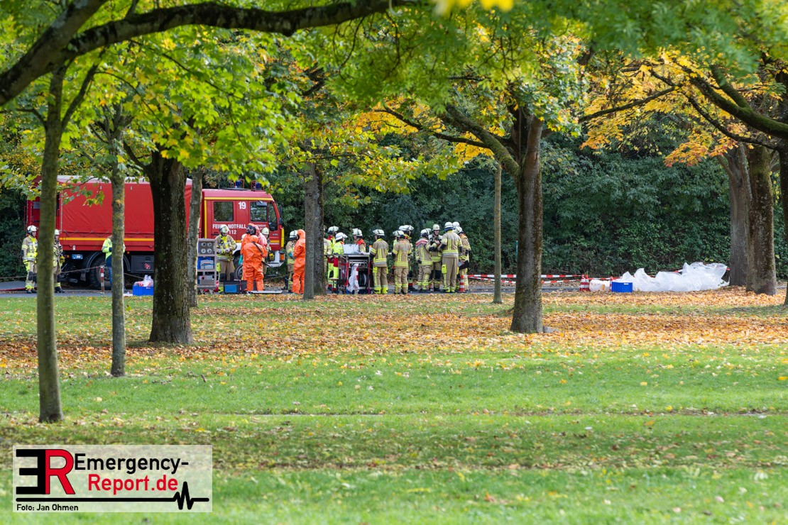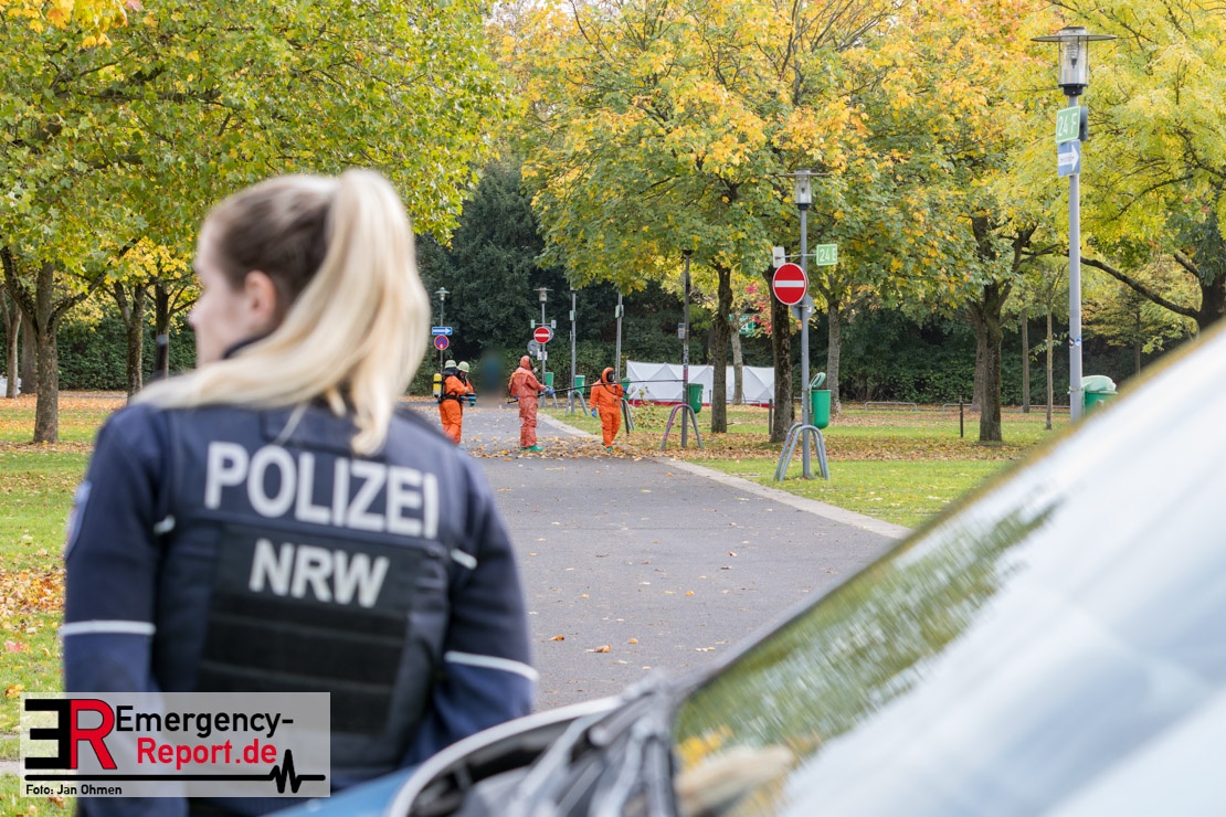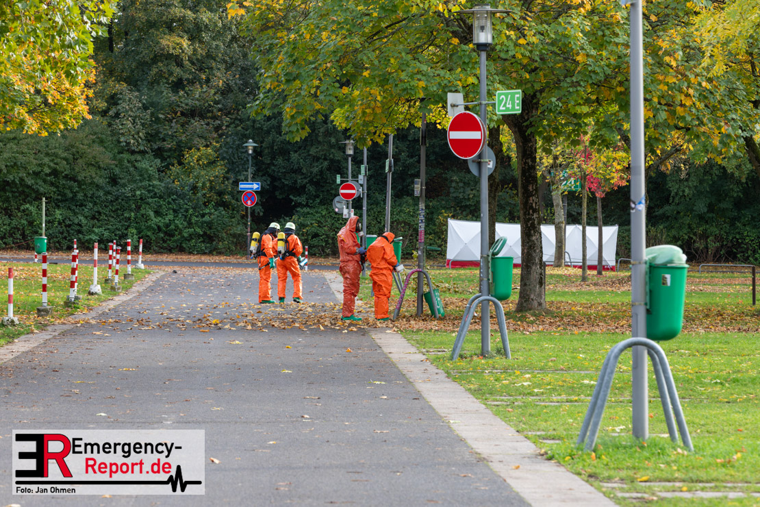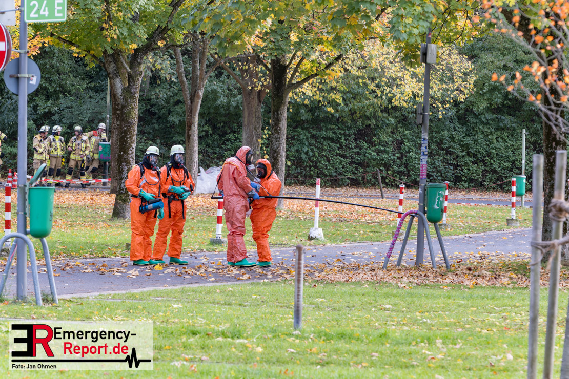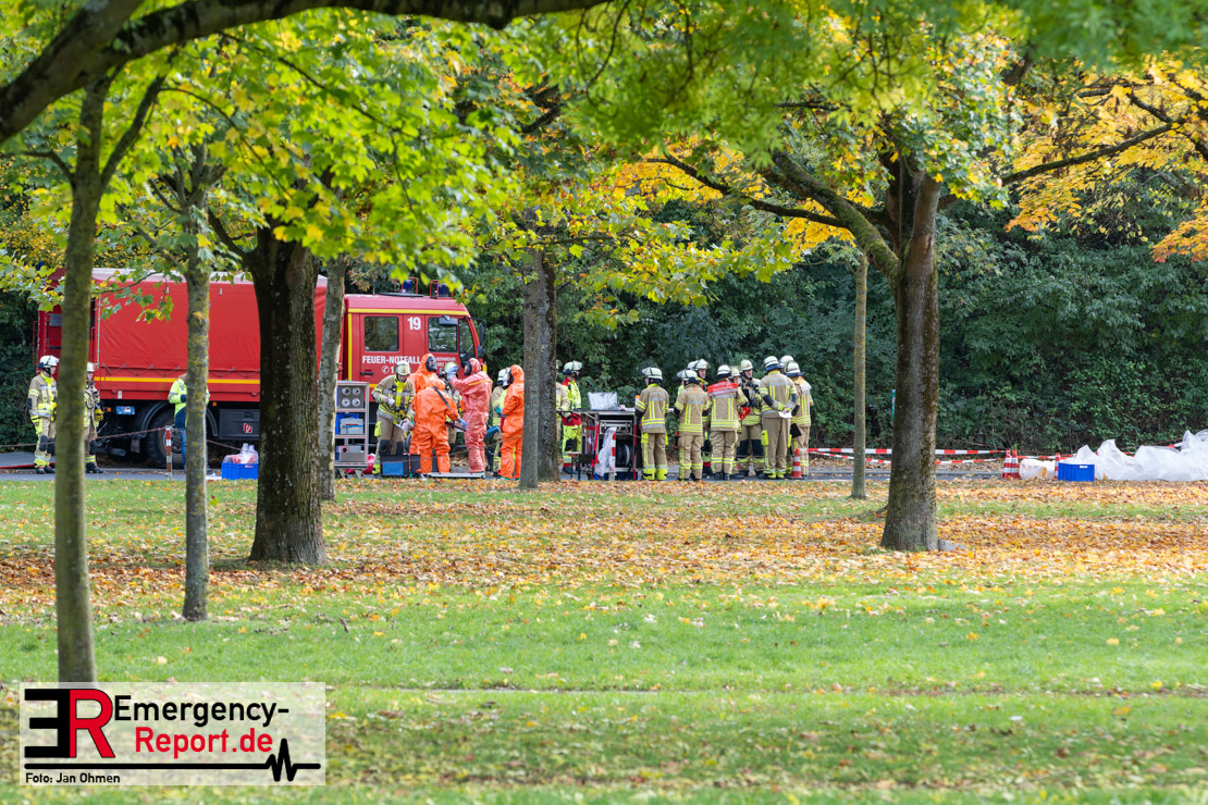 Am Mittwochmittag meldete die Polizei einen möglichen Gefahrstoff auf einem Parkplatz in Stockum an die Leitstelle der Feuerwehr Düsseldorf. Die alarmierten Einsatzkräfte sperrten den Bereich großräumig ab und führten eine Stofferkundung durch. Hierbei konnten keine gefährlichen Stoffe nachgewiesen werden. Verletzt wurde bei dem Einsatz niemand.