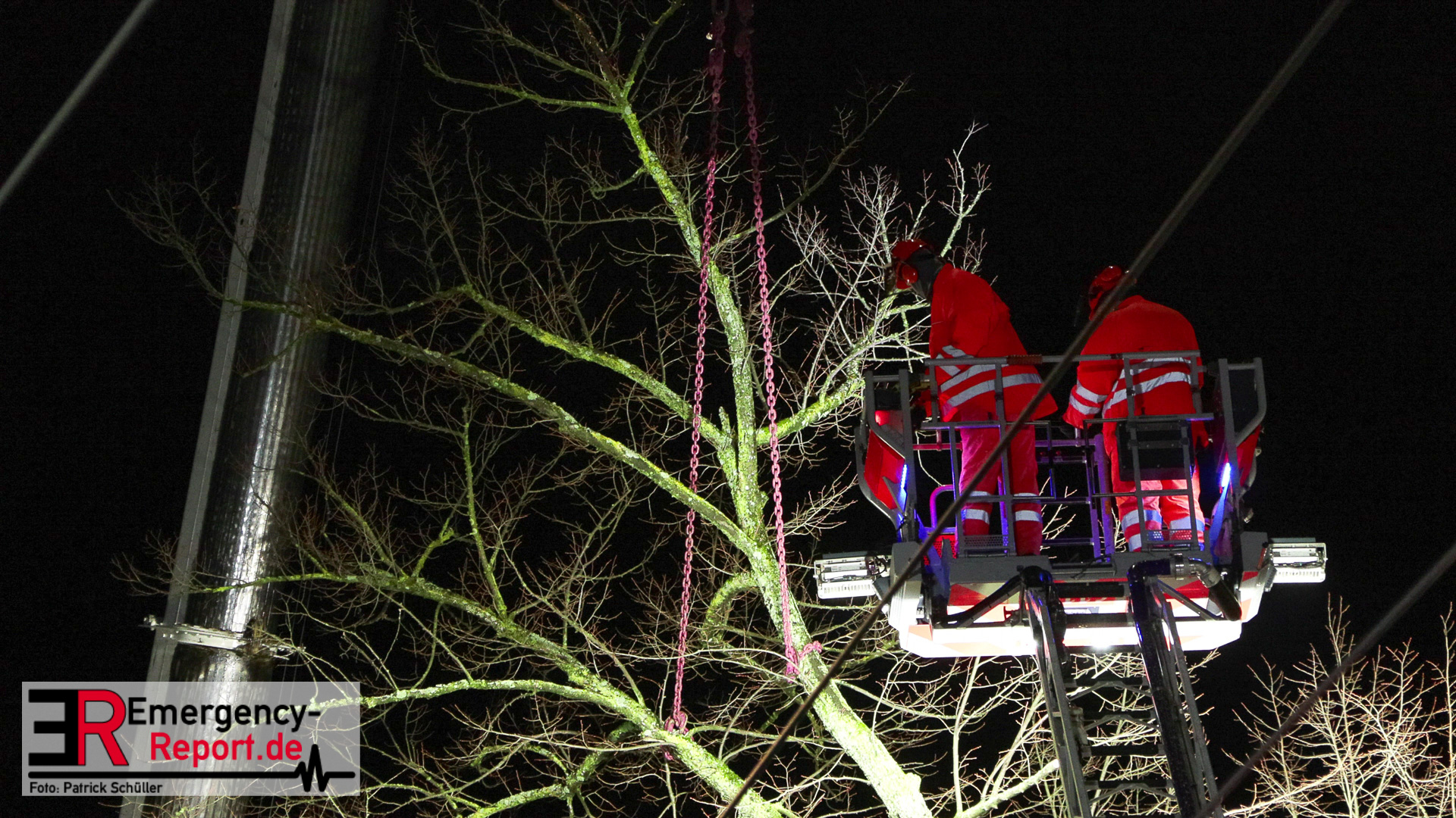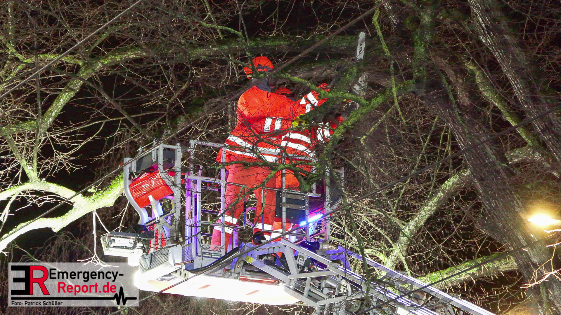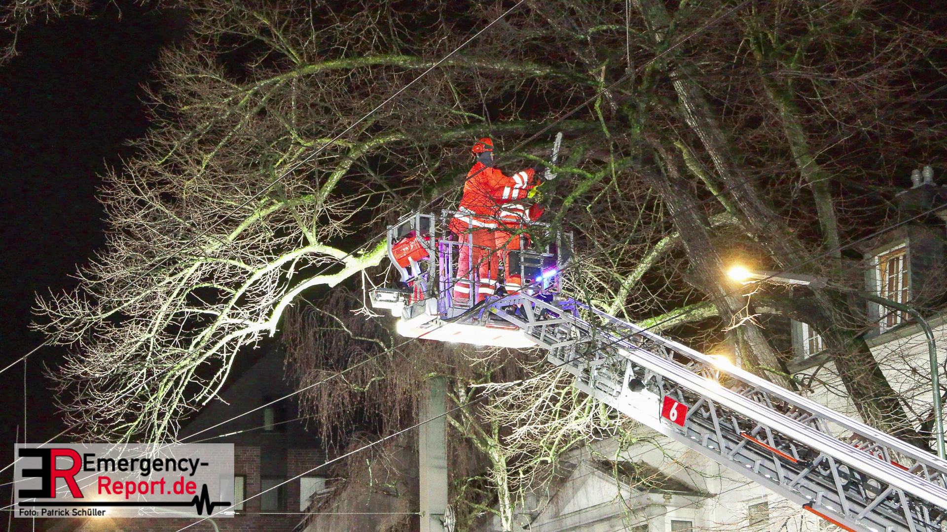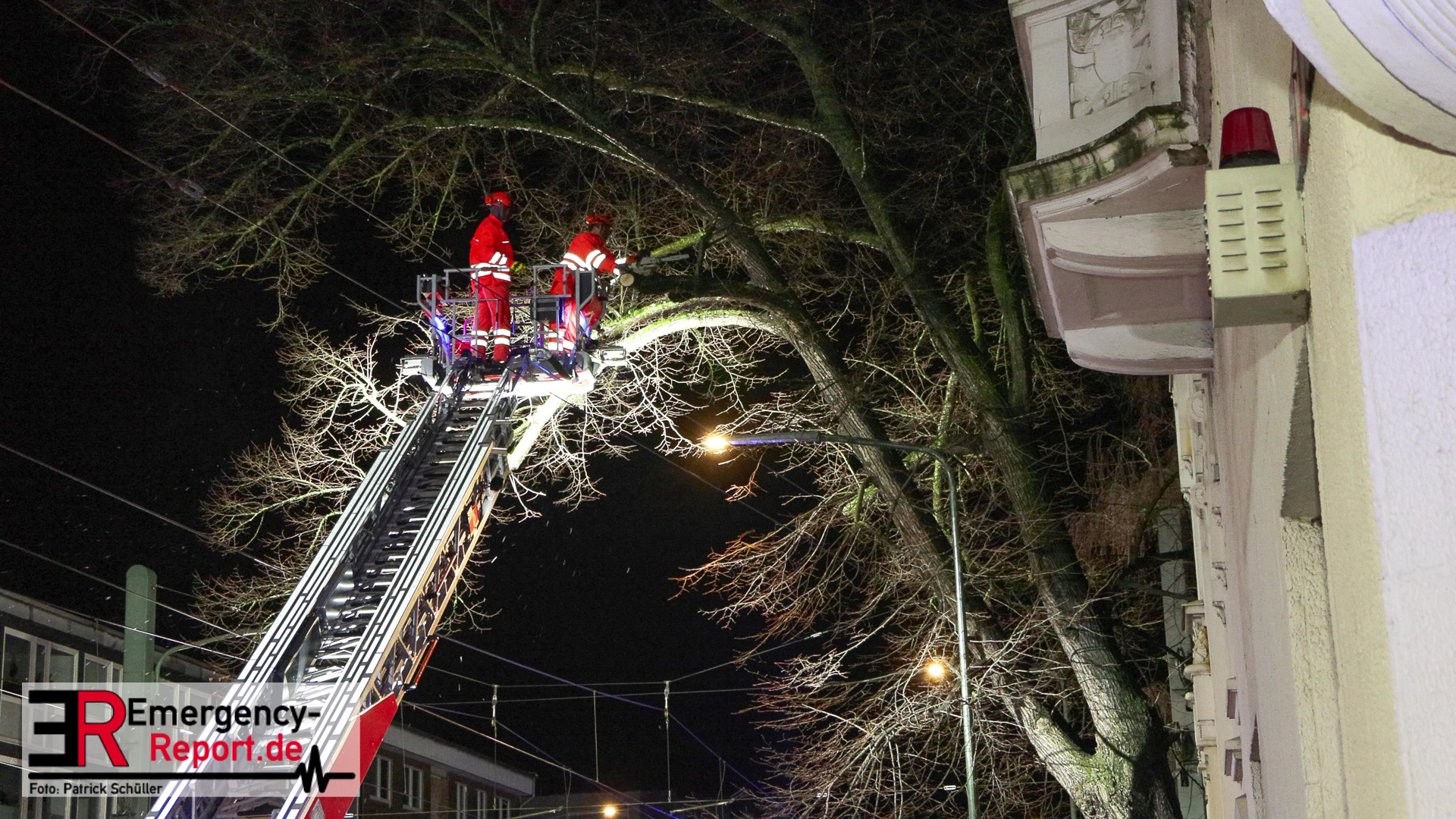 Mehrere Autos aus dem unmittelbaren Gefahrenbereich wurden, durch einen Abschleppwagen, umgeparkt. Anschließend wurde damit begonnen den Baum, über eine Drehleiter, abzutragen. Große Äste und der Stamm wurden durch den Feuerwehrkran