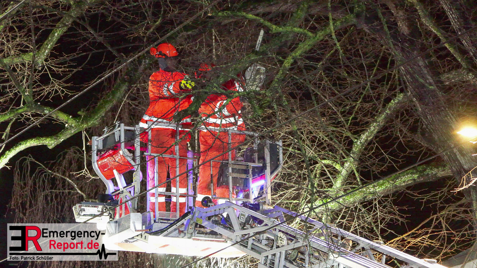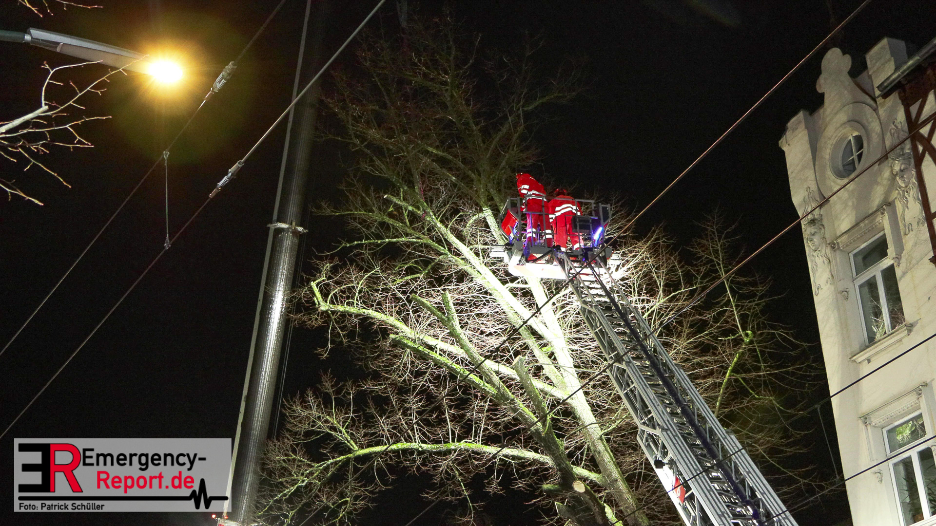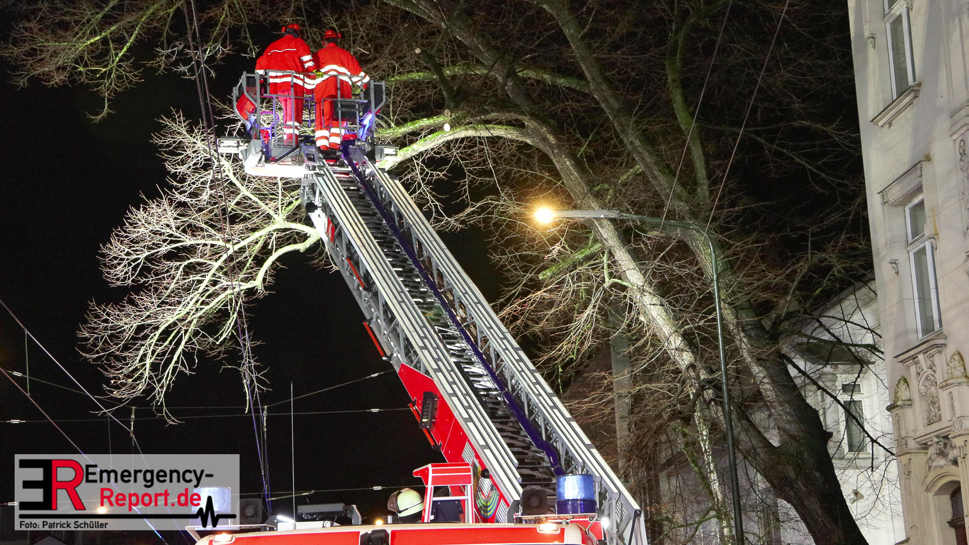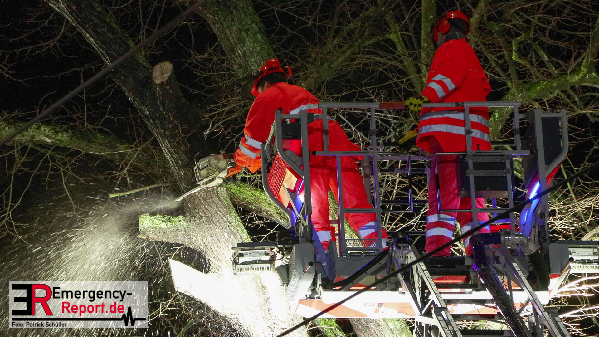Mehrere Autos aus dem unmittelbaren Gefahrenbereich wurden, durch einen Abschleppwagen, umgeparkt. Anschließend wurde damit begonnen den Baum, über eine Drehleiter, abzutragen. Große Äste und der Stamm wurden durch den Feuerwehrkran
