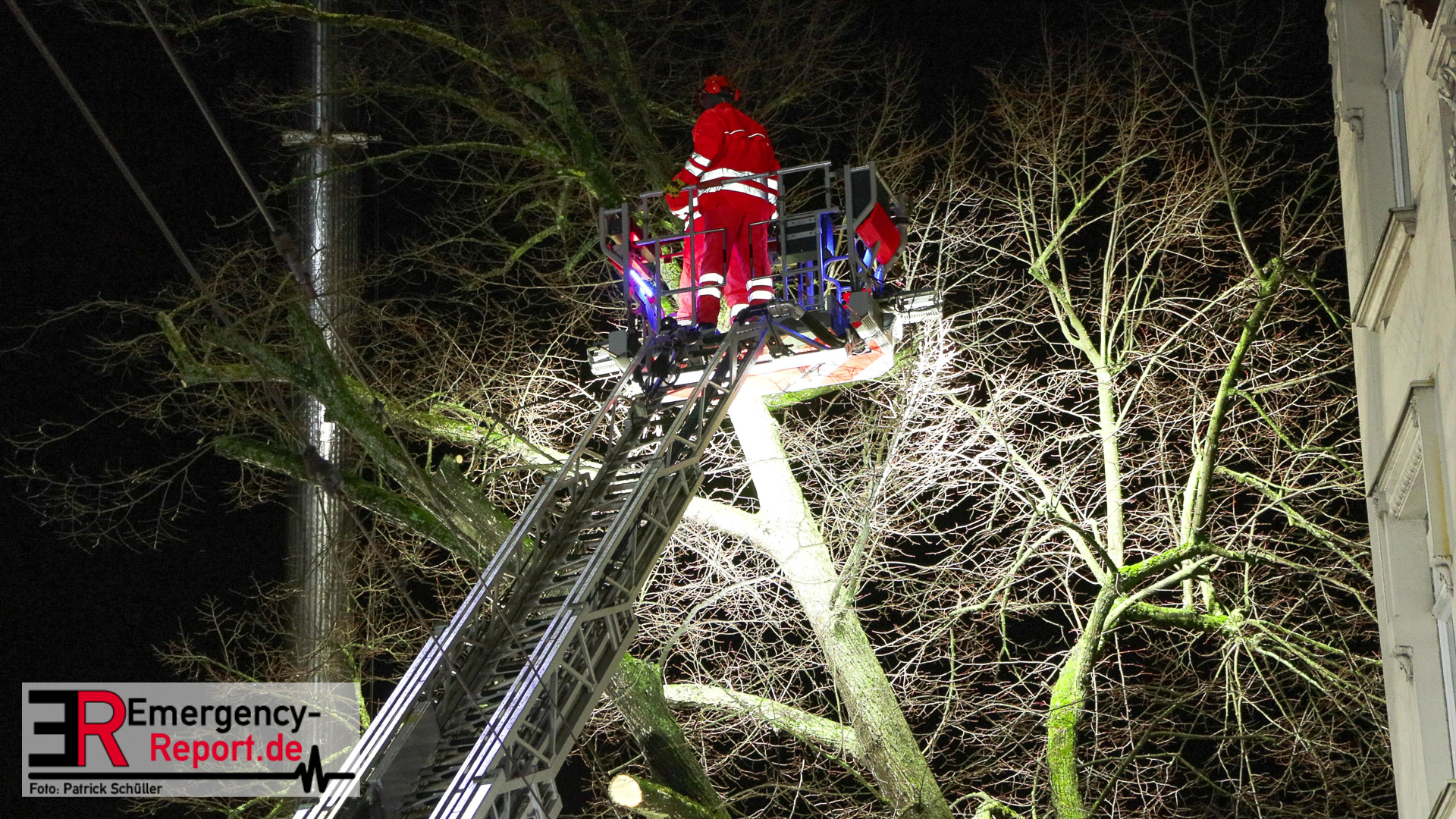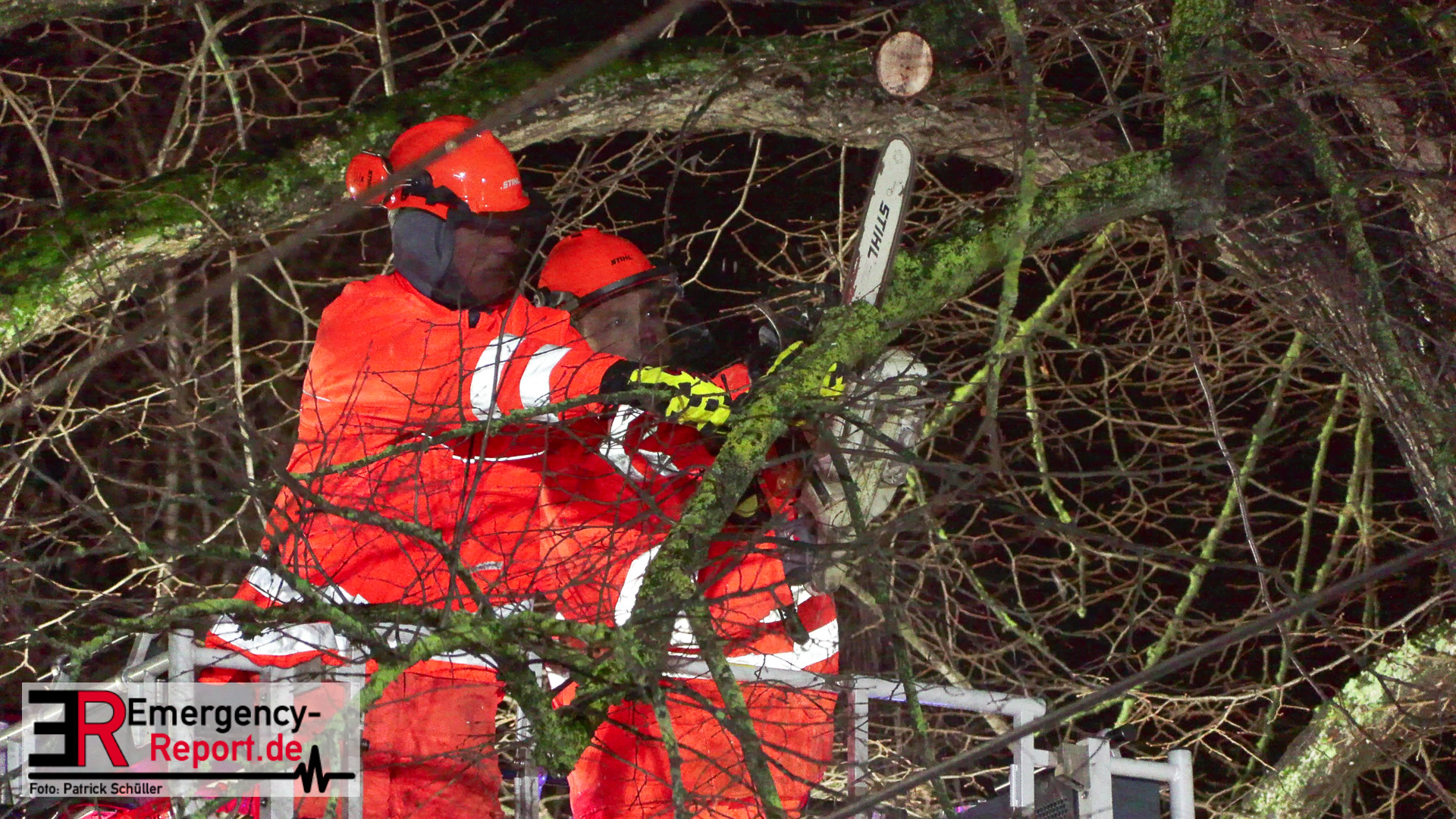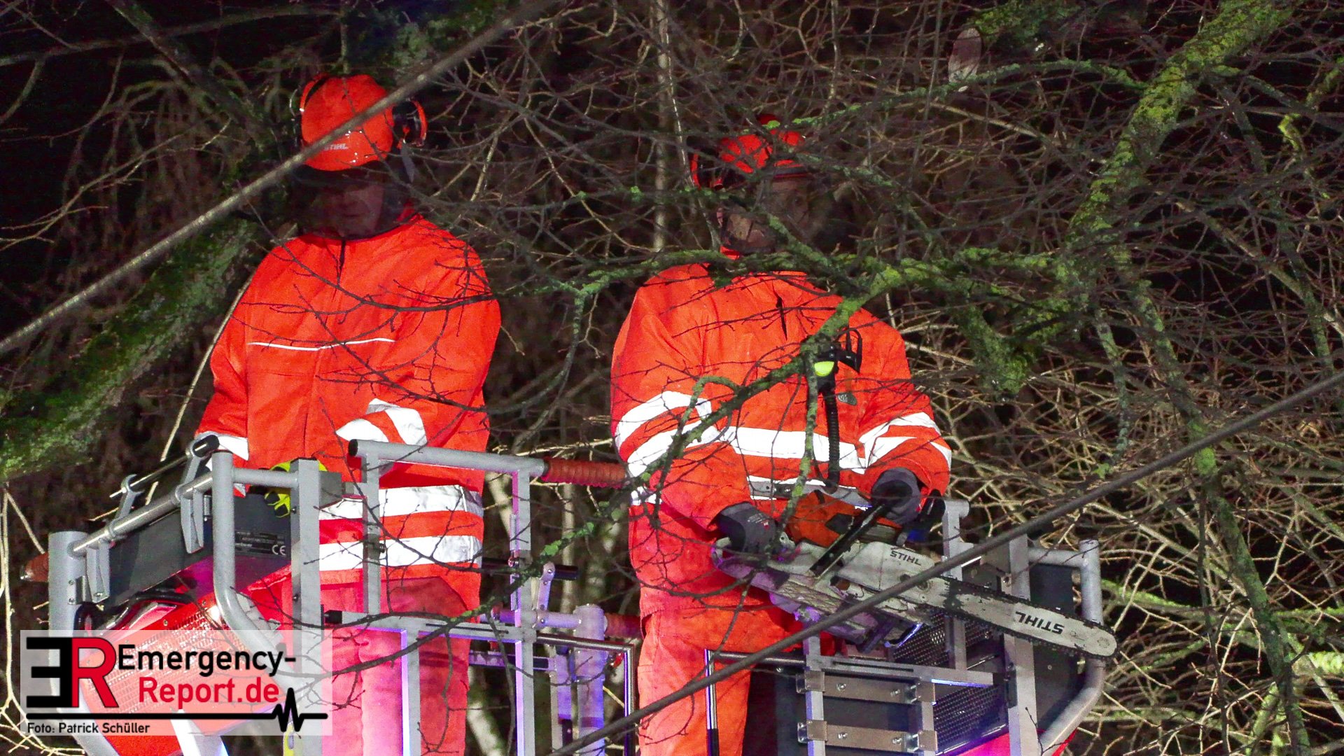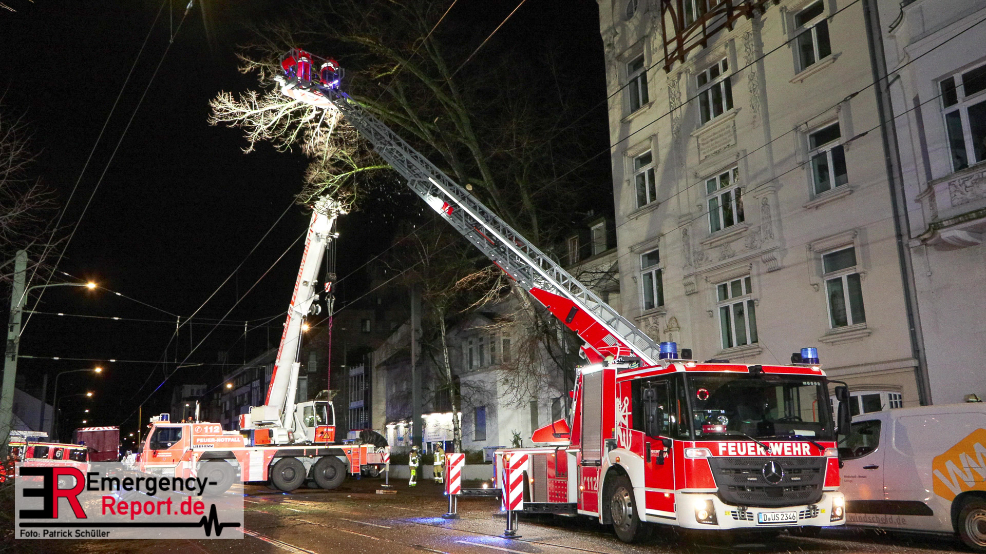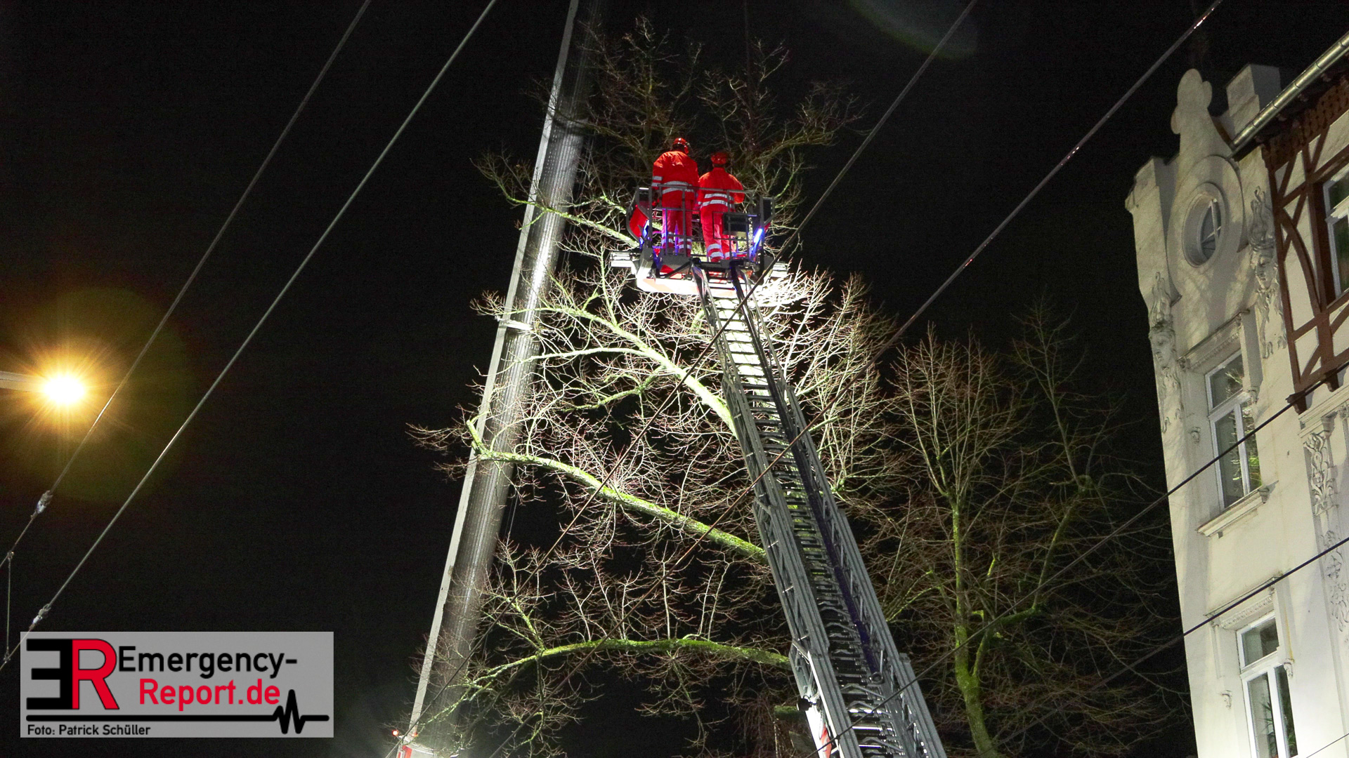 Mehrere Autos aus dem unmittelbaren Gefahrenbereich wurden, durch einen Abschleppwagen, umgeparkt. Anschließend wurde damit begonnen den Baum, über eine Drehleiter, abzutragen. Große Äste und der Stamm wurden durch den Feuerwehrkran