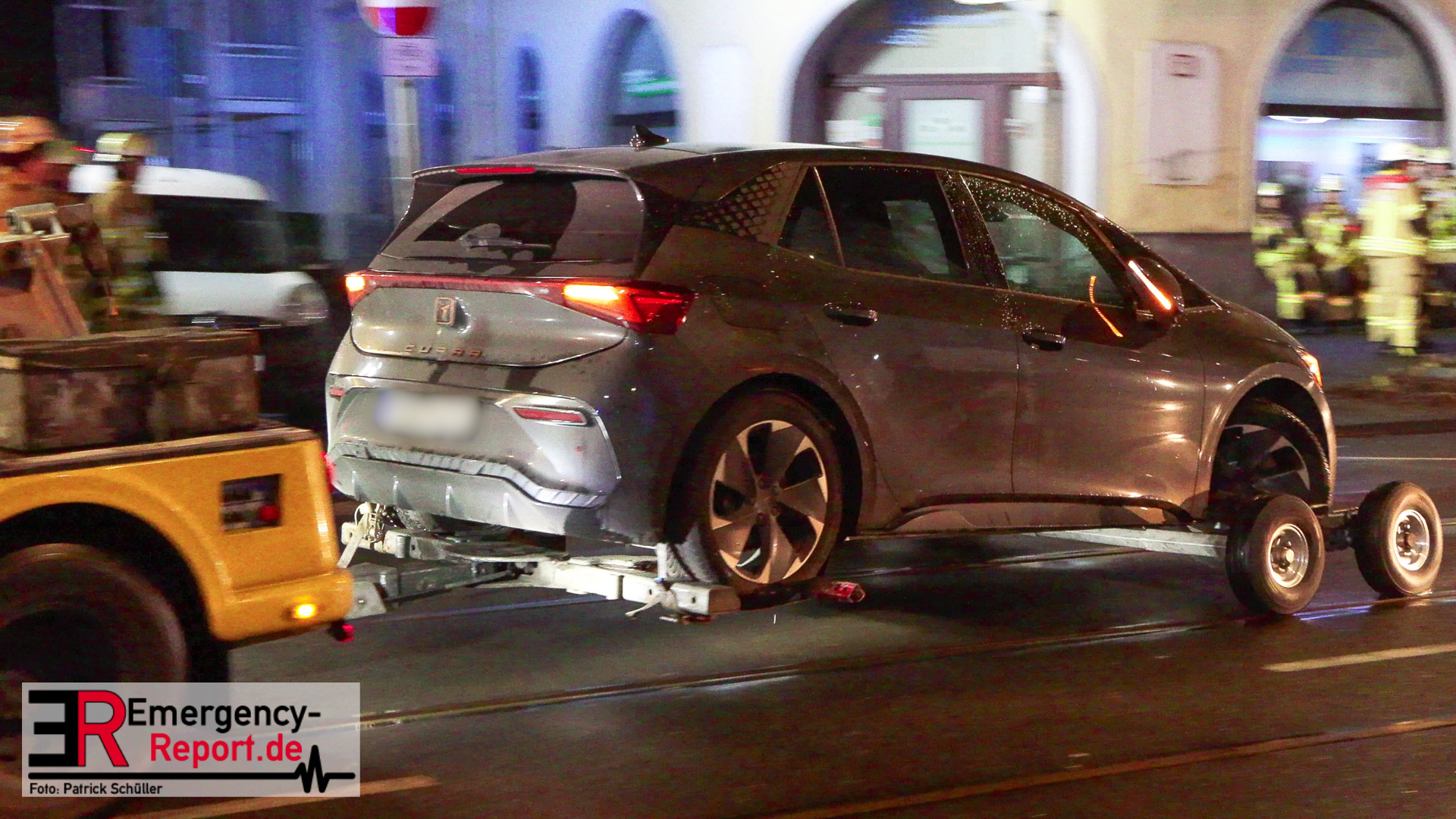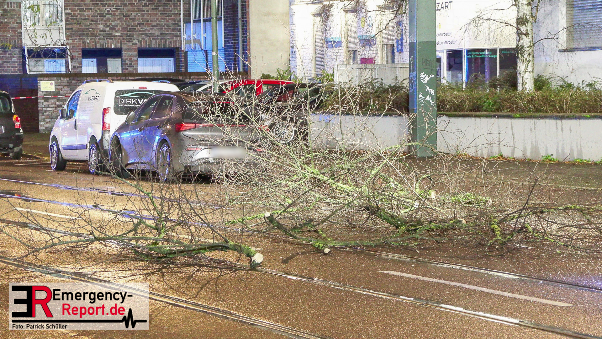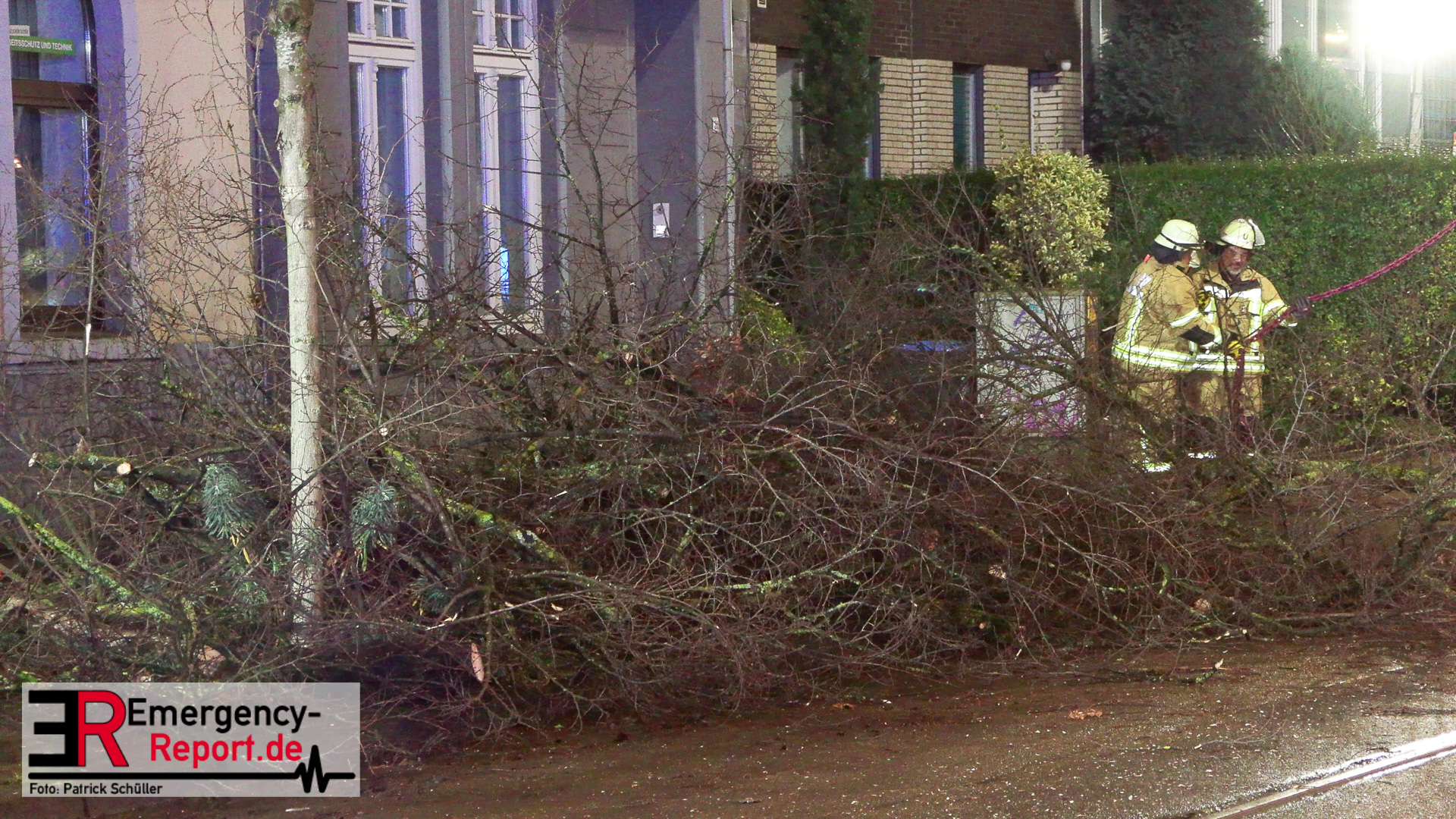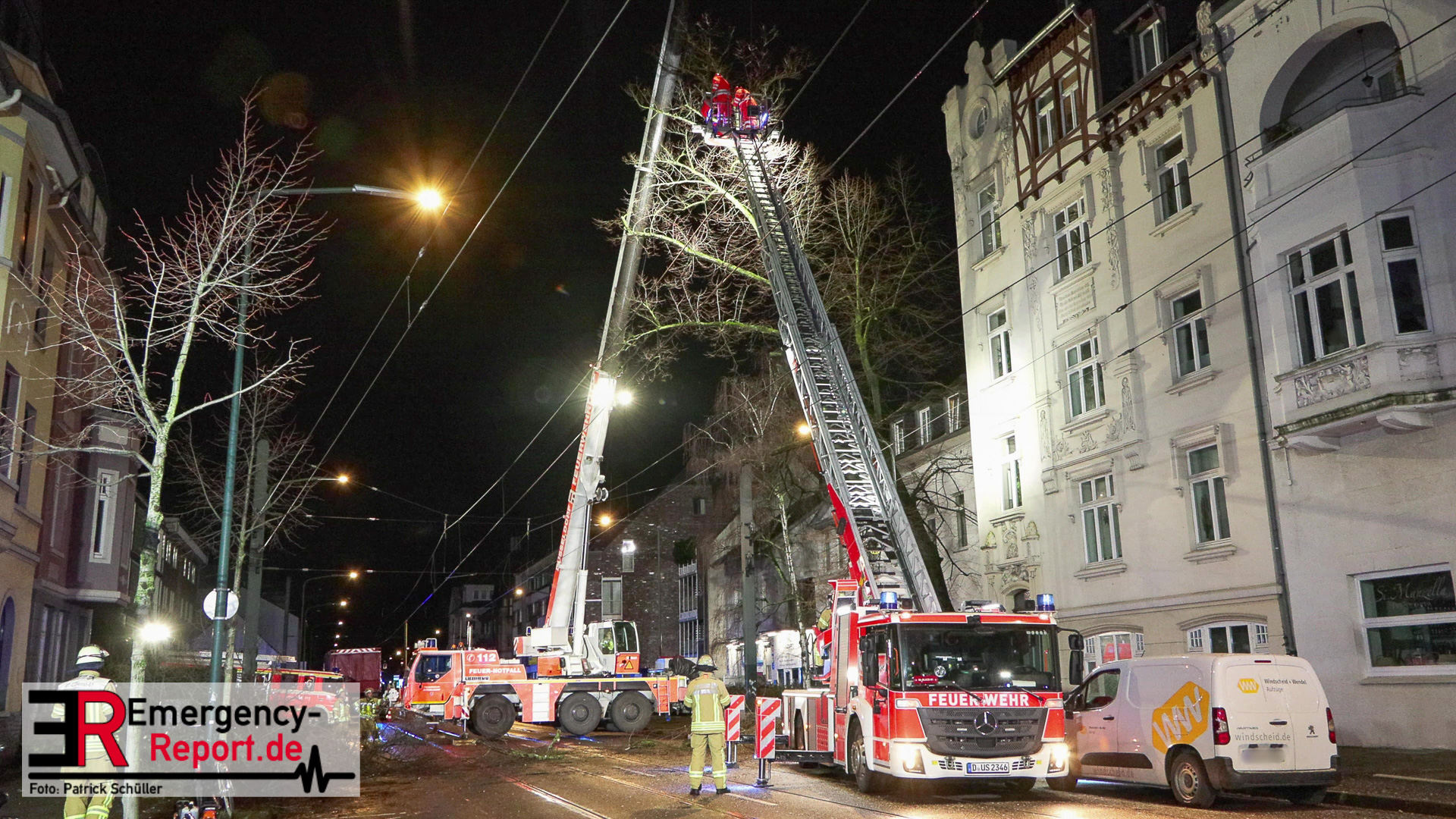 Mehrere Autos aus dem unmittelbaren Gefahrenbereich wurden, durch einen Abschleppwagen, umgeparkt. Anschließend wurde damit begonnen den Baum, über eine Drehleiter, abzutragen. Große Äste und der Stamm wurden durch den Feuerwehrkran