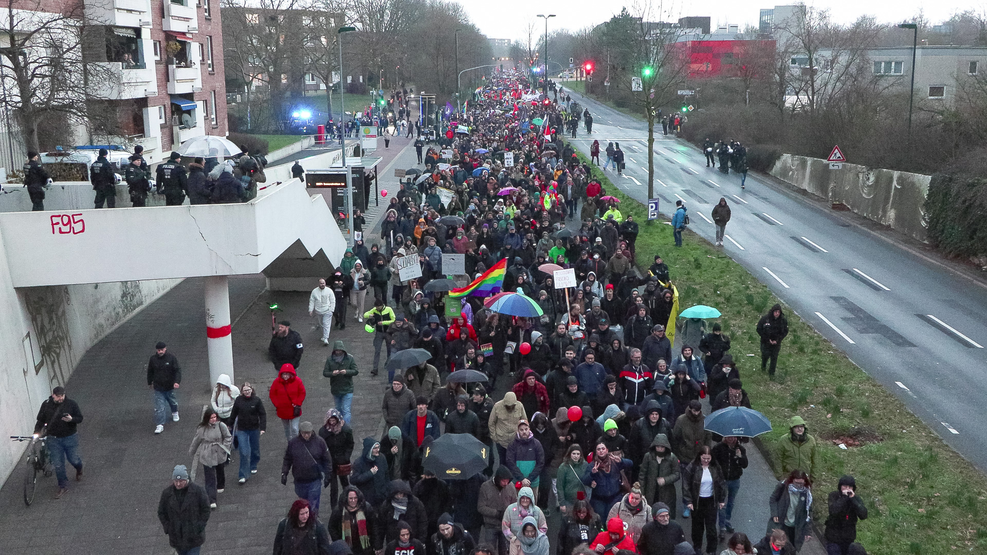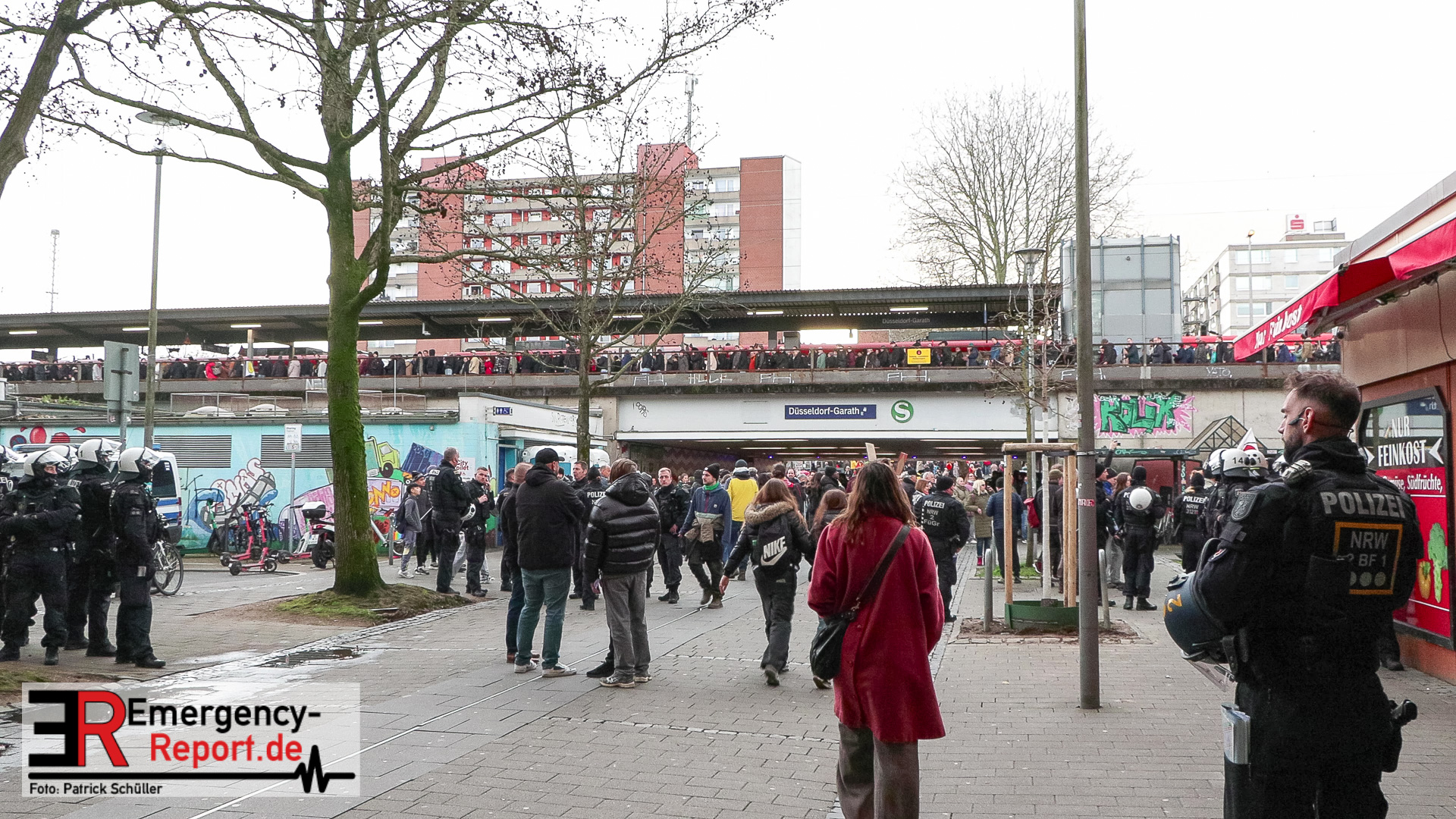 In der Zeit von 17:00 bis 21:00 Uhr wurden durch das Bündnis „Garath tolerant und weltoffen“ Kundgebungen an unterschiedlichen Plätzen durchgeführt. Der Schwerpunkt lag vor dem Haupteingang des Kulturhauses auf dem Nikolaus-Groß-Platz. Parallel hierzu fand eine Kundgebung im Bewegungspark Garath statt. Als drittes wurde ein Aufzug in der Zeit von 17:00 bis 19:00 Uhr vom Park and Ride Parkplatz über die Koblenzer Straße bis in die unmittelbare Nähe des Bürgerzentrums auf der Frankfurter Straße durchgeführt. Zudem fand eine Mahnwache im Bereich der Fritz-Erler-Straße in Höhe der S-Bahn Haltestelle Garath statt. Am Rande des Versammlungsgeschehens kam es zu vereinzelten Versuchen, die polizeilichen Absperrungen zu durchbrechen. Durch die Polizeikräfte musste hier Pfefferspray eingesetzt werden. Die Versammlung im Kulturhaus Süd mit geschätzten 300 Teilnehmenden konnte ohne größere Verzögerungen beginnen und endete ohne nennenswerte Störungen gegen 20:40 Uhr. Insgesamt schätzte die Polizei die Teilnehmendenzahl des Gegenprotestes auf ungefähr 7.000. Die Polizei fertigte bislang neun Strafanzeigen unter anderem wegen des Verdachts der Körperverletzung und der Beleidigung. Im Einsatz wurden vier Polizeibeamte/-innen leicht verletzt. Eine Person musste vorübergehend in Gewahrsam genommen werden.