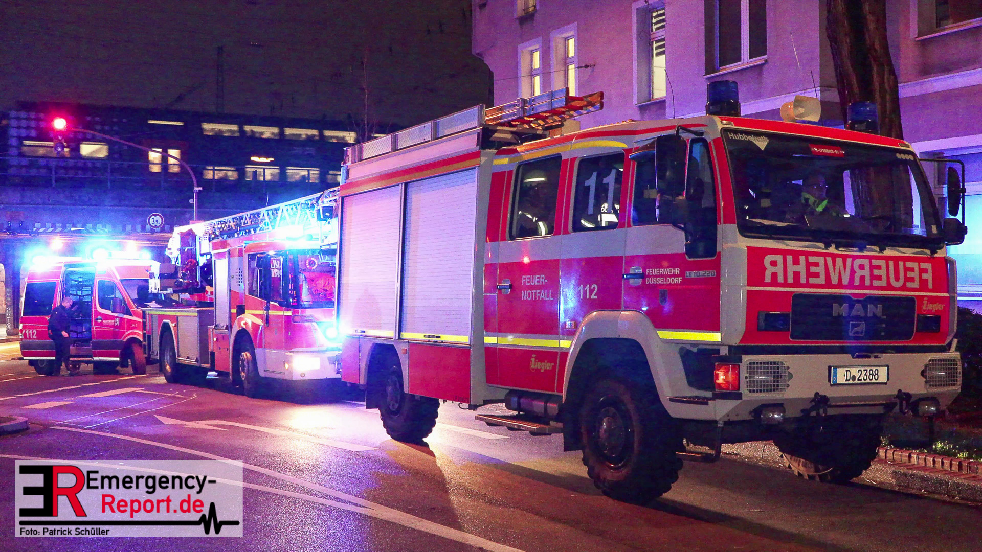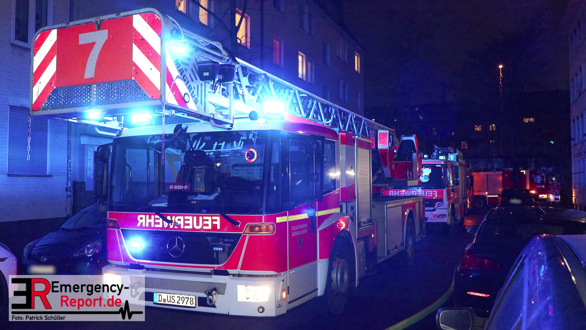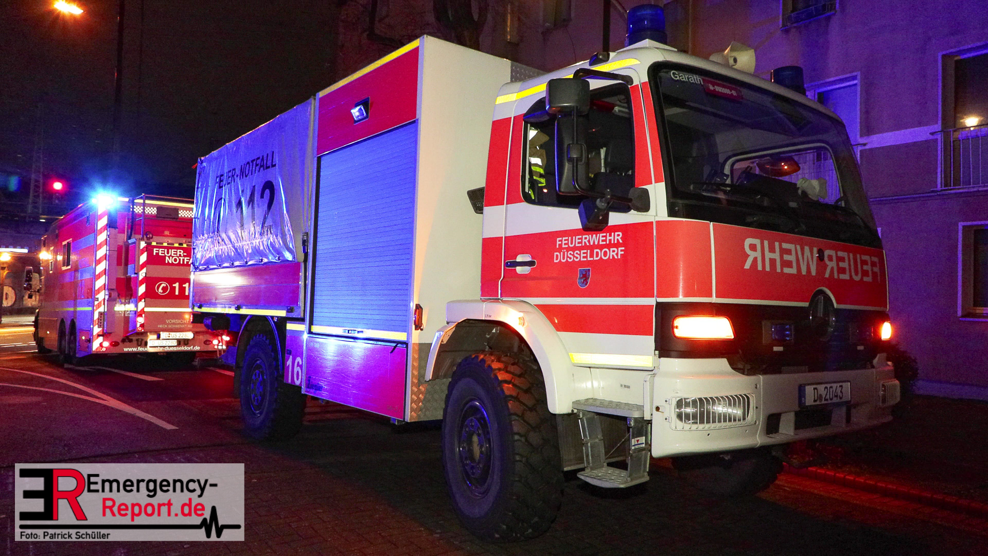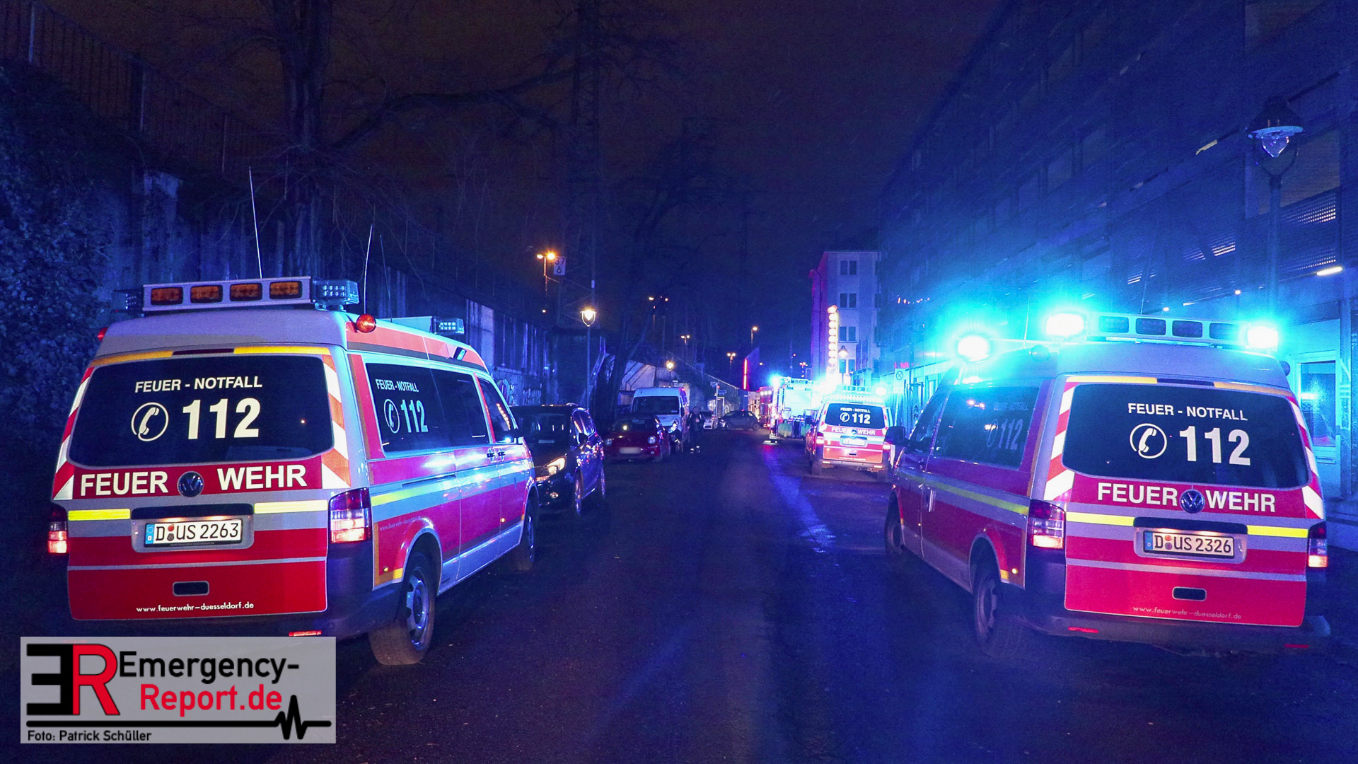 In der Industriestraße brannte laut dem Anrufer zunächst nur ein Mülleimer, im Bereich eines Gebäudedurchgangs. Noch während der Leitstellendisponent den Anrufer befragte, hörte er deutliche Brandgeräusche. Es wurden sofort zwei Löschzüge alarmiert. Beim Eintreffen an der Einsatzstelle bot sich den Einsatzkräften folgendes Bild: Die Flammen schlugen sowohl an der vorderen-, als auch an der hinteren Gebäudefront nach oben. Dort hatten sie bereits die Fensterscheiben mehrerer Wohnungen in verschiedenen Etagen zerstört. Somit brannte es zeitgleich in mehreren Wohnungen und den Fassaden. An vielen Fenstern machten sich Menschen bemerkbar, die durch die Feuerwehr gerettet werden mussten. Parallel wurden über zwei Drehleiterfahrzeuge als auch über den Treppenraum über 30 Menschen gerettet. Zwei Personen wurden lebensgefährlich verletzt. Der Brand entwickelte sich indes in den Dachstuhl und in das angrenzende Gebäude. Ein massiver Einsatz von ca. 140 Feuerwehr und ca. 60 Rettungsdienstkräften waren notwendig. Ebenfalls wurde im Bereich Rettungsdienst Unterstützung aus dem Rheinkreis Neuss angefordert, um gemeinsam die Patienten in die umliegenden Krankenhäuser zu transportieren. Für manche Bewohner stellt die Stadt Düsseldorf eine Notunterkunft bereit. Die beiden betroffenen Wohnhäuser sind zurzeit nicht bewohnbar, ein angrenzendes Altenheim konnte geschützt werden und ist nicht betroffen. Akut löscht die Feuerwehr noch Glutnester, wodurch ein Ende des Einsatzes sich bis in den Heiligen Abend ziehen wird.