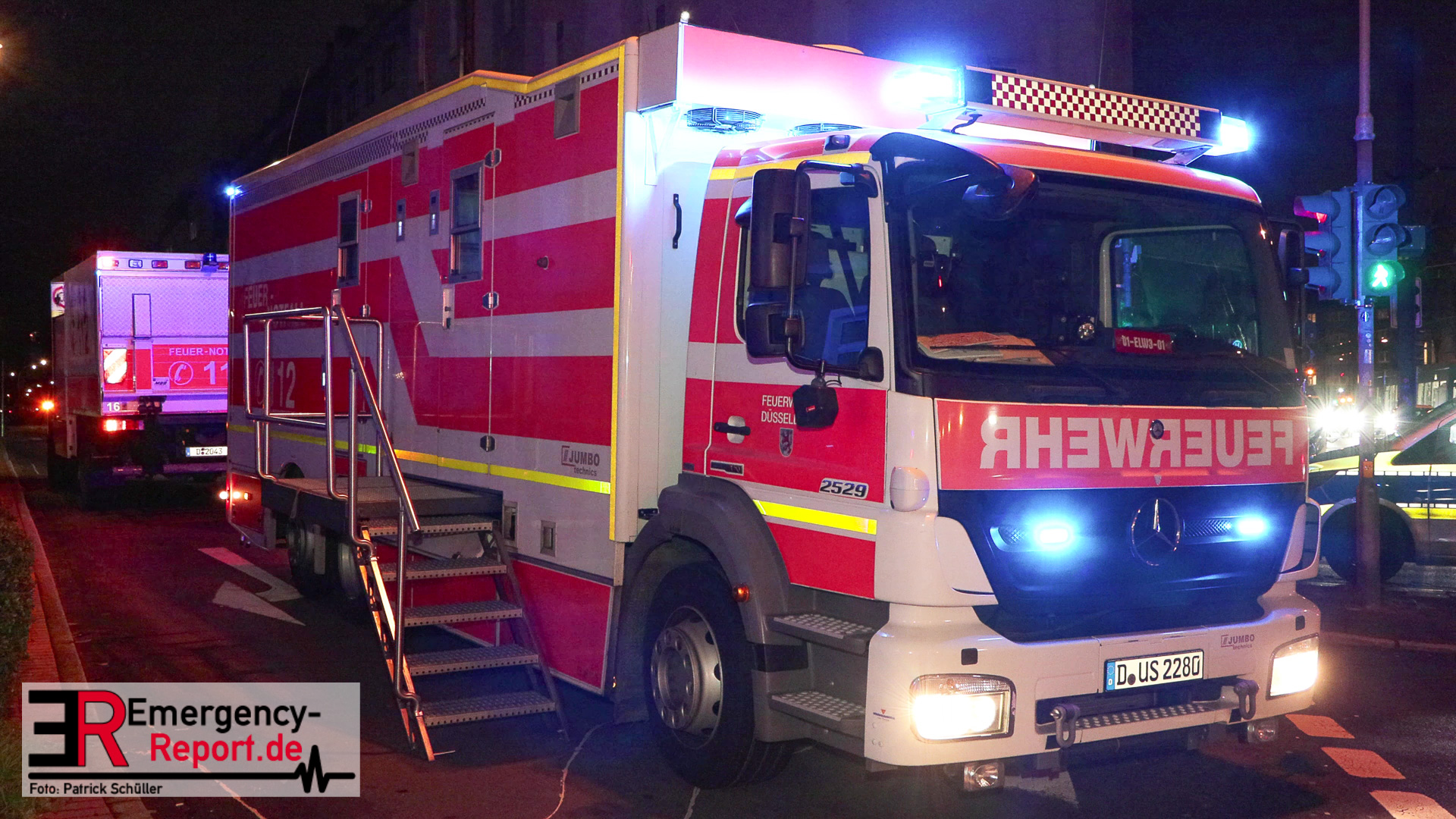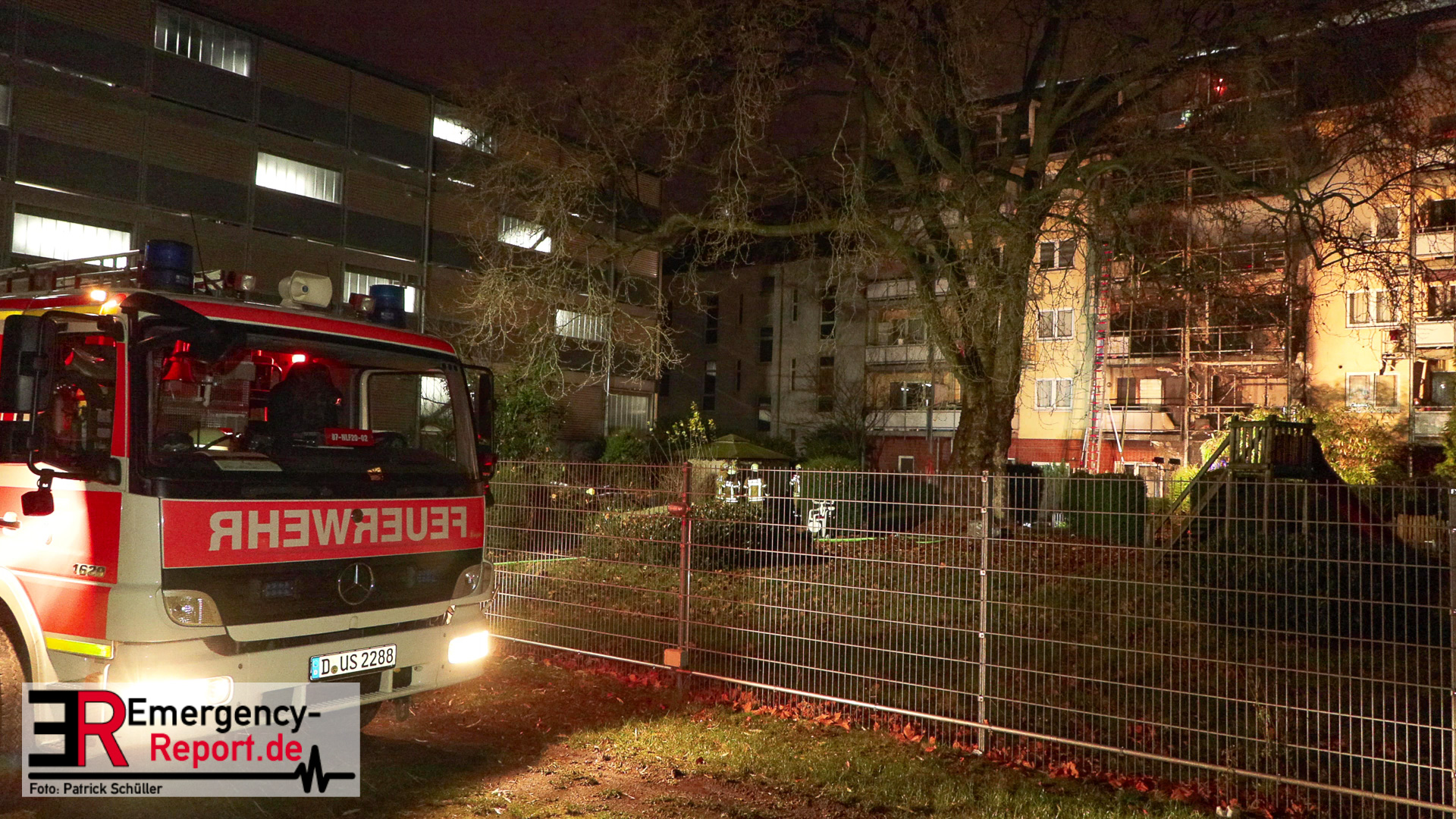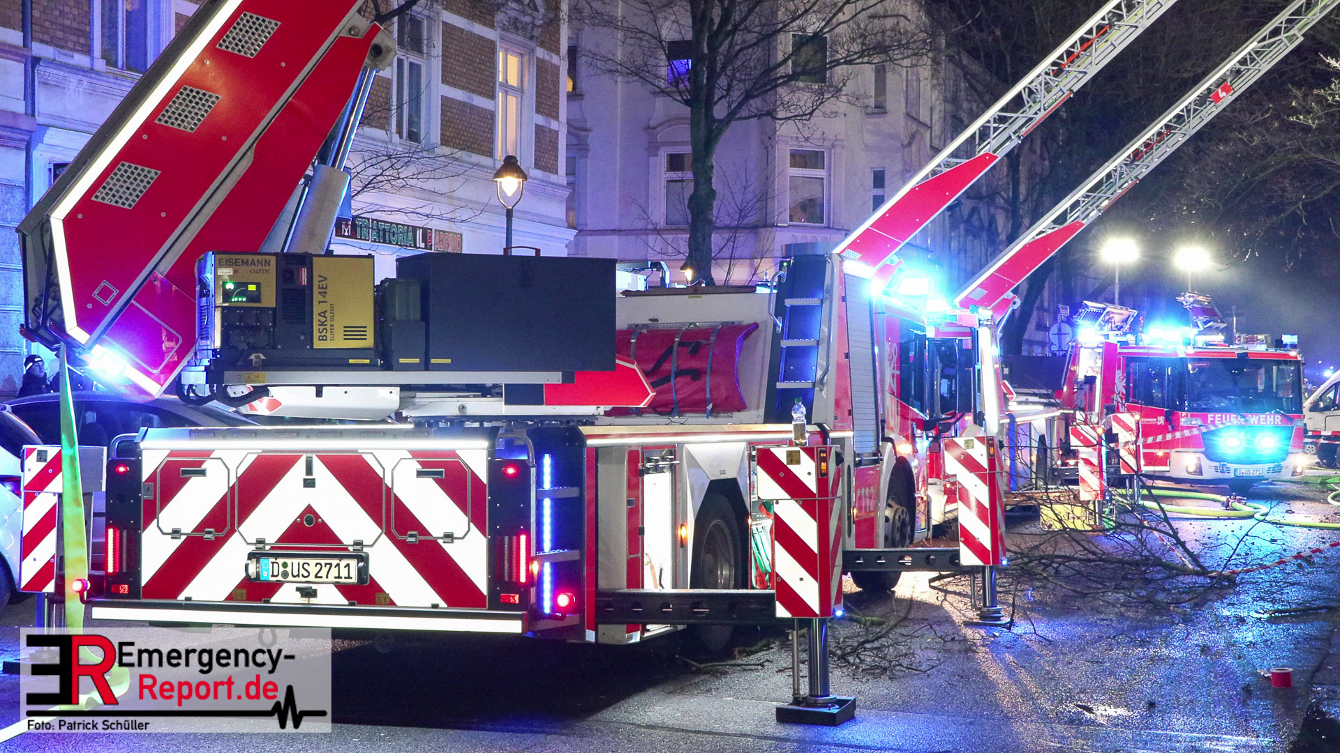 In der Industriestraße brannte laut dem Anrufer zunächst nur ein Mülleimer, im Bereich eines Gebäudedurchgangs. Noch während der Leitstellendisponent den Anrufer befragte, hörte er deutliche Brandgeräusche. Es wurden sofort zwei Löschzüge alarmiert. Beim Eintreffen an der Einsatzstelle bot sich den Einsatzkräften folgendes Bild: Die Flammen schlugen sowohl an der vorderen-, als auch an der hinteren Gebäudefront nach oben. Dort hatten sie bereits die Fensterscheiben mehrerer Wohnungen in verschiedenen Etagen zerstört. Somit brannte es zeitgleich in mehreren Wohnungen und den Fassaden. An vielen Fenstern machten sich Menschen bemerkbar, die durch die Feuerwehr gerettet werden mussten. Parallel wurden über zwei Drehleiterfahrzeuge als auch über den Treppenraum über 30 Menschen gerettet. Zwei Personen wurden lebensgefährlich verletzt. Der Brand entwickelte sich indes in den Dachstuhl und in das angrenzende Gebäude. Ein massiver Einsatz von ca. 140 Feuerwehr und ca. 60 Rettungsdienstkräften waren notwendig. Ebenfalls wurde im Bereich Rettungsdienst Unterstützung aus dem Rheinkreis Neuss angefordert, um gemeinsam die Patienten in die umliegenden Krankenhäuser zu transportieren. Für manche Bewohner stellt die Stadt Düsseldorf eine Notunterkunft bereit. Die beiden betroffenen Wohnhäuser sind zurzeit nicht bewohnbar, ein angrenzendes Altenheim konnte geschützt werden und ist nicht betroffen. Akut löscht die Feuerwehr noch Glutnester, wodurch ein Ende des Einsatzes sich bis in den Heiligen Abend ziehen wird.