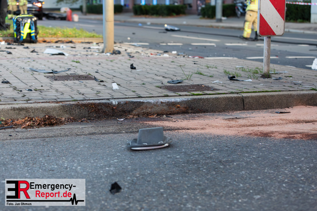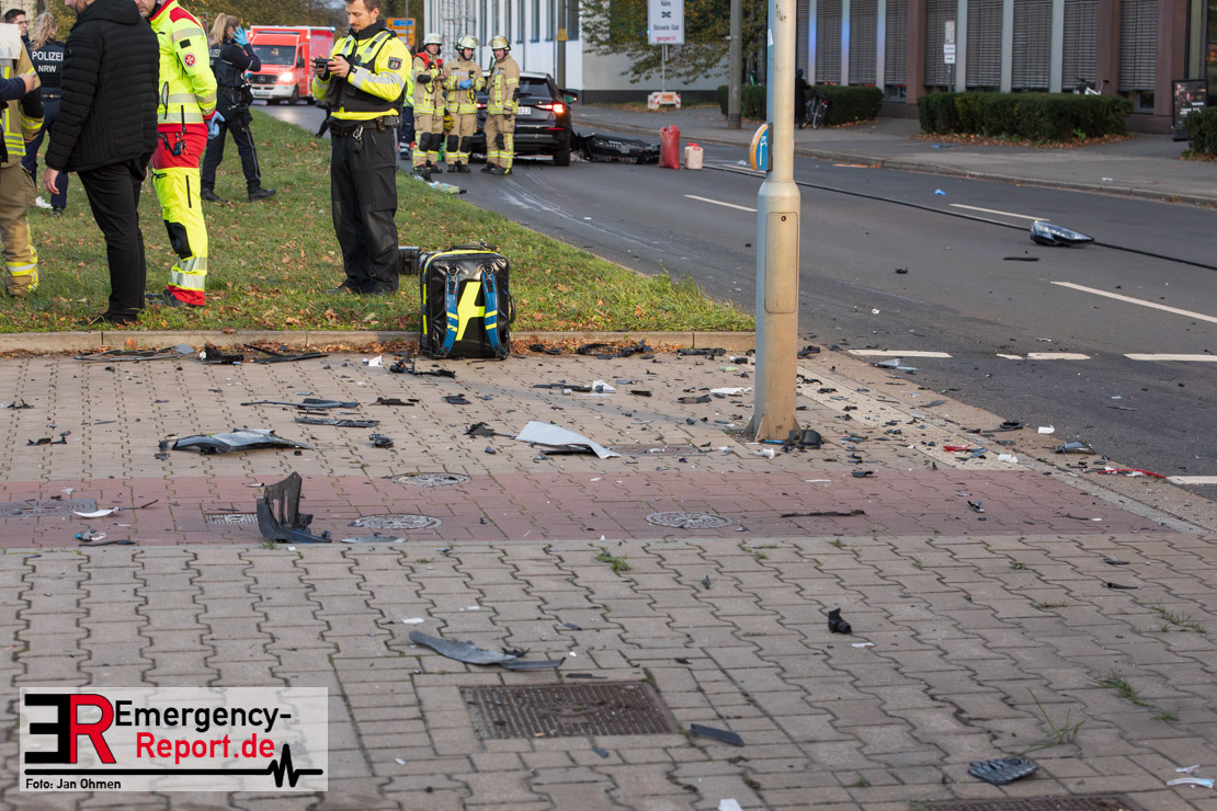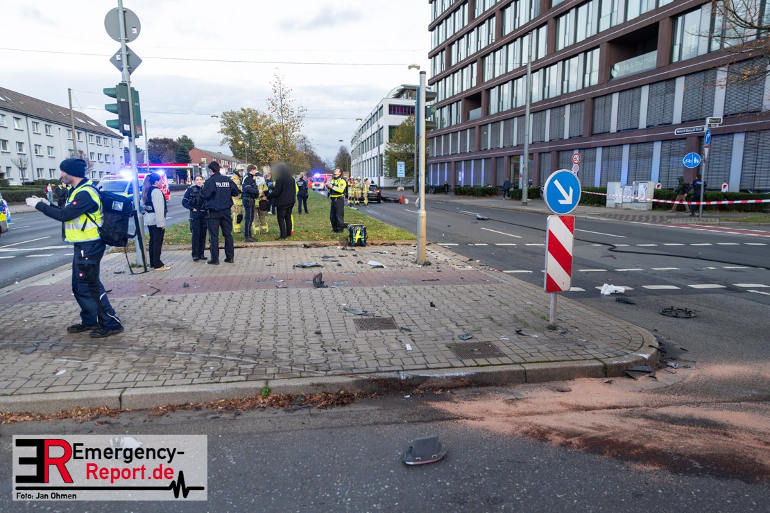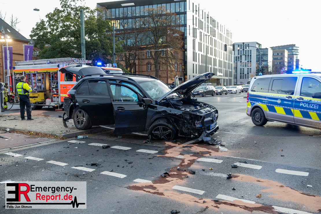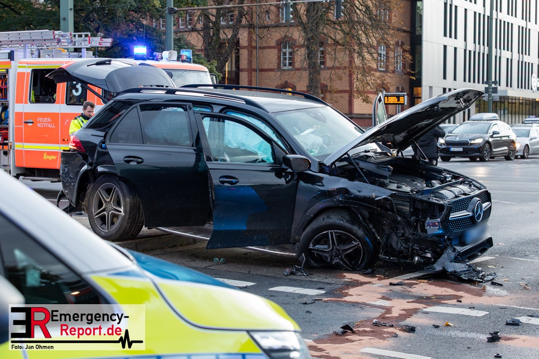 Nach den bisherigen Erkenntnissen war ein 19-Jähriger mit seinem Mercedes Benz auf der Johannstraße in Richtung Heinrich-Erhardt-Straße unterwegs. Nachdem er zunächst einen der Fahrstreifen für Linksabbieger genutzt hatte, passierte er mehrere Fahrzeuge, die auf den Spuren für den Geradeausverkehr warteten, um dann spontan selber geradeaus zu fahren. Es kam zum Zusammenstoß mit dem Audi eines 28-Jährigen, der bei Grünlicht von der Ulmenstraße in den Kreuzungsbereich stadtauswärts eingefahren war. Durch die Wucht des Aufpralls schleuderte der Audi nach rechts und erfasste eine 72 Jahre alte Fußgängerin, die die Heinrich-Erhardt-Straße überqueren wollte. Ein drittes Auto wurde leicht beschädigt. Ein Krankenwagen brachte die lebensgefährlich verletzte Seniorin in eine Klinik. In den beiden Unfallfahrzeugen wurden die beiden Fahrer sowie ihre 18 und 28 Jahre alten Beifahrer leicht verletzt. Ein Verkehrsunfall-Team sicherte die Spuren an der Unfallstelle. Während der Unfallaufnahme kam es zu starken Beeinträchtigungen des Individualverkehrs sowie mehrerer Bus- und Straßenbahnverbindungen. Die Ermittlungen zum genauen Hergang dauern an.