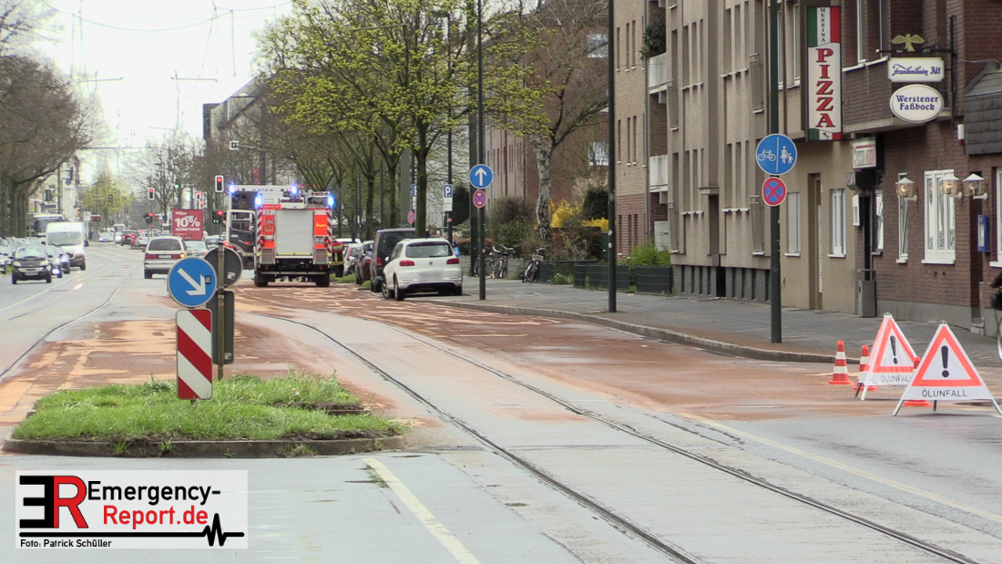 Aus bislang ungeklärter Ursache kam es zu einer Beschädigung an dem 1.000 Liter Dieseltank eines Lkw. Auf einer Strecke von rund drei Kilometern verlor das Fahrzeug 400 Liter Diesel, die Feuerwehr Düsseldorf konnte 600 Liter Diesel abpumpen. Die betroffenen Straßen mussten auf einer Länge von rund drei Kilometern abgestreut werden.