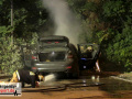 Gegen 00:33 Uhr erhielt ein Streifenteam der Polizei Düsseldorf den Einsatz, dass sich auf einem Parkplatz an der Kesselstraße ein Verkehrsunfall ereignet habe. Die Melder berichteten zudem, dass sie von dem Parkplatz seit geraumer laute Motorengeräusche und Reifenquietschen gehört hätten. An der Örtlichkeit eingetroffen, stellten die Beamten einen BMW fest, aus dessen Fahrzeugfront bereits Flammen schlugen. Der BMW hatte zuvor die Umzäunung des Parkplatzes durchbrochen und stand zum Teil in einer Hecke. Die Feuerwehr konnte den Brand schnell löschen. Große Teile des Innenraums waren jedoch von den Flammen in Mitleidenschaft gezogen worden. Von der Unfallörtlichkeit flüchteten bei Eintreffen des Streifenwagens mehrere Personen. Im Rahmen der Nahbereichsfahndung konnte der mutmaßliche Fahrzeugführer, ein 22-Jähriger aus Düsseldorf mit türkischer Staatsangehörigkeit angetroffen und vorläufig festgenommen werden. Zwei mutmaßliche Beifahrer des jungen Düsseldorfers konnten ebenfalls angetroffen und kontrolliert werden. Während der Sachverhaltsklärung vor Ort stellte sich heraus, dass der 22-Jährige nicht im Besitz einer Fahrerlaubnis ist. Obendrein wurden im Fahrzeug Betäubungsmittel aufgefunden. Bei dem BMW handelte es sich um einen Mietwagen. In einer ersten Einlassung gab der Düsseldorfer an, gefahren zu sein und mit seinen Freunden für den Führerschein geübt zu haben. Ihm wurde eine Blutprobe entnommen. Eine Strafanzeige wegen Fahrens ohne Fahrerlaubnis wurde gefertigt.