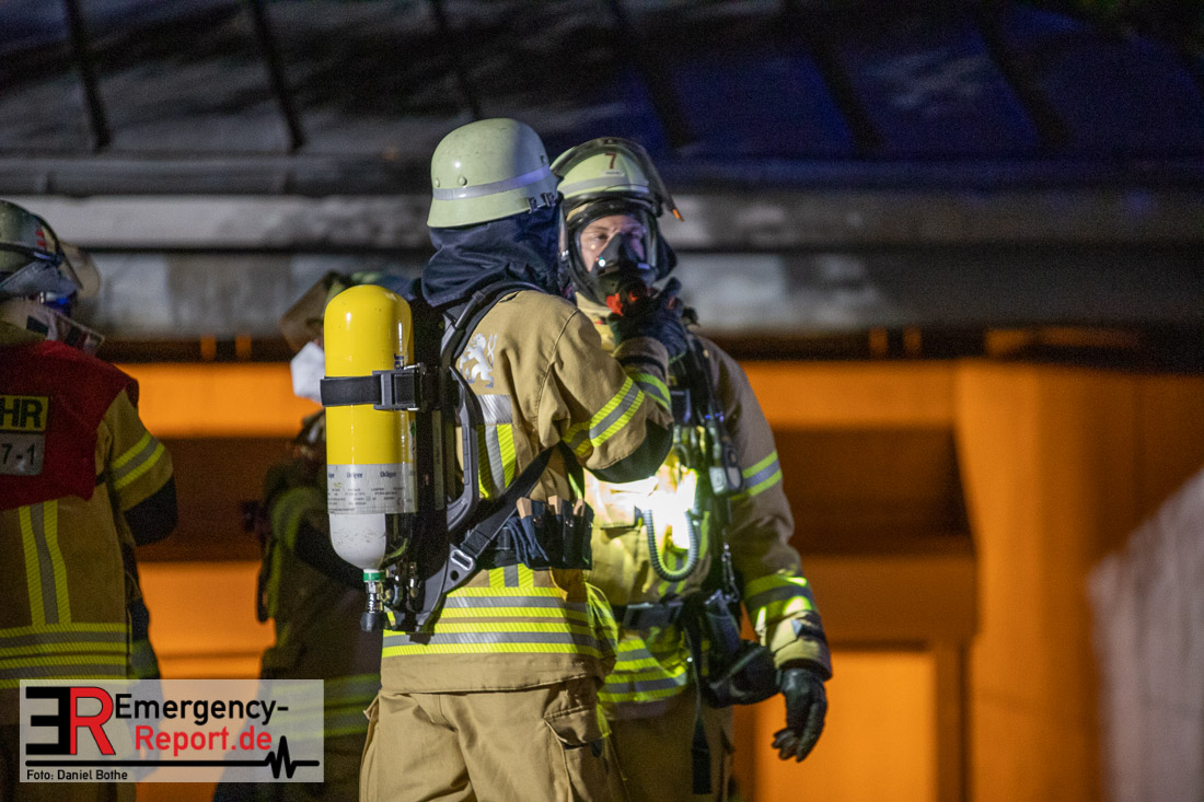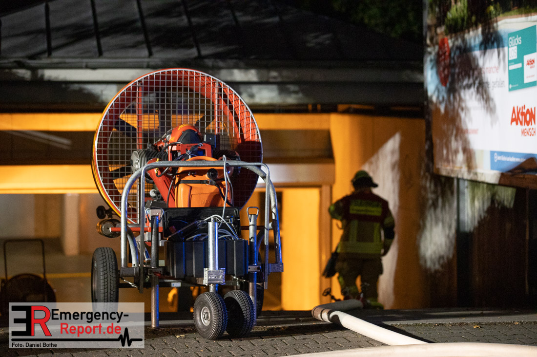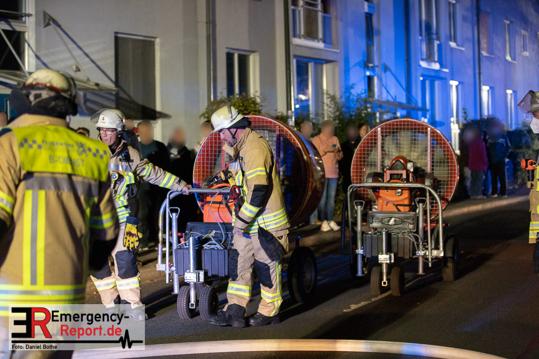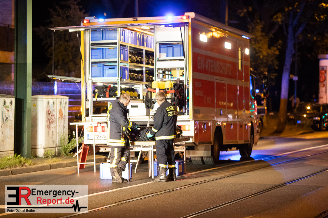 Als die ersten Feuerwehrkräfte der zuständigen Wache Werstener Feld nach sechs Minuten an der Einsatzstelle eintrafen, schlug ihnen bereits schwarzer Rauch aus der Tiefgaragenabfahrt entgegen. Ebenfalls hatte sich der Rauch über Abluftschächte der Tiefgarage im Innenhof des Wohnkomplexes ausgebreitet. Die Wohnungsfenster zum Innenhof waren bereits von den Bewohnern geschlossen worden, so daß kein Rauch in die Wohnungen eindringen konnte.