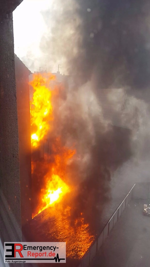 Beim Eintreffen der Feuerwehr brannte die Hausfassade im Innenhof – vom Erdgeschoss bis zum ausgebauten Dachstuhl. Die Flammen erreichten auch je eine angrenzende Wohnung im dritten und vierten Stock über die Balkone. Weiterhin war das Flachdach einer U-förmigen Einzelgaragenanlage und drei im Innenhof abgestellte Kleinkrafträder betroffen.