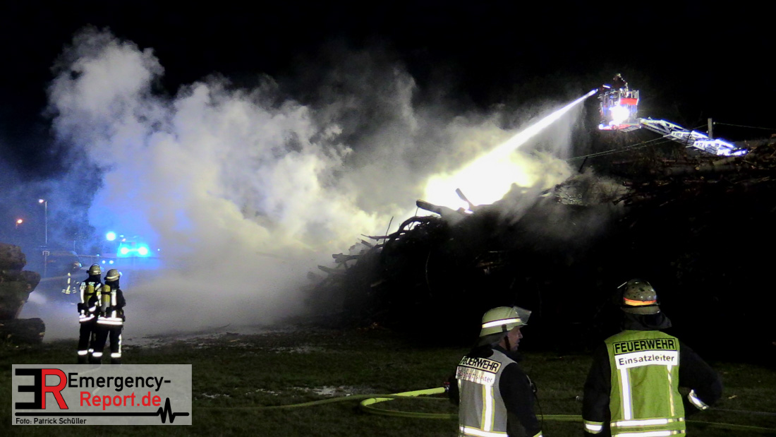 Zwei größere Brände in der Nacht (30.07.2020) beschäftigten die Feuerwehr über mehrere Stunden. Zunächst erreichten die Feuerwehrleitstelle mehrere Notrufe aus Flingern-Nord. Dort war im Bereich des Froschkönigweg Rauch und Feuerschein wahrnehmbar. Ca. drei Minuten später rückten die Einsatzkräfte der Feuerwache Werstener Feld zu einem Reifenbrand in die Harffstraße aus. Bei beiden Einsätzen waren keine Verletzen zu beklagen. Als die Einsatzkräfte der Feuerwache Behrenstraße an der Einsatzstelle in Flingern-Nord eintrafen, brannte ein Stapel von ca. 20 x 20 m gerodeter Baumstämme in voller Ausdehnung. Sofort wurden mehrere Strahlrohre und Wasserwerfer von Tanklöschfahrzeugen und Drehleitern eingesetzt um die Ausbreitung des Feuers zu verhindern. Im weiteren Verlauf des Einsatzes zog ein nachalarmiertes Baufahrzeug der Feuerwache Posenerstraße den Baumstapel auseinander um Glutnester abzulöschen. Ein in der Nähe abgestellter Anhänger wurde von der Hitze beschädigt. Zur Abklärung der Brandursache hat die Kriminalpolizei Ermittlungen aufgenommen. Der Sachschaden beläuft sich auf ca. 25.000 EUR. Der Einsatz war um ca. 06:30 Uhr beendet.