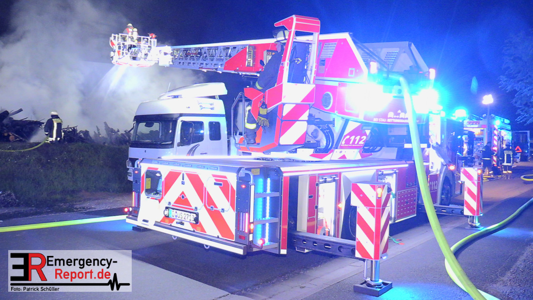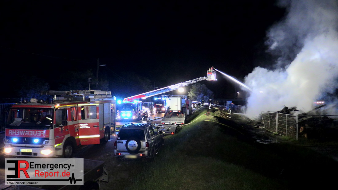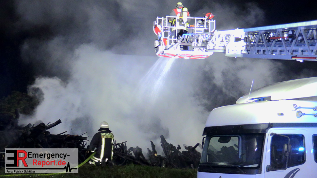Zwei größere Brände in der Nacht (30.07.2020) beschäftigten die Feuerwehr über mehrere Stunden. Zunächst erreichten die Feuerwehrleitstelle mehrere Notrufe aus Flingern-Nord. Dort war im Bereich des Froschkönigweg Rauch und Feuerschein wahrnehmbar. Ca. drei Minuten später rückten die Einsatzkräfte der Feuerwache Werstener Feld zu einem Reifenbrand in die Harffstraße aus. Bei beiden Einsätzen waren keine Verletzen zu beklagen. Als die Einsatzkräfte der Feuerwache Behrenstraße an der Einsatzstelle in Flingern-Nord eintrafen, brannte ein Stapel von ca. 20 x 20 m gerodeter Baumstämme in voller Ausdehnung. Sofort wurden mehrere Strahlrohre und Wasserwerfer von Tanklöschfahrzeugen und Drehleitern eingesetzt um die Ausbreitung des Feuers zu verhindern. Im weiteren Verlauf des Einsatzes zog ein nachalarmiertes Baufahrzeug der Feuerwache Posenerstraße den Baumstapel auseinander um Glutnester abzulöschen. Ein in der Nähe abgestellter Anhänger wurde von der Hitze beschädigt. Zur Abklärung der Brandursache hat die Kriminalpolizei Ermittlungen aufgenommen. Der Sachschaden beläuft sich auf ca. 25.000 EUR. Der Einsatz war um ca. 06:30 Uhr beendet.