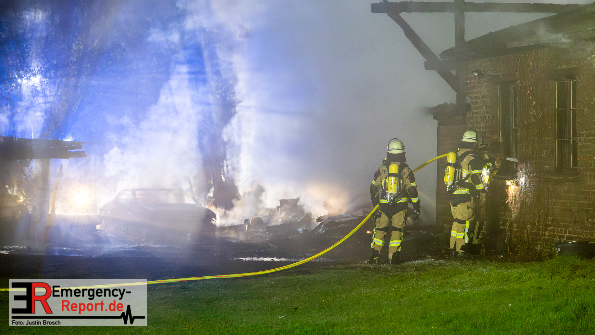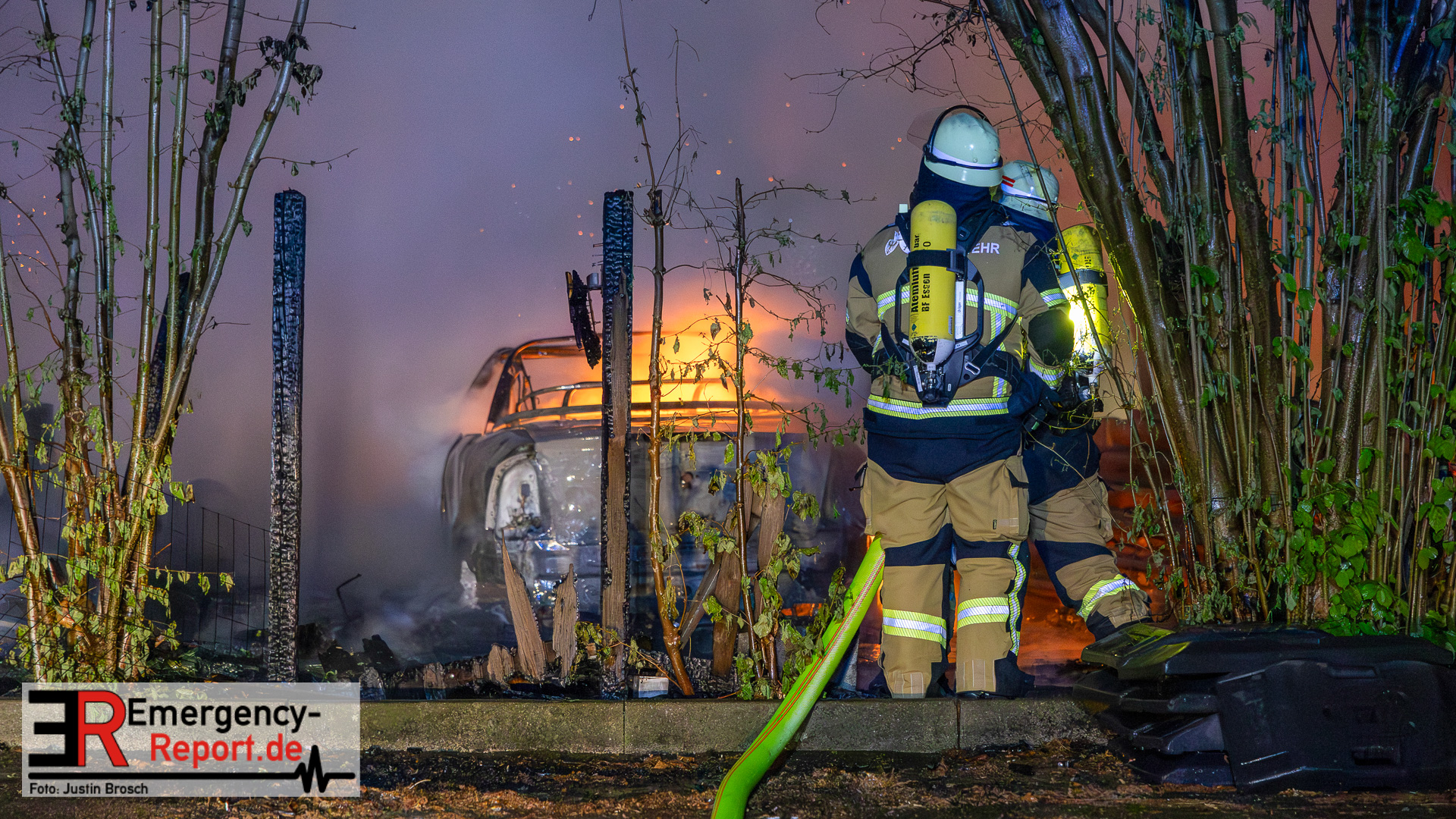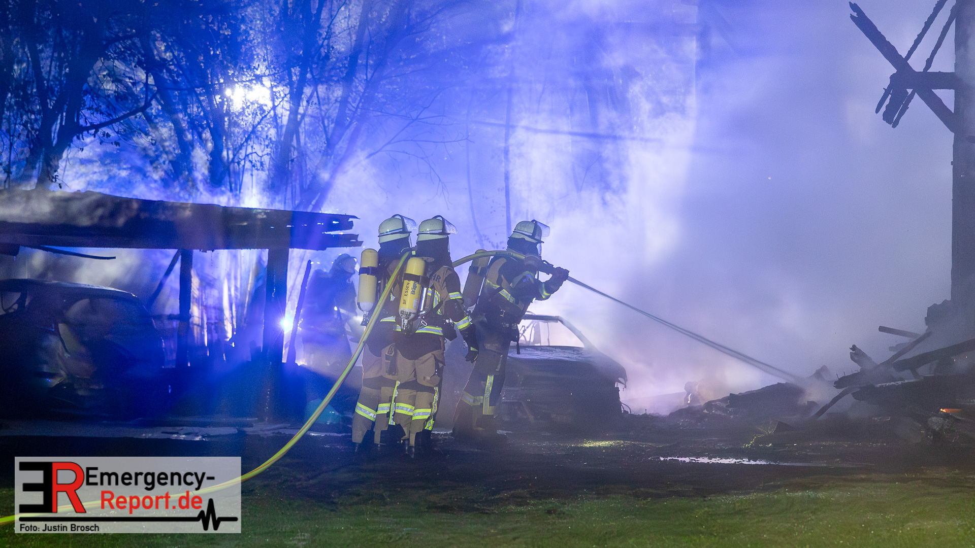 Beim Eintreffen der ersten Kräfte brannte ein großer Holzunterstand bereits in voller Ausdehnung. Das Feuer hatte sich zudem auf angrenzende Carports sowie mehrere dort abgestellte Fahrzeuge ausgebreitet. Aufgrund der Lage wurde das Einsatzstichwort erhöht und weitere Einsatzkräfte zur Einsatzstelle entsandt.