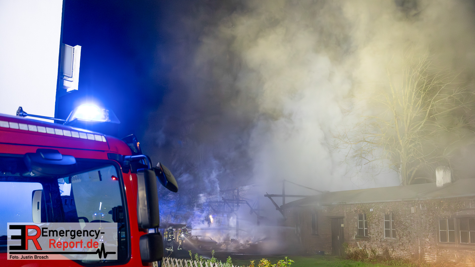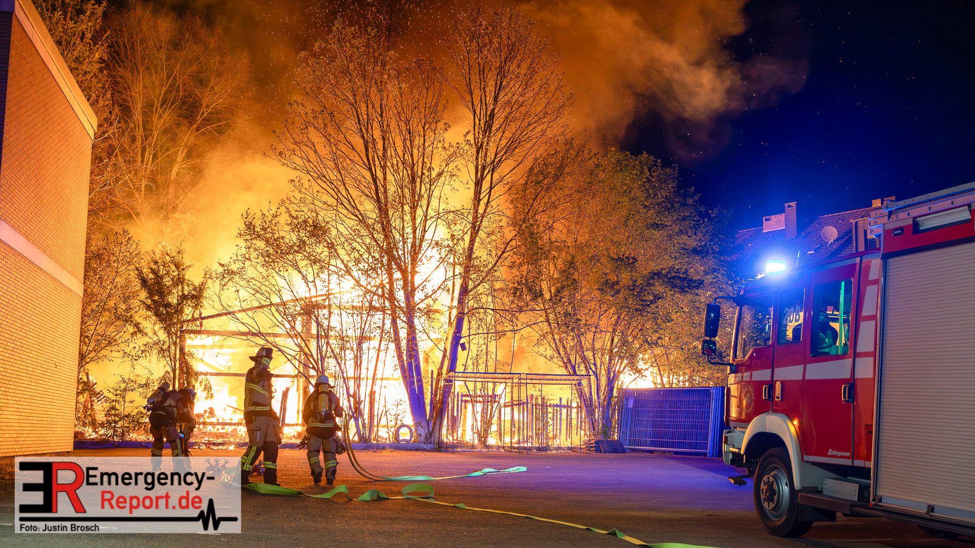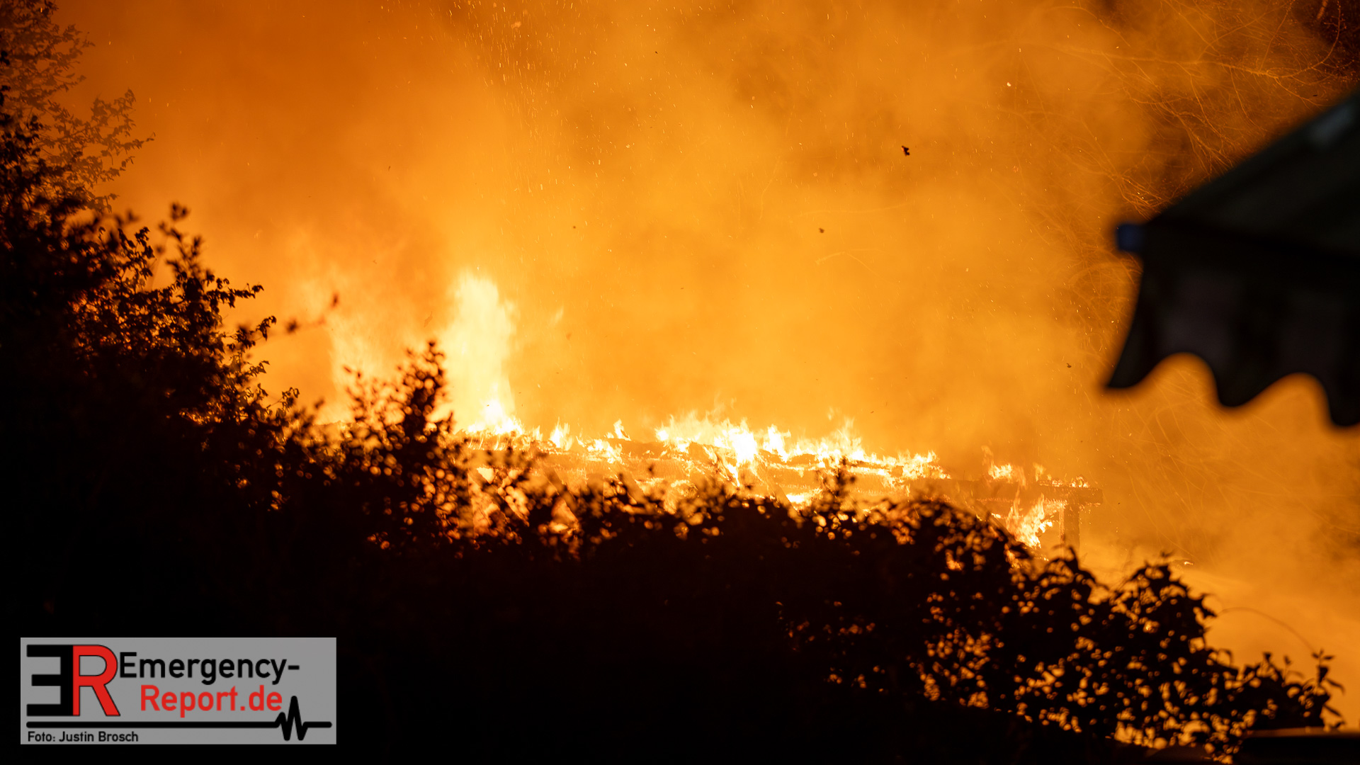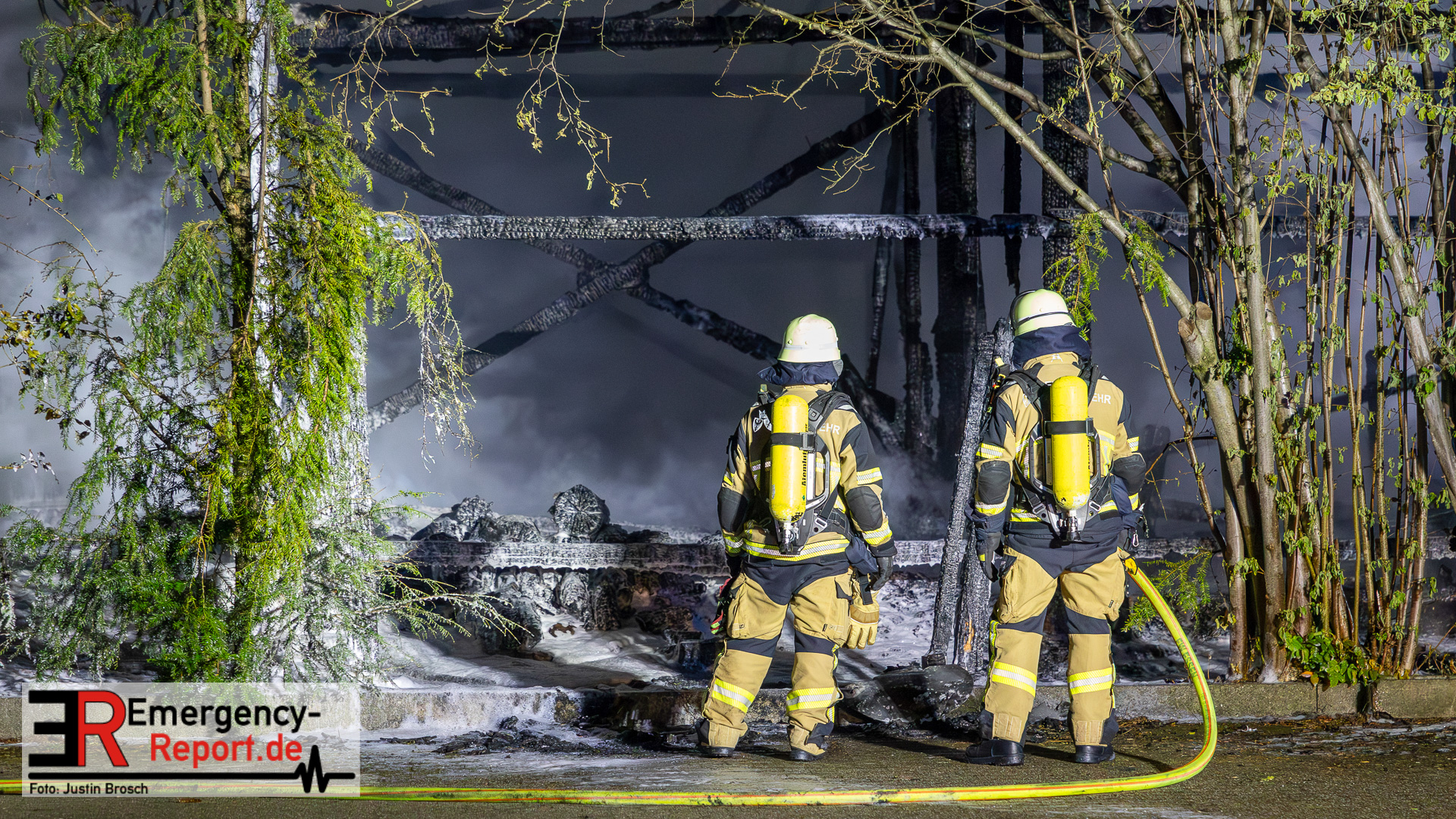 Beim Eintreffen der ersten Kräfte brannte ein großer Holzunterstand bereits in voller Ausdehnung. Das Feuer hatte sich zudem auf angrenzende Carports sowie mehrere dort abgestellte Fahrzeuge ausgebreitet. Aufgrund der Lage wurde das Einsatzstichwort erhöht und weitere Einsatzkräfte zur Einsatzstelle entsandt.
