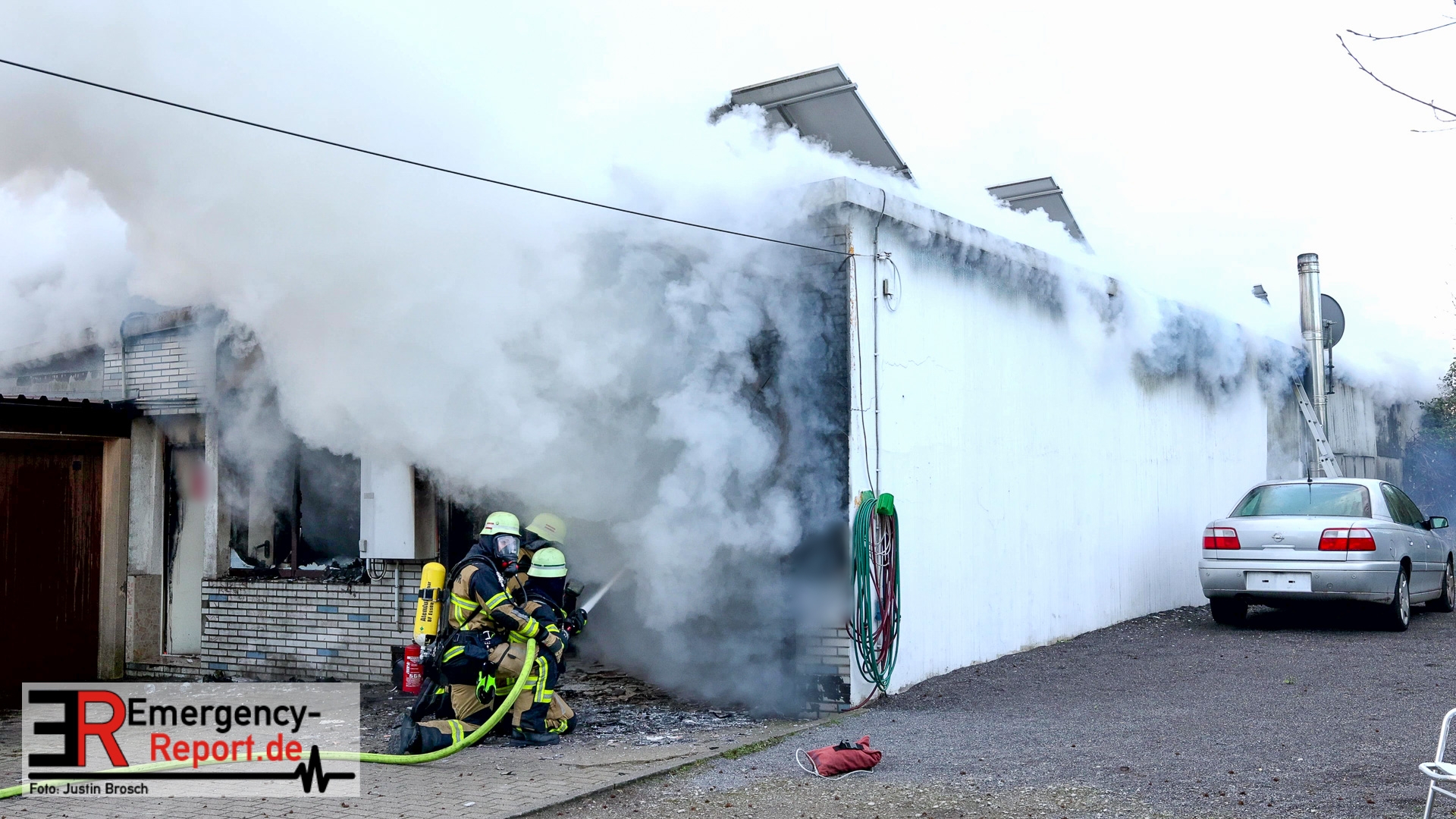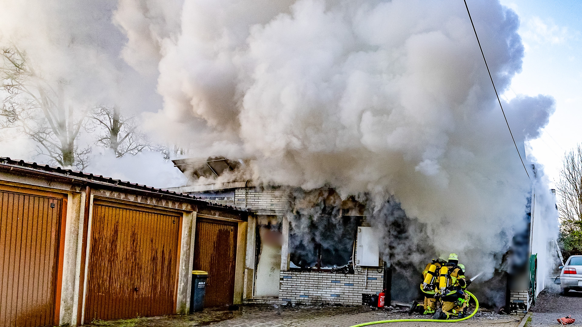 Die Feuerwehr leitete umgehend eine Brandbekämpfung mit mehreren handgeführten Strahlrohren im Außenangriff ein. Parallel wurde eine Riegelstellung aufgebaut, um ein Übergreifen der Flammen auf angrenzende Gebäude und Garagen zu verhindern.