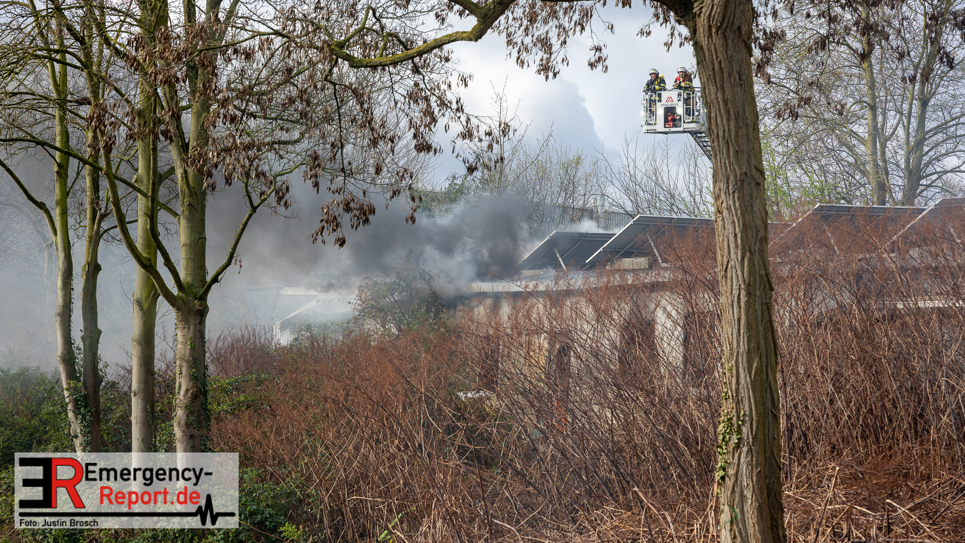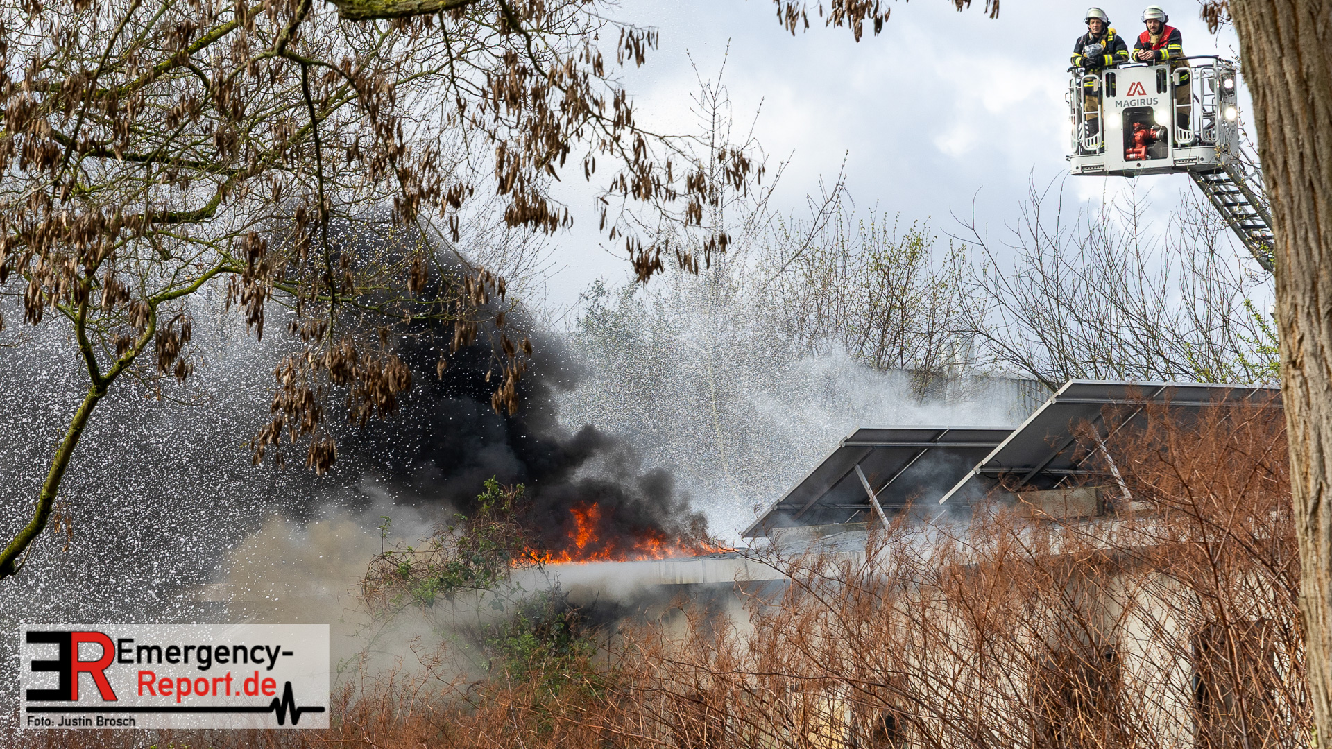 Die Löschmaßnahmen gestalteten sich aufgrund der intensiven Brandentwicklung als aufwendig. In der Spitze waren drei Löschzüge der Berufsfeuerwehr im Einsatz. Nach rund drei Stunden konnte der Brand unter Kontrolle gebracht werden. Ein Übergreifen auf benachbarte Gebäude wurde erfolgreich verhindert.