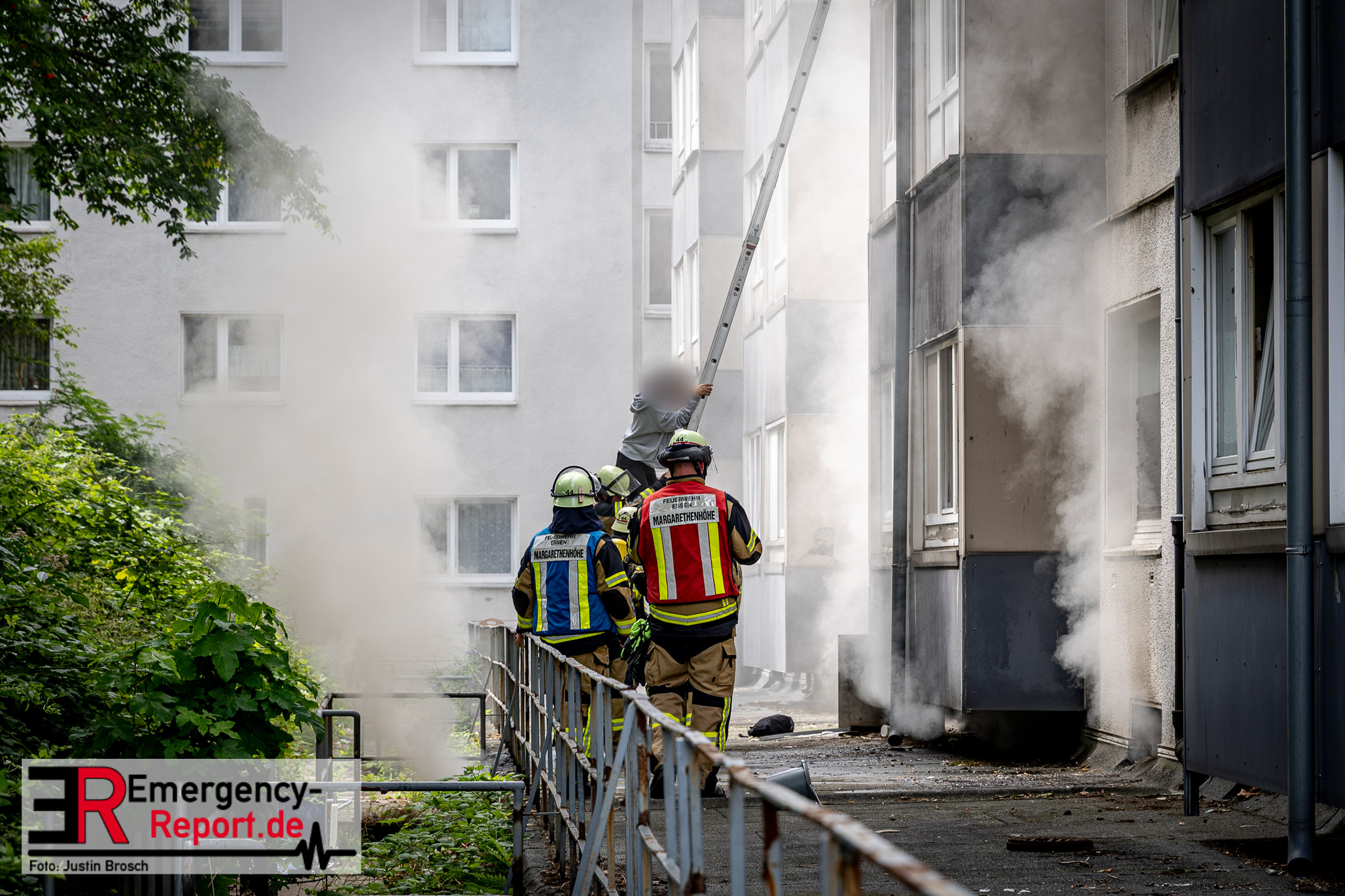 Beim Eintreffen der ersten Kräfte bestätigte sich die dramatische Lage: Aus dem Keller drang dichter Rauch, der Treppenraum war bereits vollständig verraucht. Die Bewohnerinnen und Bewohner konnten das Gebäude nicht mehr über den Treppenraum verlassen und machten sich an den Fenstern bemerkbar.