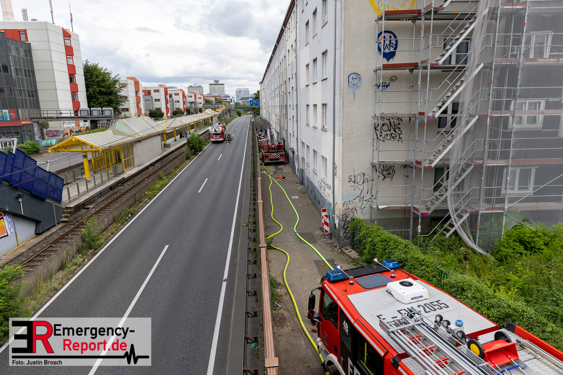 Besonders aufwändig gestaltete sich die Rettung der eingeschlossenen Personen. Das Haus liegt unmittelbar an der Bundesautobahn A 40, direkt vor einer hohen Schallschutzwand. Die Platzverhältnisse waren extrem beengt. Eine der Drehleitern musste äußerst präzise zwischen Gebäude und Schallschutzwand positioniert werden. Dies war eine anspruchsvolle Aufgabe, die nur mit viel Erfahrung und Fingerspitzengefühl zu bewältigen war. Eine weitere Drehleiter musste auf der Fahrbahn der Autobahn in Stellung gebracht werden. Hierzu musste die A 40 in Fahrtrichtung Bochum gesperrt werden.