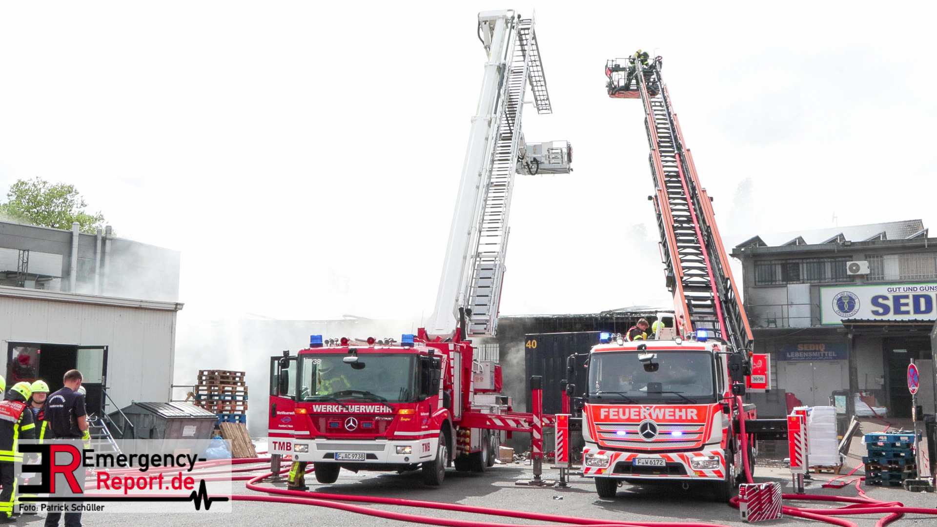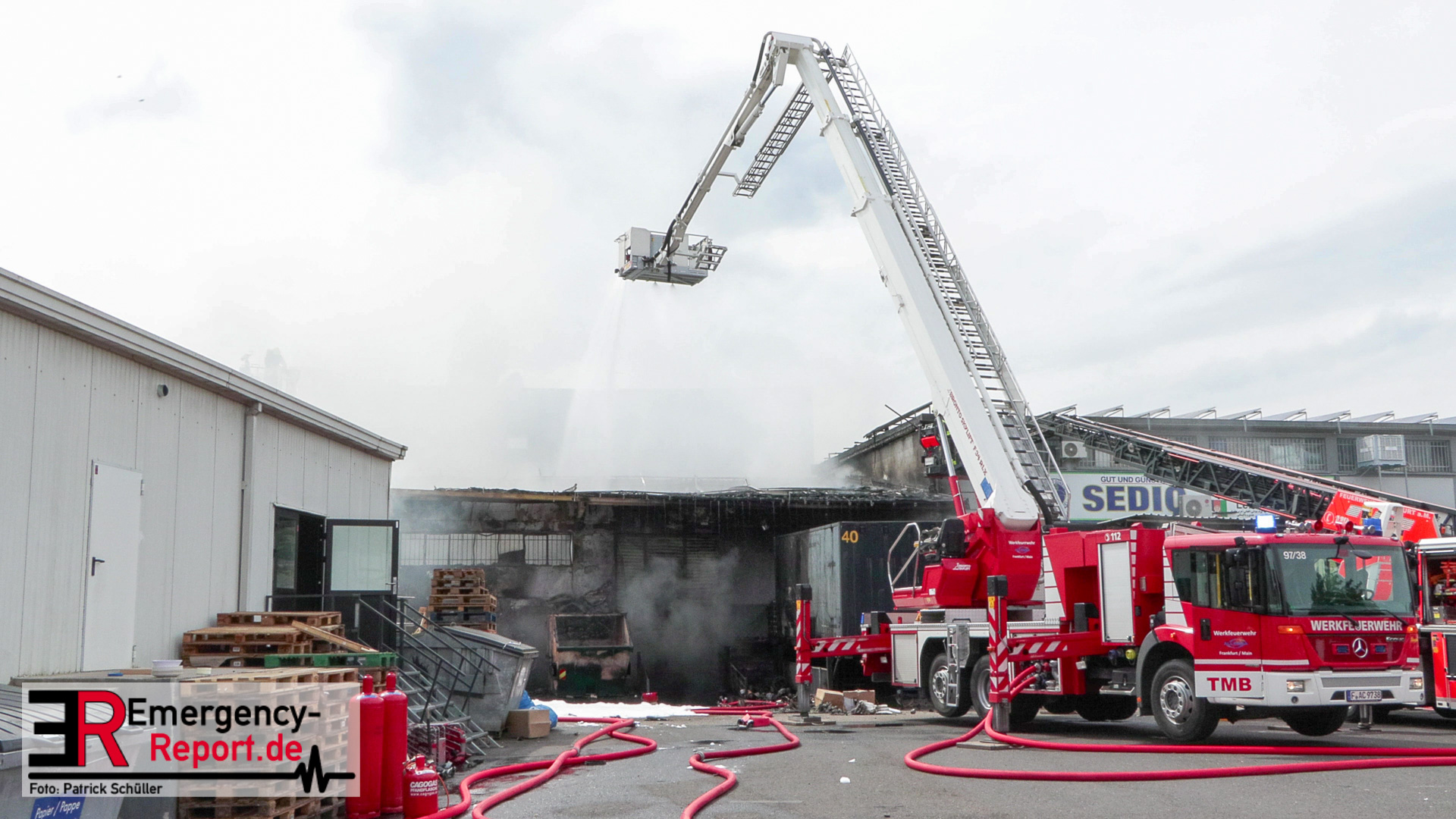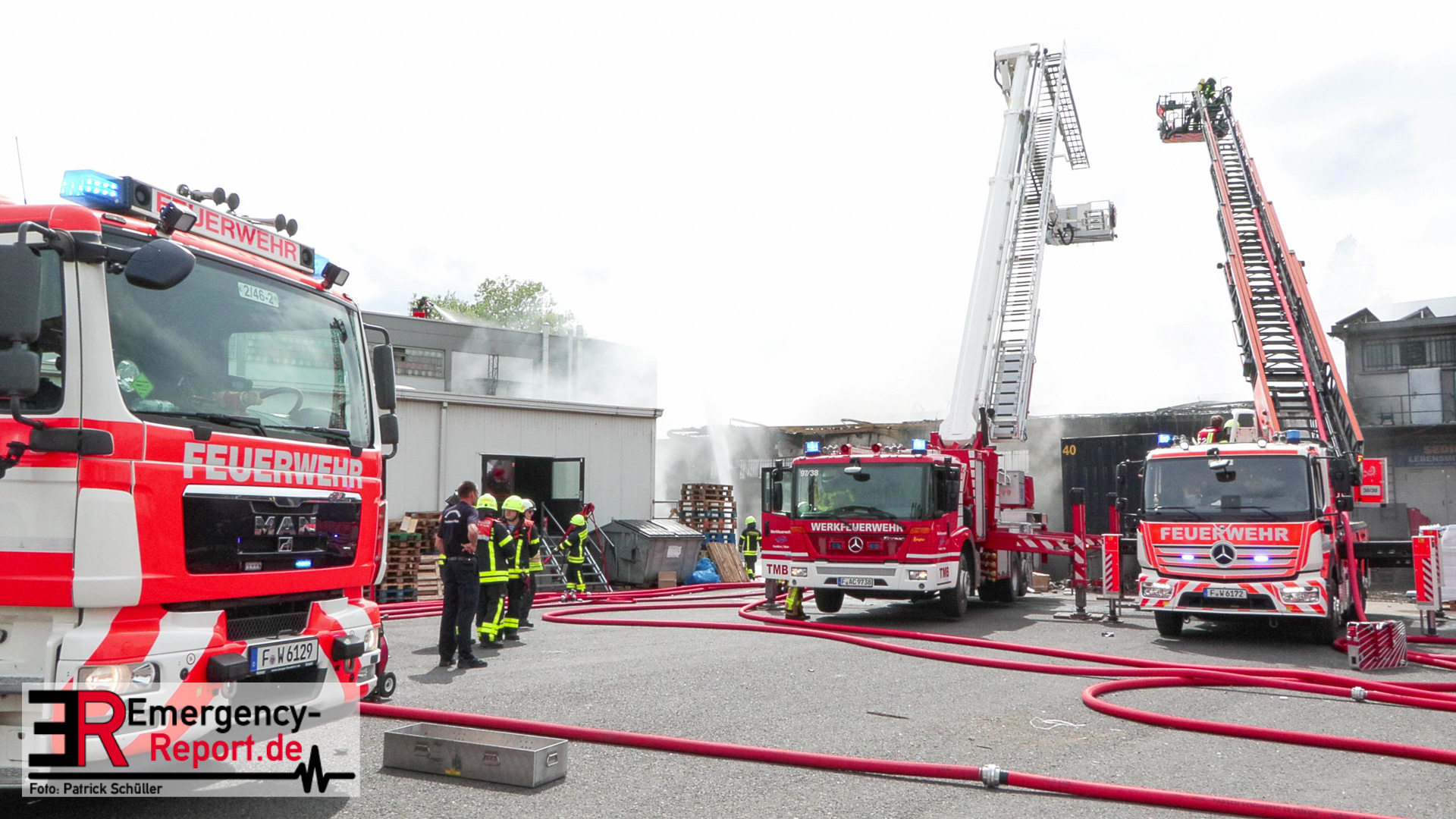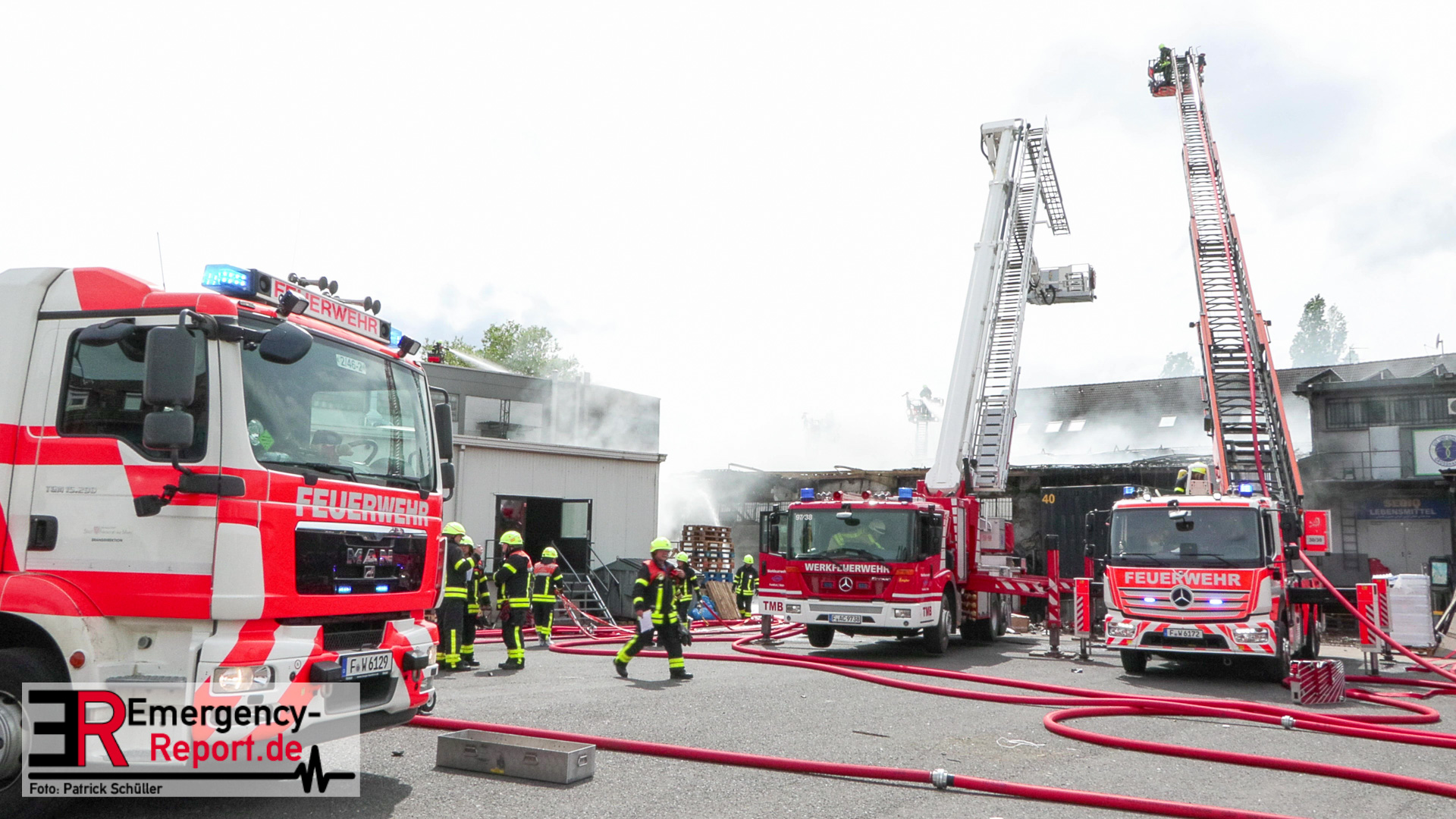 Gegen 13:00 Uhr (04.05.2024) erreichten viele Notrufe die Leitstelle der Feuerwehr Frankfurt am Main. Zahlreiche Menschen meldeten Flammen und Rauch aus einer Lagerhalle in der Lärchenstraße. Sofort wurde Großalarm für die Berufsfeuerwehr und die Freiwilligen Feuerwehren ausgelöst.