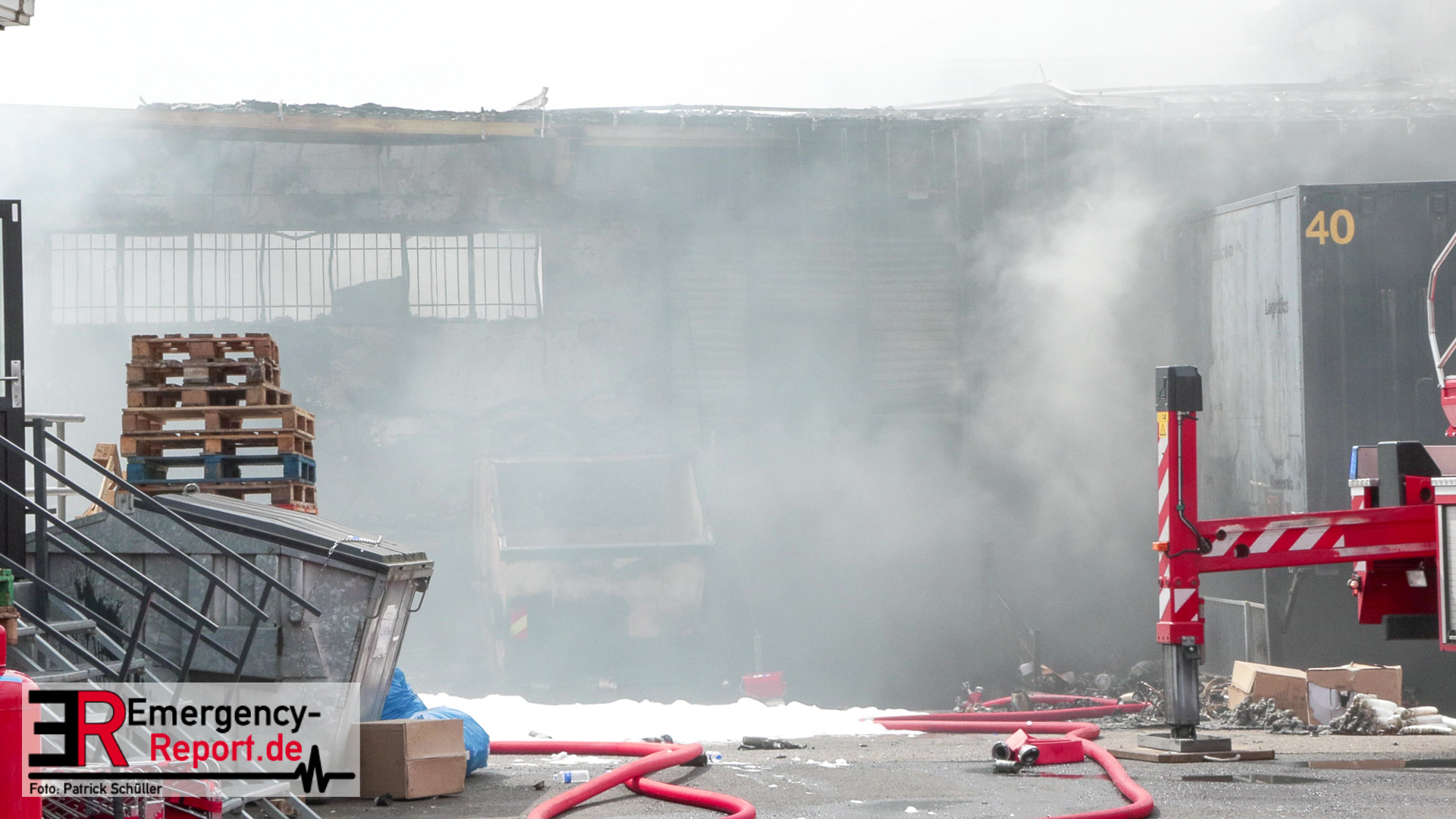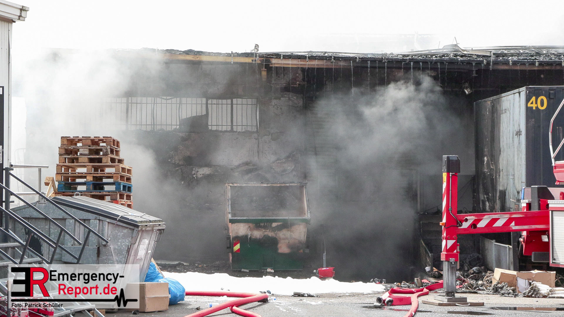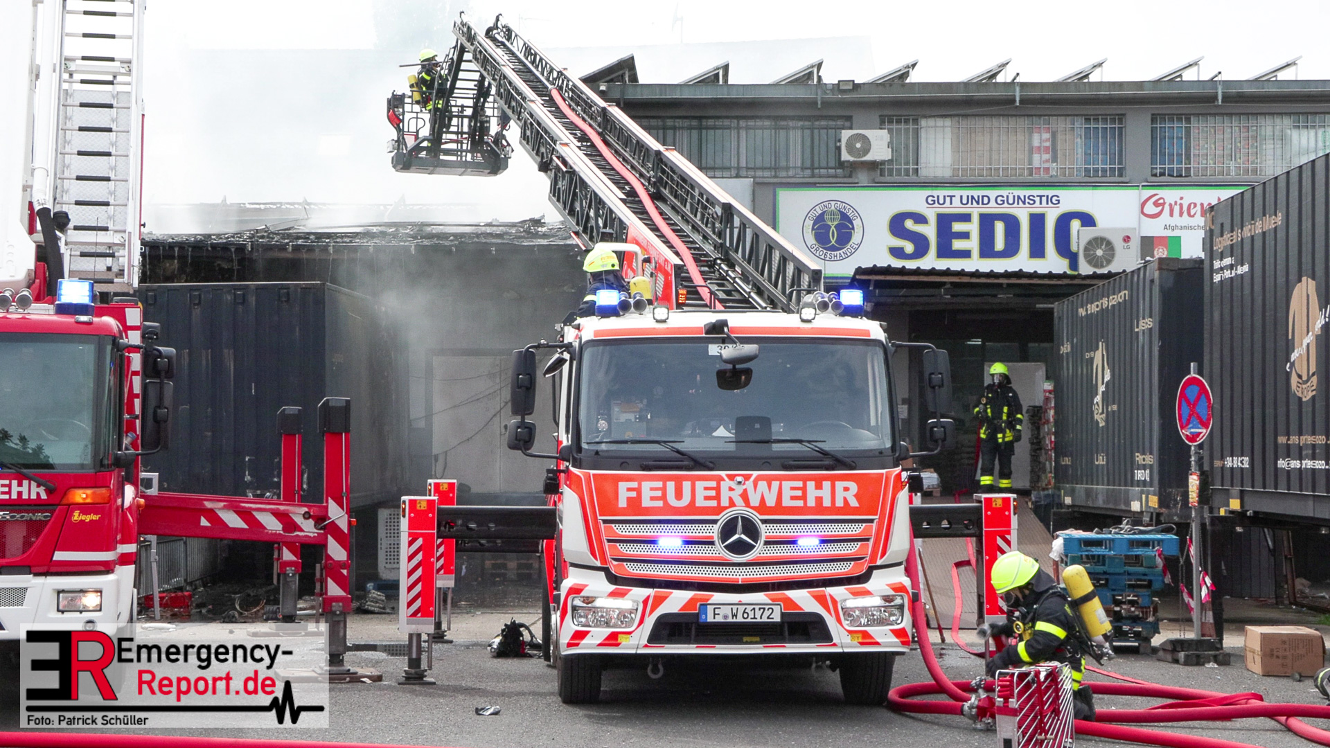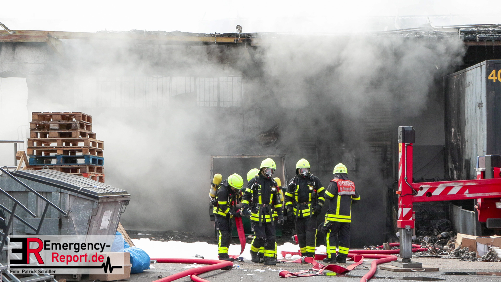 Gegen 13:00 Uhr (04.05.2024) erreichten viele Notrufe die Leitstelle der Feuerwehr Frankfurt am Main. Zahlreiche Menschen meldeten Flammen und Rauch aus einer Lagerhalle in der Lärchenstraße. Sofort wurde Großalarm für die Berufsfeuerwehr und die Freiwilligen Feuerwehren ausgelöst.