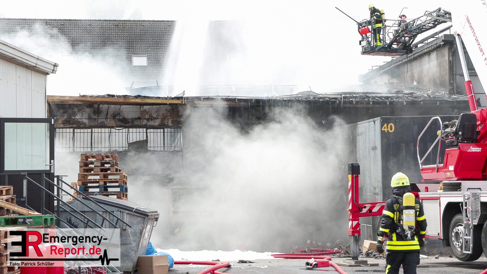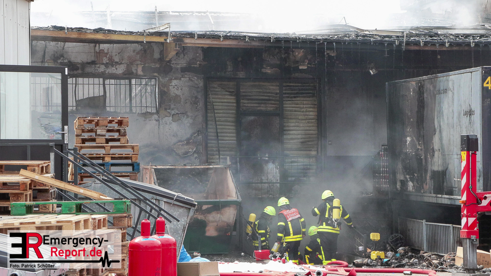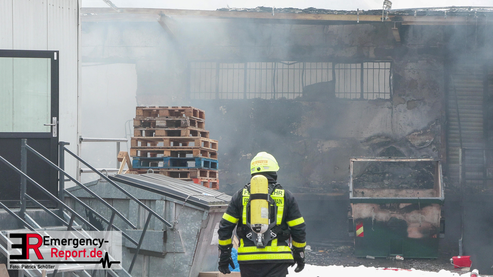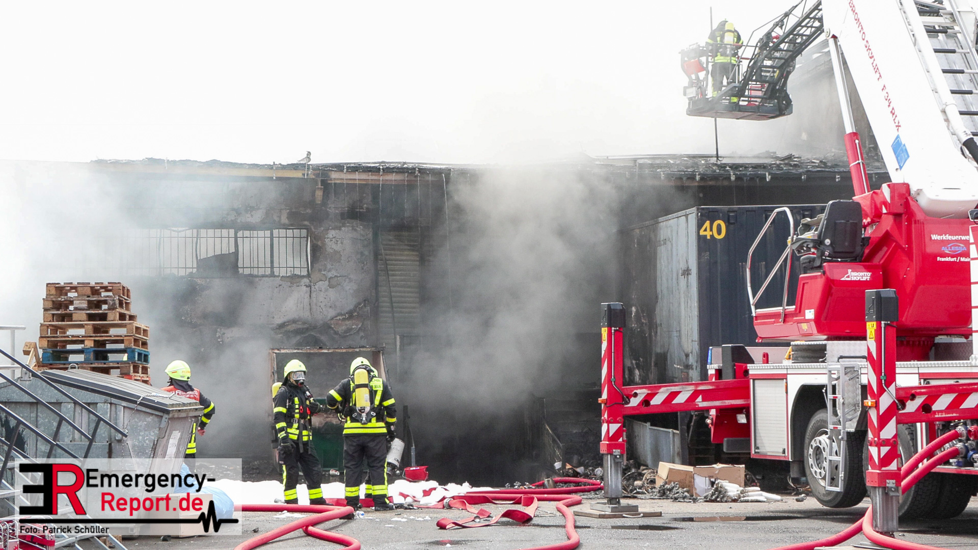 Den eintreffenden Einheiten bot sich folgendes Bild: Flammen und tiefschwarzer Rauch hatten die Lagerhalle bereits fest im Griff. Die Rauchwolke war von verschiedenen Orten aus deutlich zu sehen. Es wurden umgehend Löschmaßnahmen mit mehreren Wasserwerfern eingeleitet. Ebenfalls wurde Wasser von vier Drehleitern auf den Brand abgegeben. Weitere Einheiten mussten nachalarmiert werden, um die Lage in den Griff zu bekommen. Unter anderem kamen spezielle Einheiten der Freiwilligen Feuerwehr zum Einsatz, um den hohen Bedarf an Löschwasser zu decken. Unter anderem wurde Wasser aus dem Main entnommen und zur Einsatzstelle gefördert. Die Werkfeuerwehr Allessa Chemie aus Fechenheim unterstützte die Löscharbeiten mit einem sogenannten „Teleskopmastfahrzeug“. Gelagerte Spraydosen und Gasflaschen sorgten immer wieder für Knallgeräusche und mussten durch die Einsatzkräfte gekühlt werden. Die Feuerwehr versendete eine Gefahrenmeldung über Warnapps, um die Bevölkerung in der Nachbarschaft der Lagerhalle vor dem Brandrauch zu warnen. Im Verlauf des Einsatzes erfolgten in anliegenden Stadtteilen Messungen der Luft. Gesundheitsschädliche Schadstoffkonzentrationen wurden nicht festgestellt. Zwei Personen wurden im späteren Einsatzverlauf mit Rauchgasvergiftung durch den Rettungsdienst behandelt und in eine Klinik gebracht. Zur Brandbekämpfung in den Schutthaufen und im Kellerbereich musste mit Löschschaum vorgegangen werden. Da die Einsatzkräfte sich vor den Rauchgasen schützen mussten, wurden über 50 Atemschutzgeräte während es Einsatzes verbraucht. Vor Ort waren etliche Wachen der Berufsfeuerwehr und Kräfte der Freiwilligen Feuerwehren Frankfurt. Insgesamt arbeiteten an der Einsatzstelle ca. 150 Einsatzkräfte. Gegen 18 Uhr waren die Brandbekämpfungsmaßnahmen abgeschlossen. Der Sachschaden wird auf eine Summe von 2-3 Mio. Euro geschätzt. Die Brandursachenermittlung wurde von der Kriminalpolizei aufgenommen.