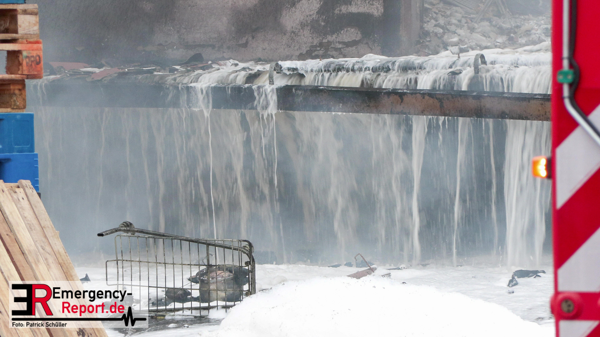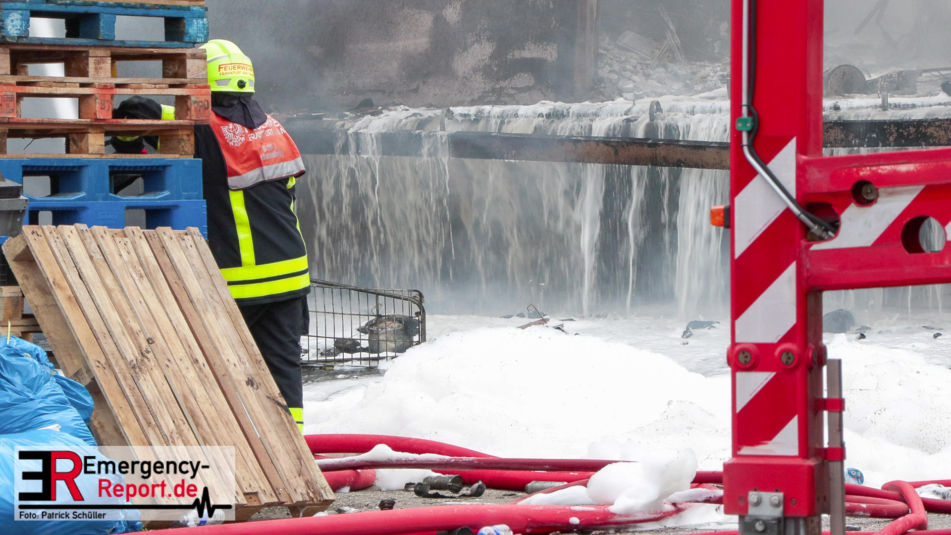 Den eintreffenden Einheiten bot sich folgendes Bild: Flammen und tiefschwarzer Rauch hatten die Lagerhalle bereits fest im Griff. Die Rauchwolke war von verschiedenen Orten aus deutlich zu sehen. Es wurden umgehend Löschmaßnahmen mit mehreren Wasserwerfern eingeleitet. Ebenfalls wurde Wasser von vier Drehleitern auf den Brand abgegeben. Weitere Einheiten mussten nachalarmiert werden, um die Lage in den Griff zu bekommen. Unter anderem kamen spezielle Einheiten der Freiwilligen Feuerwehr zum Einsatz, um den hohen Bedarf an Löschwasser zu decken. Unter anderem wurde Wasser aus dem Main entnommen und zur Einsatzstelle gefördert. Die Werkfeuerwehr Allessa Chemie aus Fechenheim unterstützte die Löscharbeiten mit einem sogenannten „Teleskopmastfahrzeug“. Gelagerte Spraydosen und Gasflaschen sorgten immer wieder für Knallgeräusche und mussten durch die Einsatzkräfte gekühlt werden. Die Feuerwehr versendete eine Gefahrenmeldung über Warnapps, um die Bevölkerung in der Nachbarschaft der Lagerhalle vor dem Brandrauch zu warnen. Im Verlauf des Einsatzes erfolgten in anliegenden Stadtteilen Messungen der Luft. Gesundheitsschädliche Schadstoffkonzentrationen wurden nicht festgestellt. Zwei Personen wurden im späteren Einsatzverlauf mit Rauchgasvergiftung durch den Rettungsdienst behandelt und in eine Klinik gebracht. Zur Brandbekämpfung in den Schutthaufen und im Kellerbereich musste mit Löschschaum vorgegangen werden. Da die Einsatzkräfte sich vor den Rauchgasen schützen mussten, wurden über 50 Atemschutzgeräte während es Einsatzes verbraucht. Vor Ort waren etliche Wachen der Berufsfeuerwehr und Kräfte der Freiwilligen Feuerwehren Frankfurt. Insgesamt arbeiteten an der Einsatzstelle ca. 150 Einsatzkräfte. Gegen 18 Uhr waren die Brandbekämpfungsmaßnahmen abgeschlossen. Der Sachschaden wird auf eine Summe von 2-3 Mio. Euro geschätzt. Die Brandursachenermittlung wurde von der Kriminalpolizei aufgenommen.