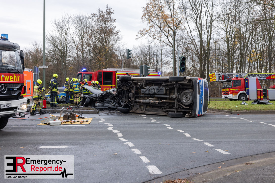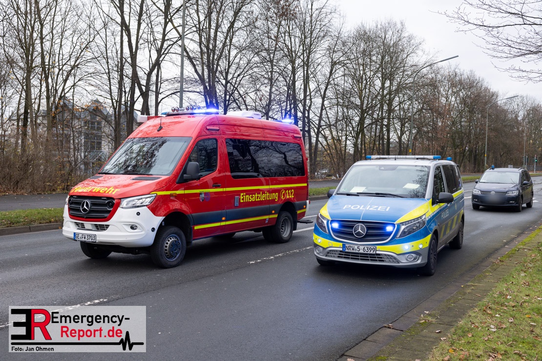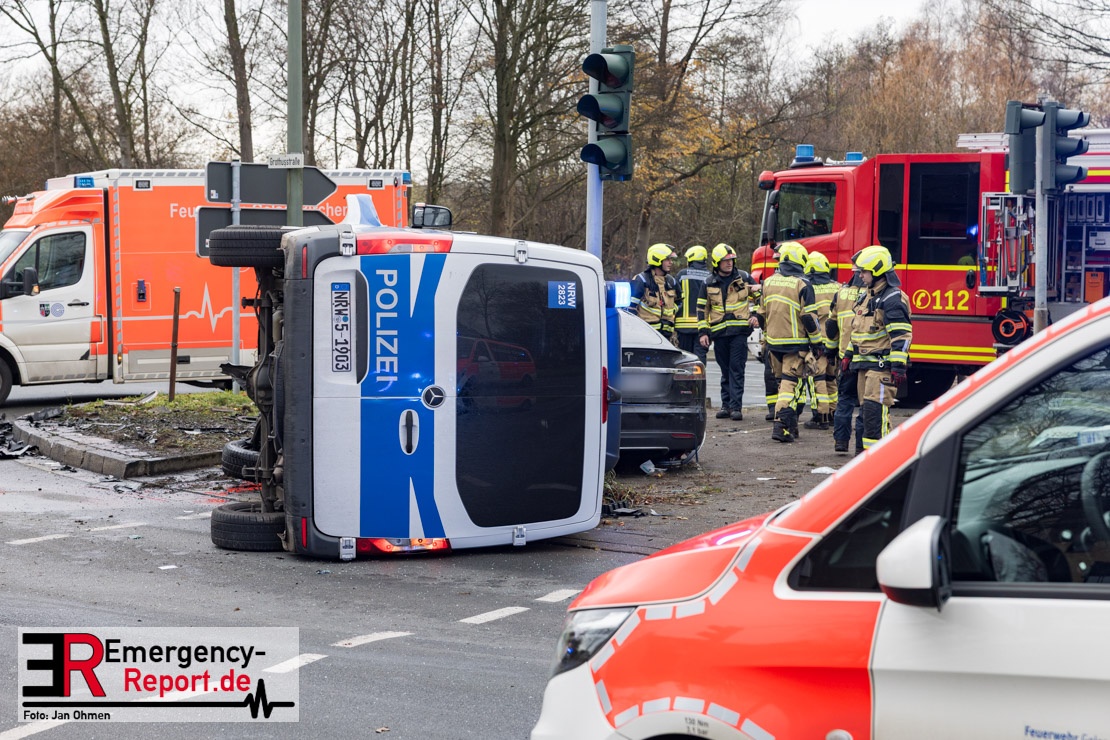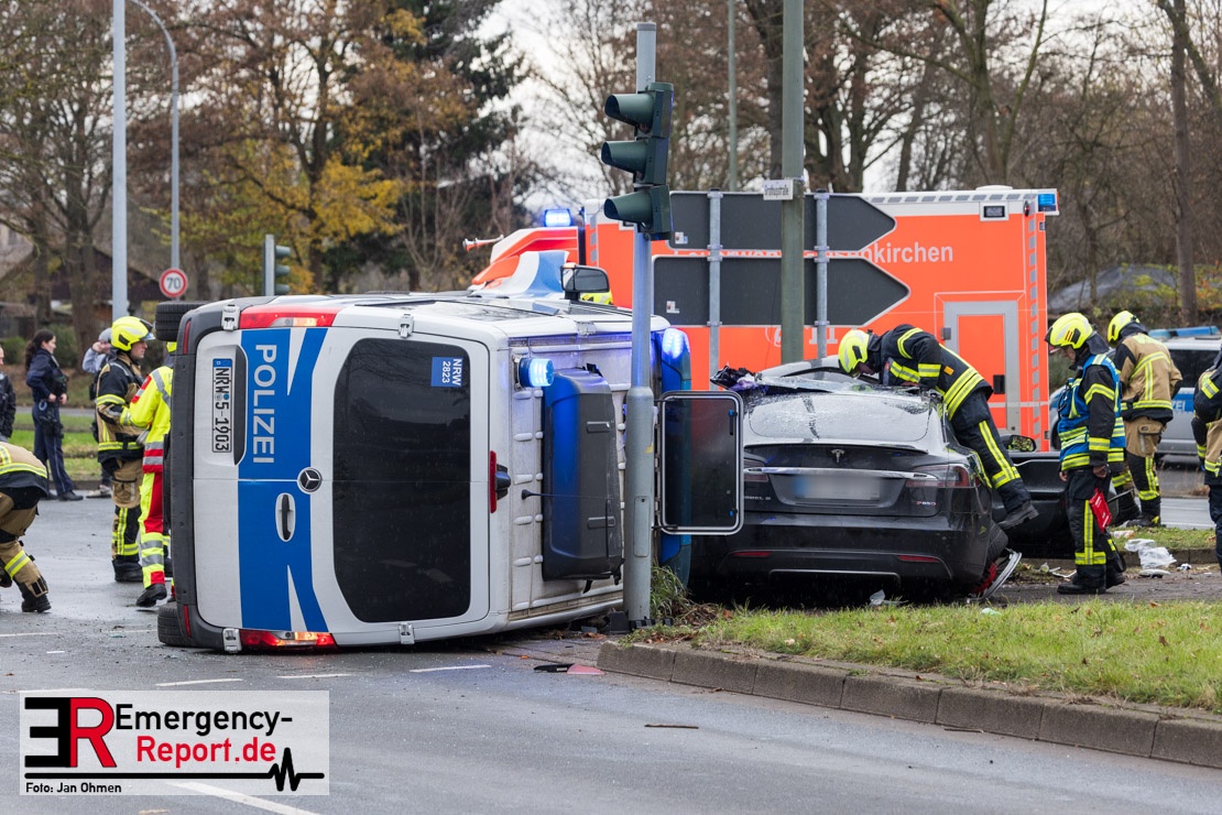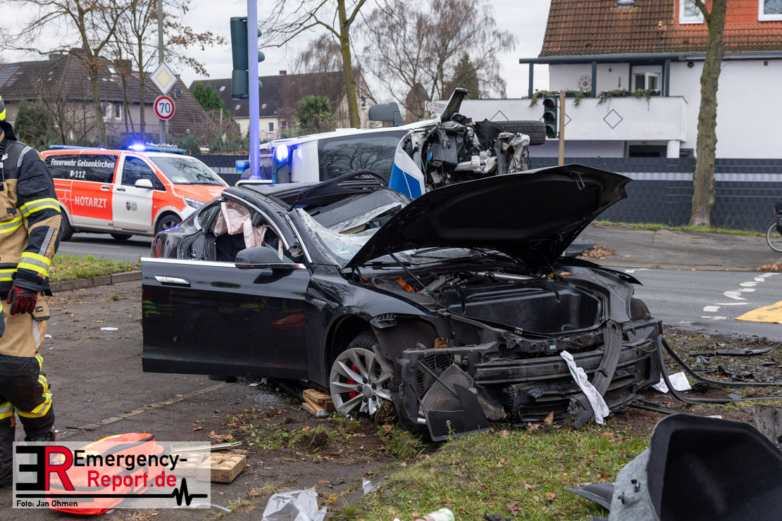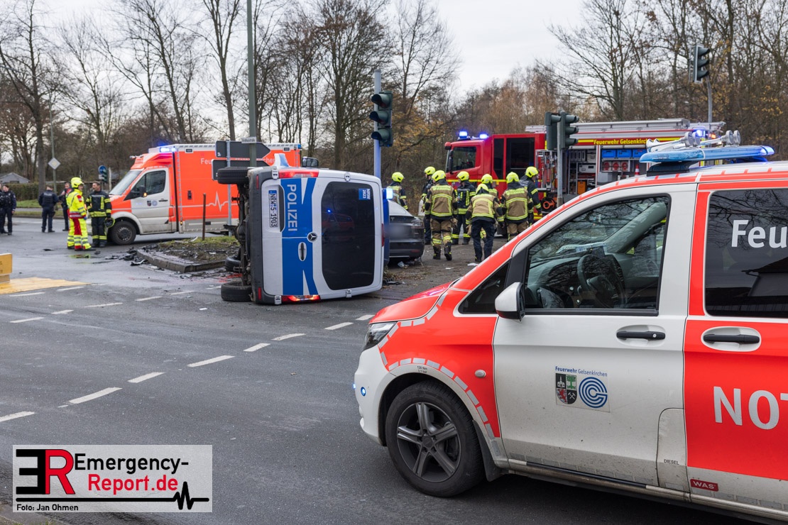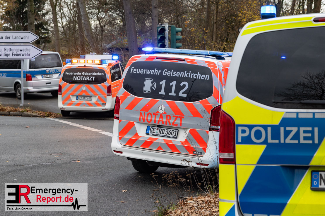 Erstmeldung: An der Kreuzung von Grothusstraße und „An der Landwehr“ sind am Mittwoch (3. Dezember 2025) in Gelsenkirchen ein Einsatzfahrzeug der Polizei und ein Pkw miteinander kollidiert. Gegen 10:15 Uhr hatte der Transporter mit drei Polizeibeamten die Kreuzung überquert und war beim Zusammenprall mit dem Pkw auf die Seite geschleudert worden. Nach aktuellem Stand wurden die drei Beamten verletzt, für den 52-jährigen Fahrer des Pkw besteht derzeit Lebensgefahr.