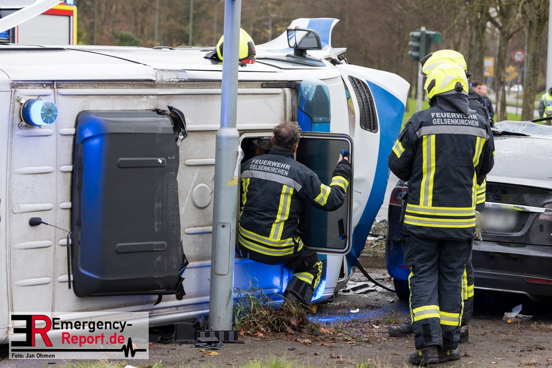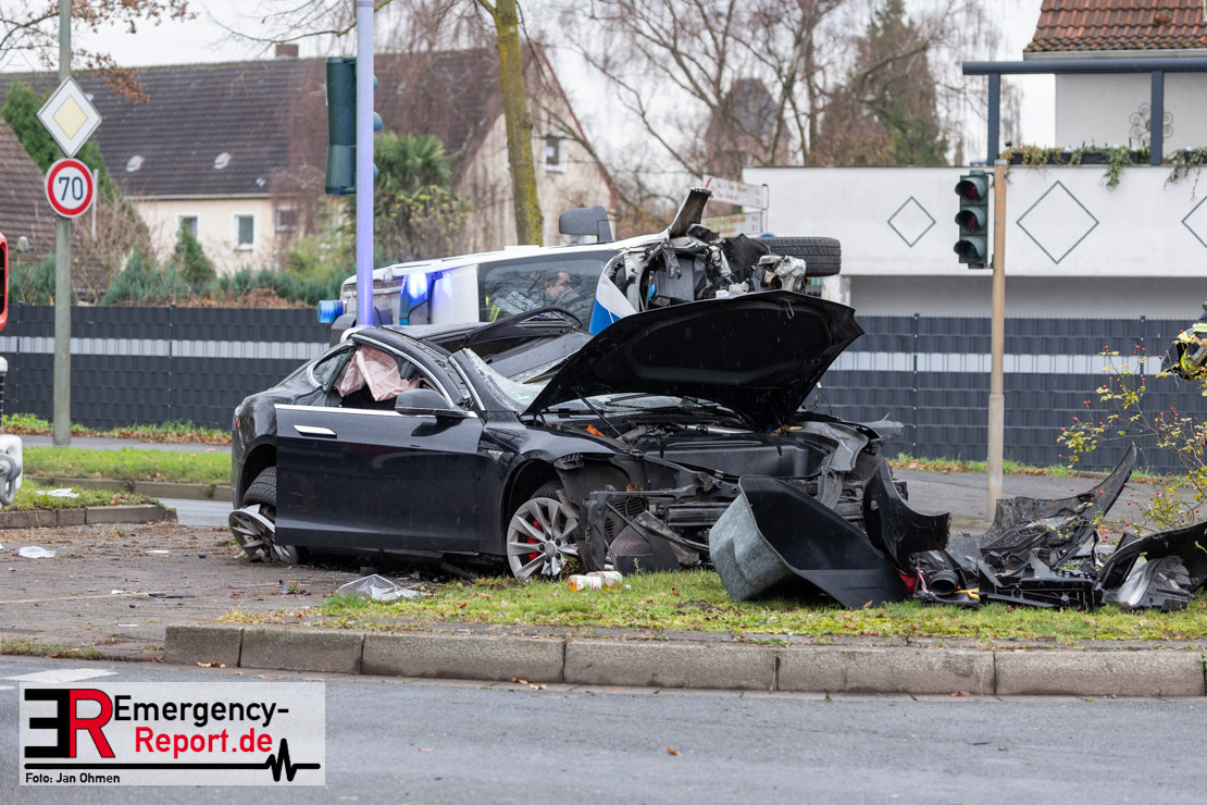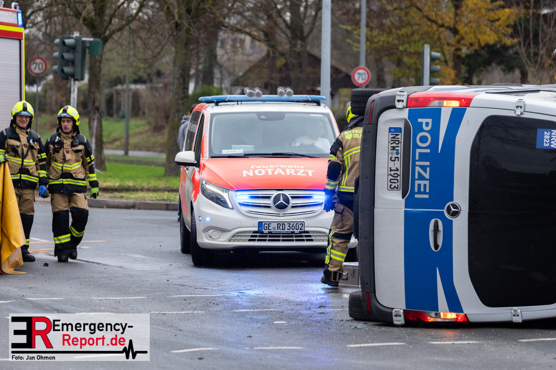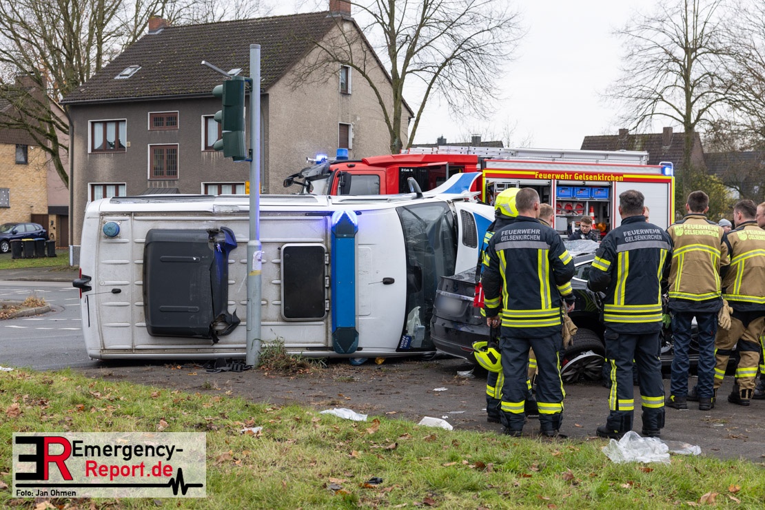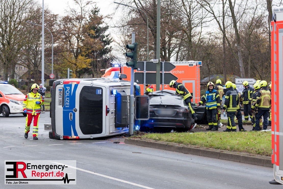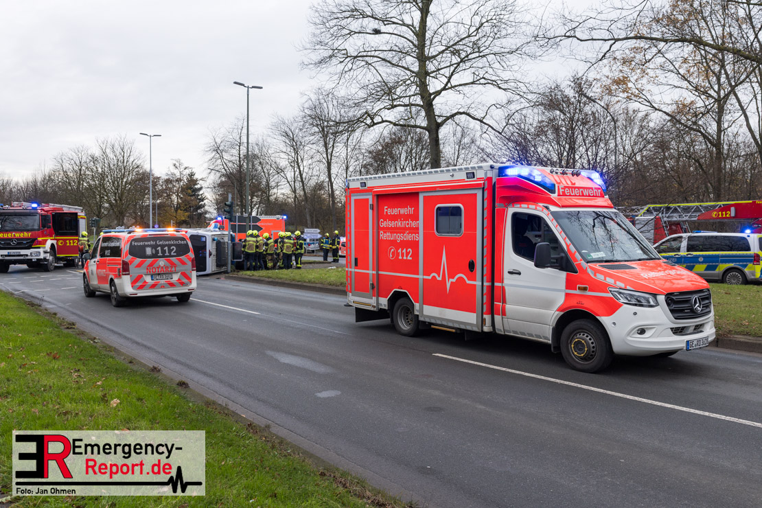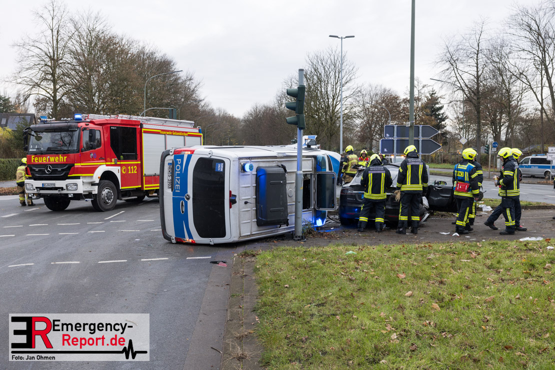 Erstmeldung: An der Kreuzung von Grothusstraße und „An der Landwehr“ sind am Mittwoch (3. Dezember 2025) in Gelsenkirchen ein Einsatzfahrzeug der Polizei und ein Pkw miteinander kollidiert. Gegen 10:15 Uhr hatte der Transporter mit drei Polizeibeamten die Kreuzung überquert und war beim Zusammenprall mit dem Pkw auf die Seite geschleudert worden. Nach aktuellem Stand wurden die drei Beamten verletzt, für den 52-jährigen Fahrer des Pkw besteht derzeit Lebensgefahr.